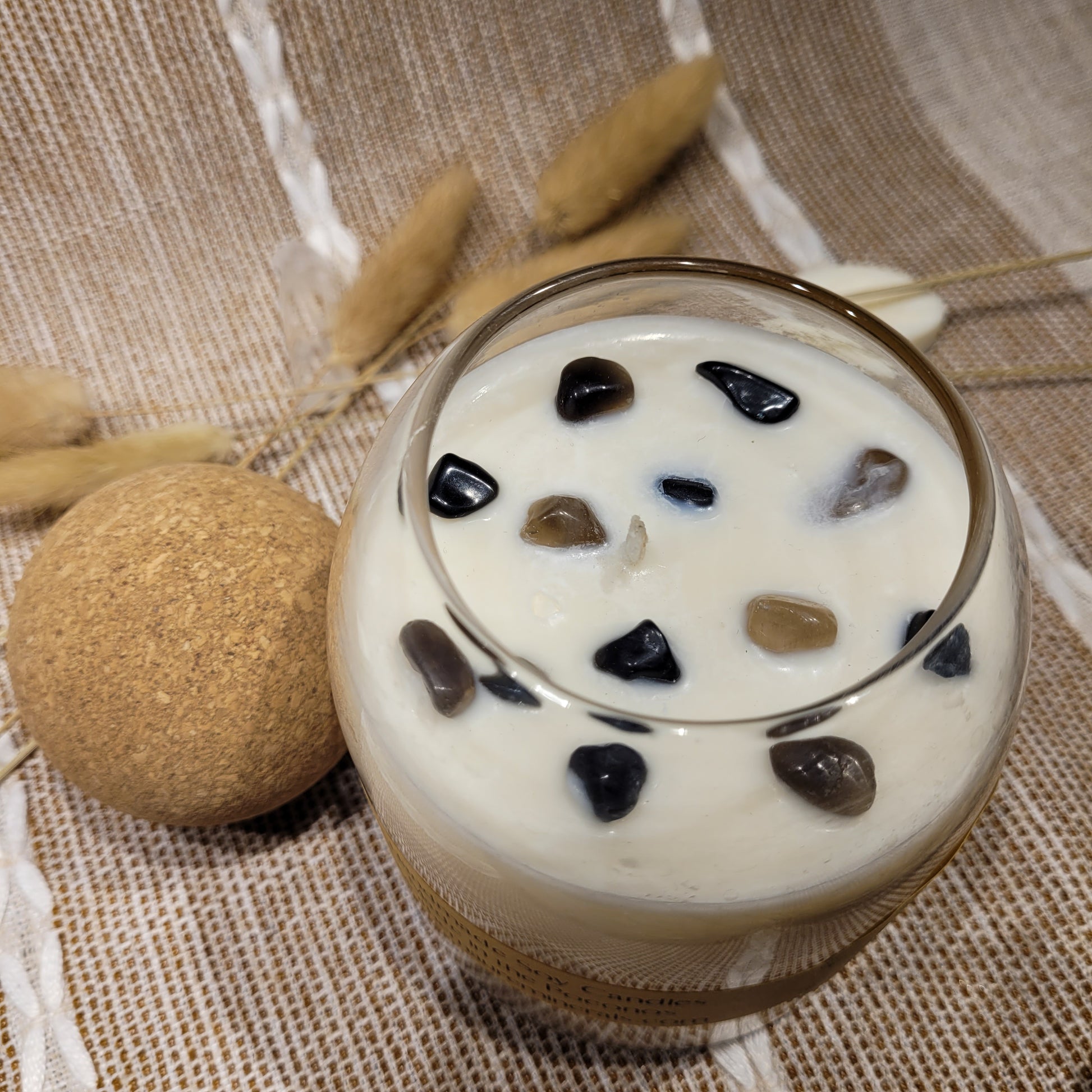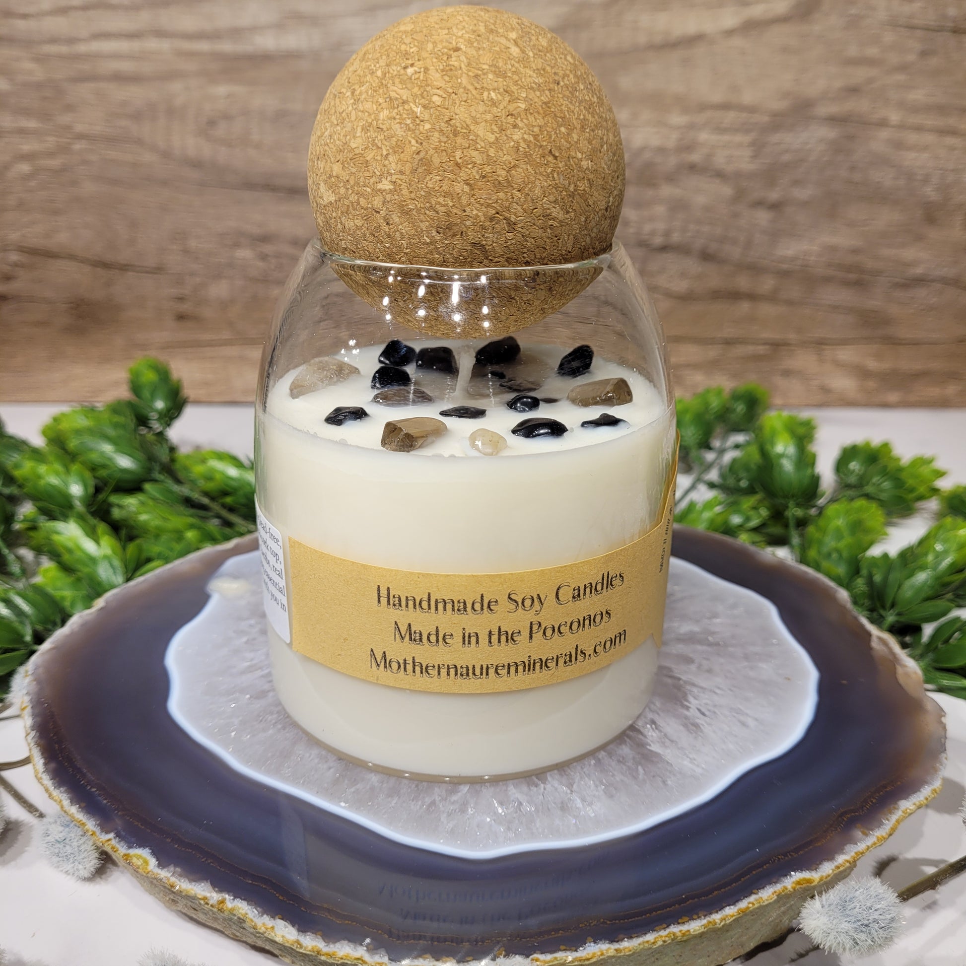 Handmade soy candles created with high-quality clean burning essential oil infused fragrance, 100% cotton wick, lead free borosilicate glass jar, natural cork lid, decorated with organic dried herbs and ethically sourced crystals in a 17 oz jar. Plus there is a hidden crystal on the bottom!