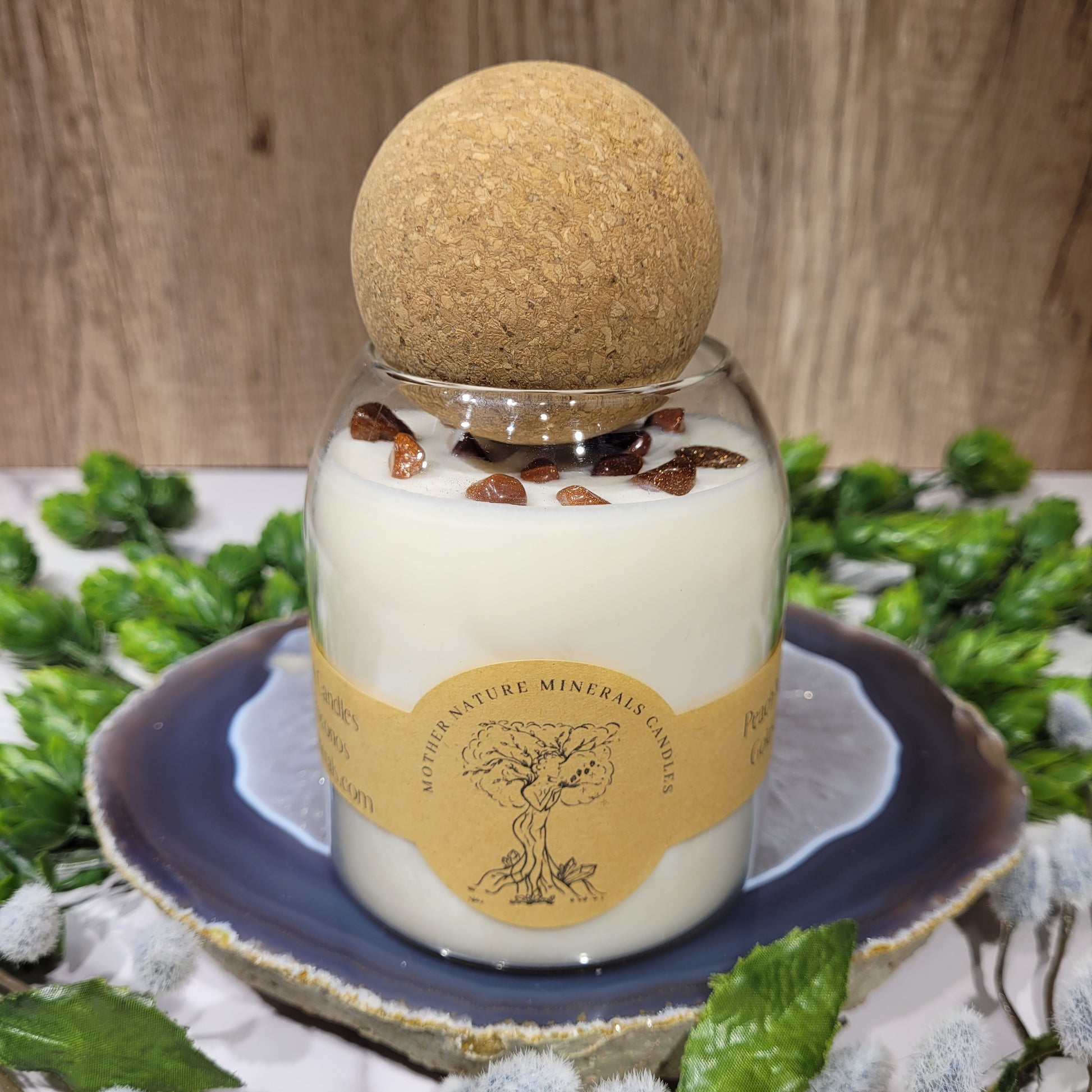 Handmade soy candles created with high-quality clean burning essential oil infused fragrance, 100% cotton wick, lead free borosilicate glass jar, natural cork lid, decorated with organic dried herbs and ethically sourced crystals in a 17 oz jar. Plus there is a hidden crystal on the bottom!