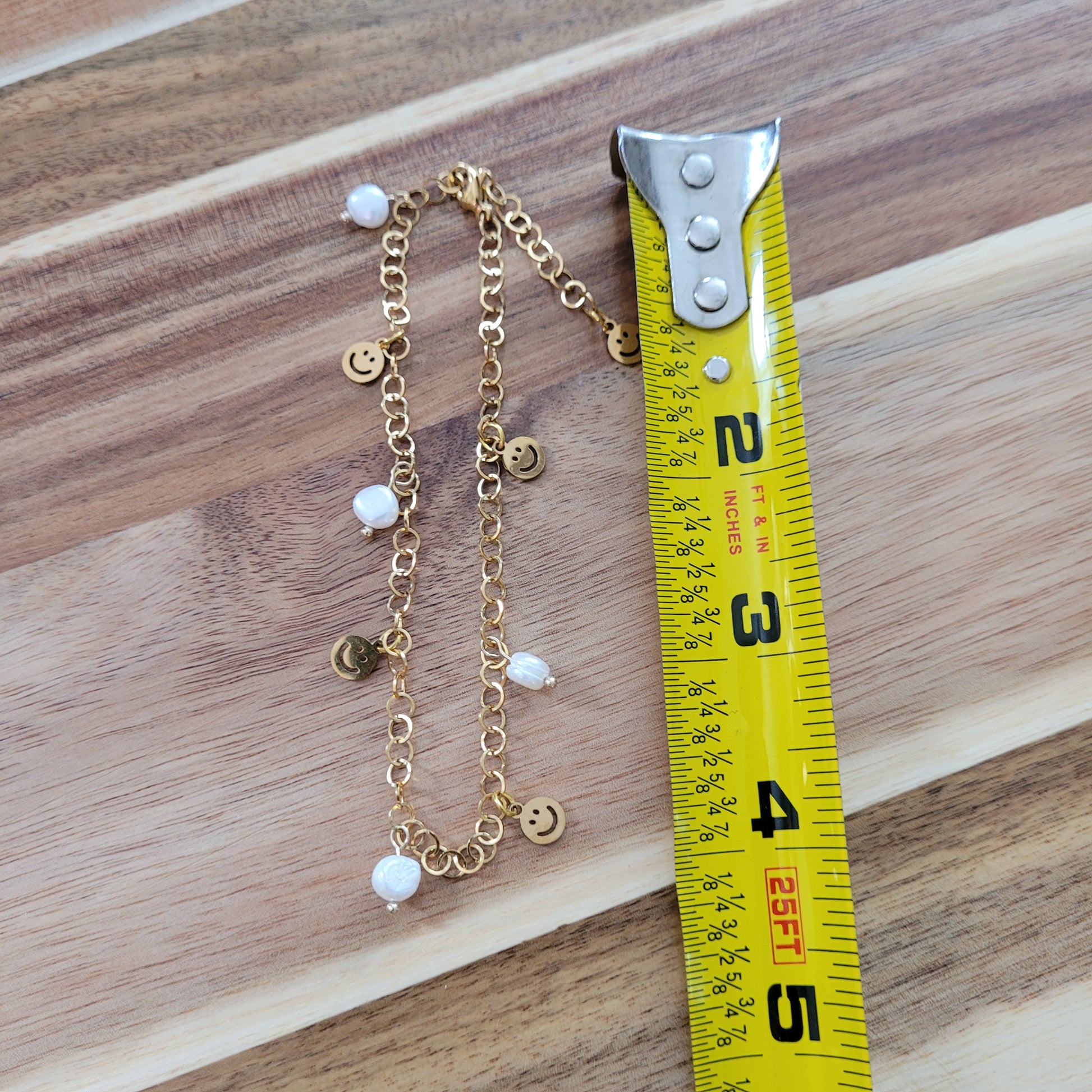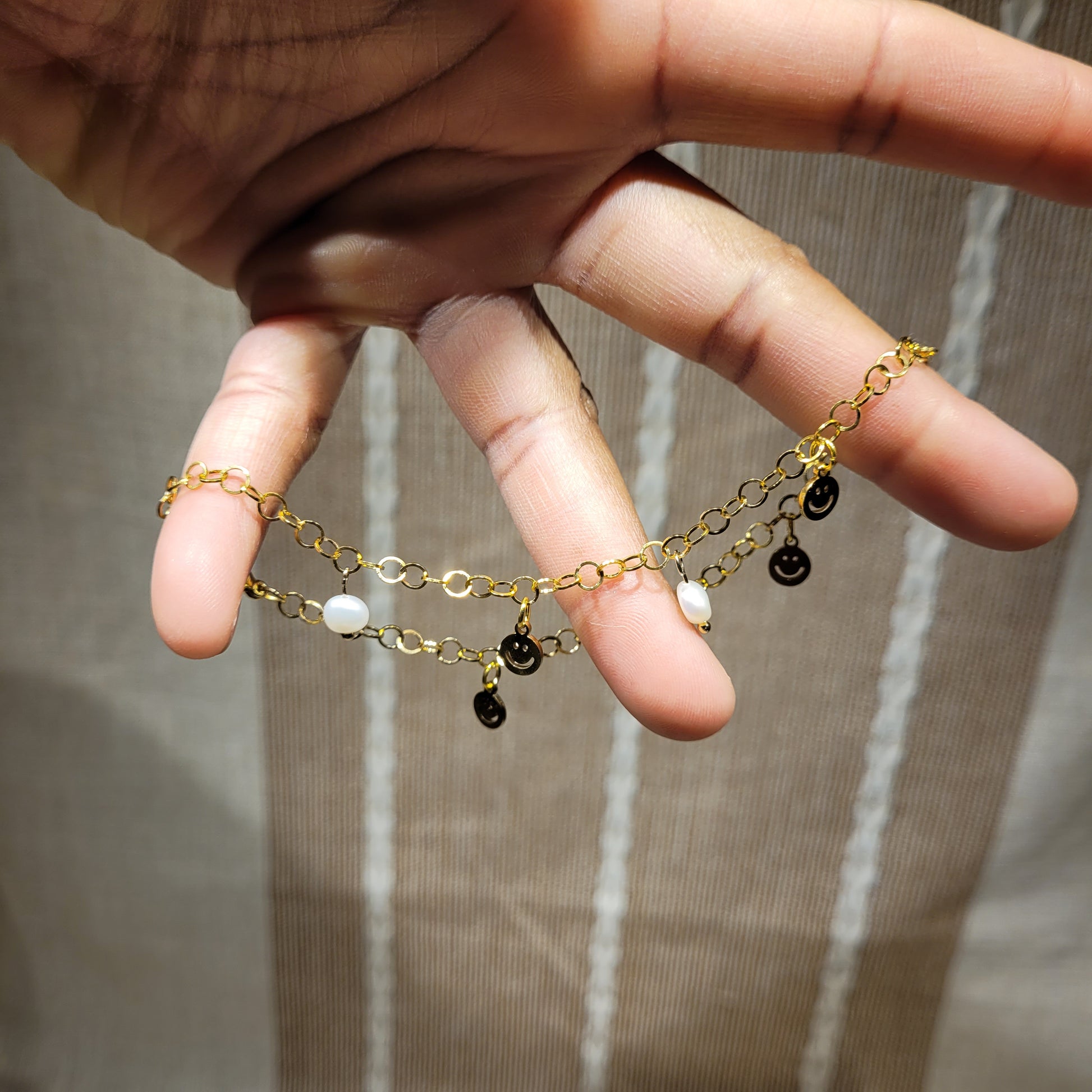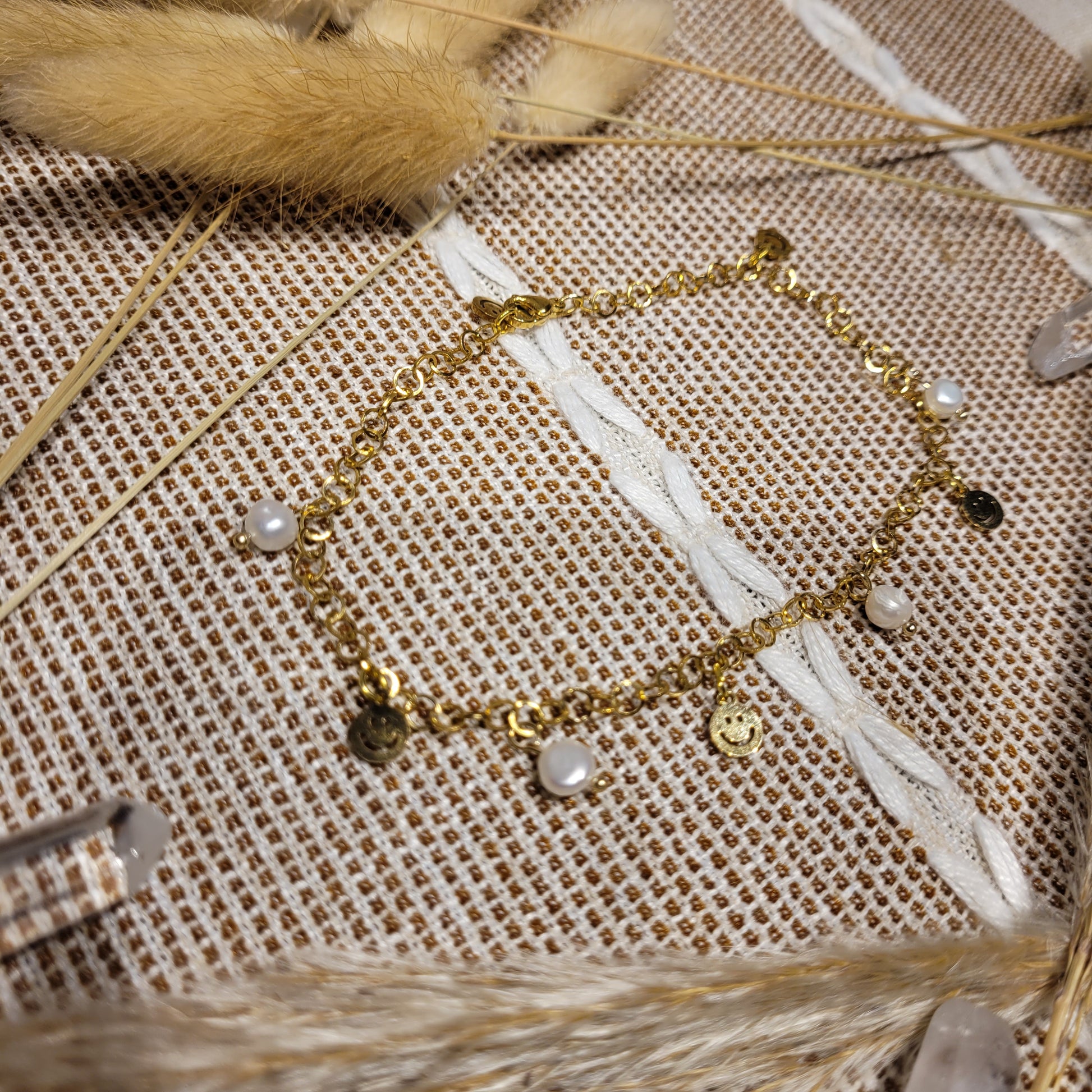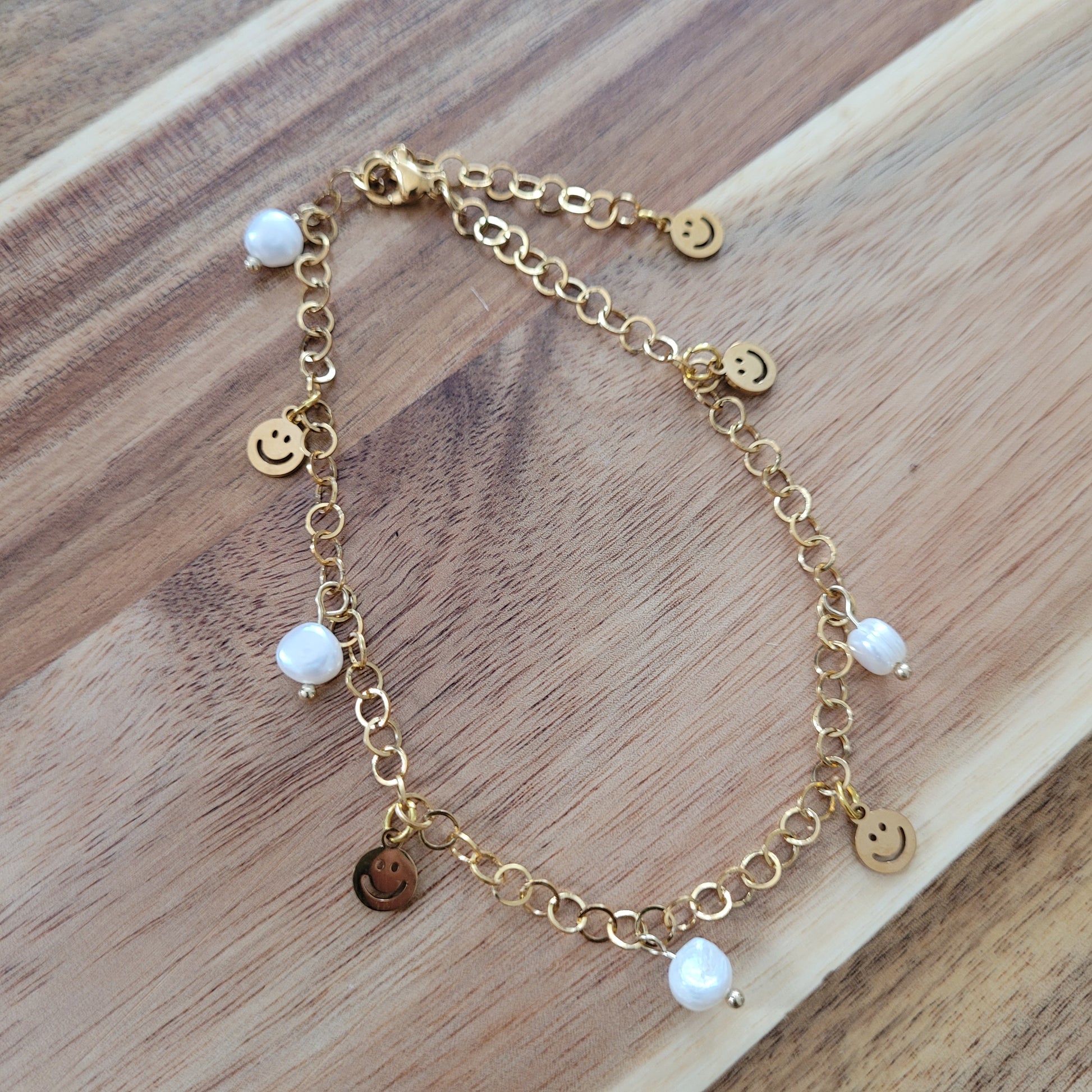 I made this beautiful anklet with ethically sourced Pearl, high-quality gold plated stainless steel chain, and gold stainless steel smiley face charms!