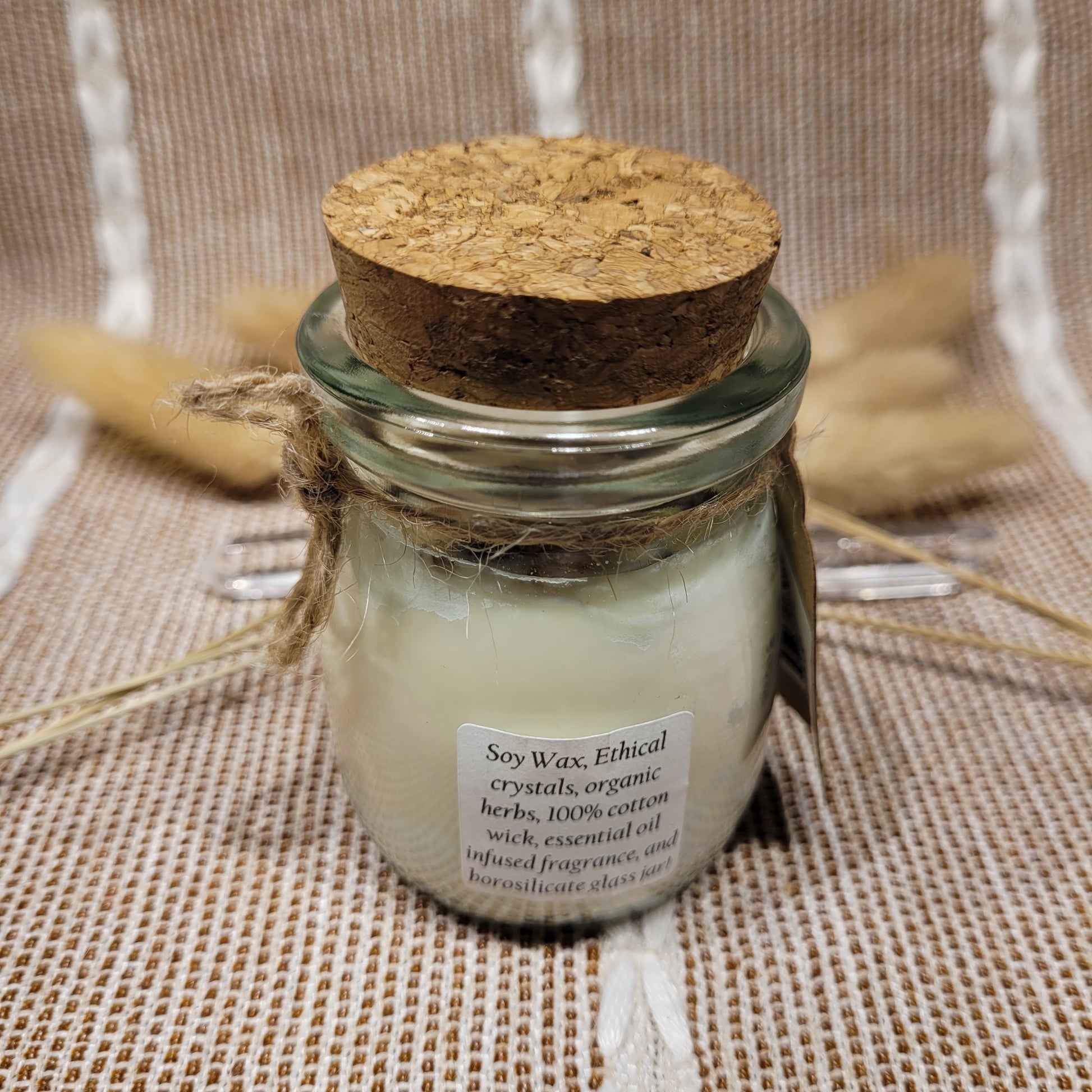 Handmade soy candles created with high-quality clean burning essential oil infused fragrance, 100% cotton wick, lead free borosilicate glass jar, natural cork lid, decorated with organic dried herbs and ethically sourced crystals in a 3.4 oz jar. Plus there is a hidden crystal on the bottom!