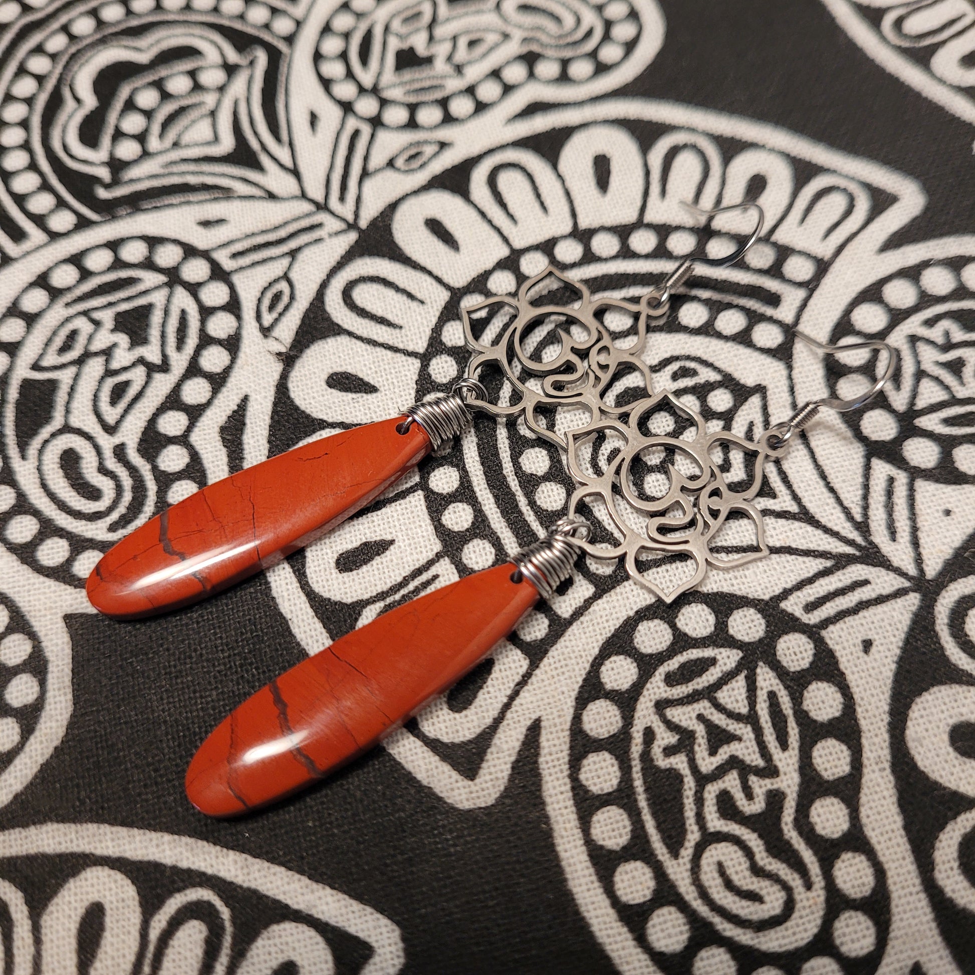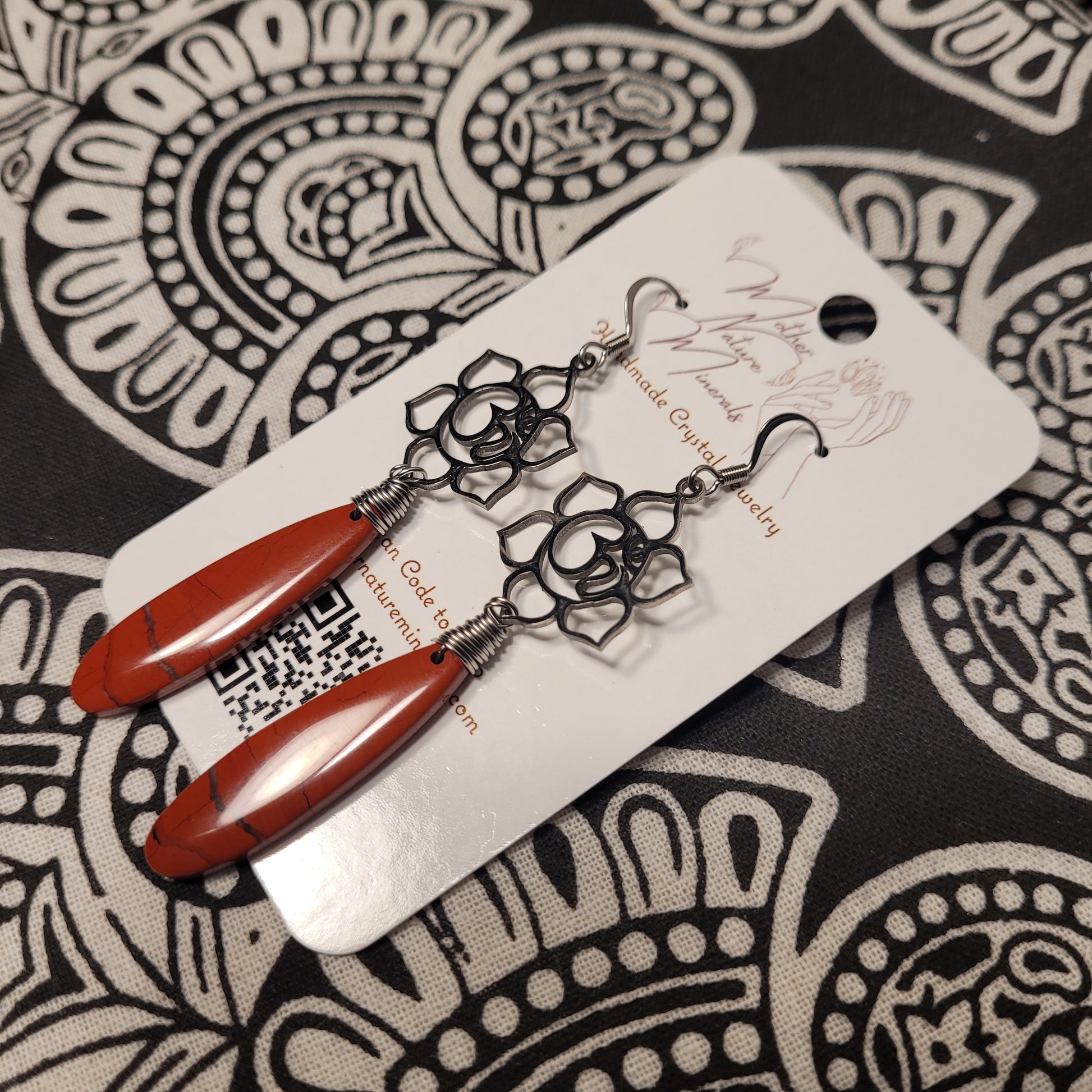 I created these Red Jasper Earrings with Stainless steel lotus om charms, stainless steel hooks, and stainless steel wire wrapped Red Jasper crystals.