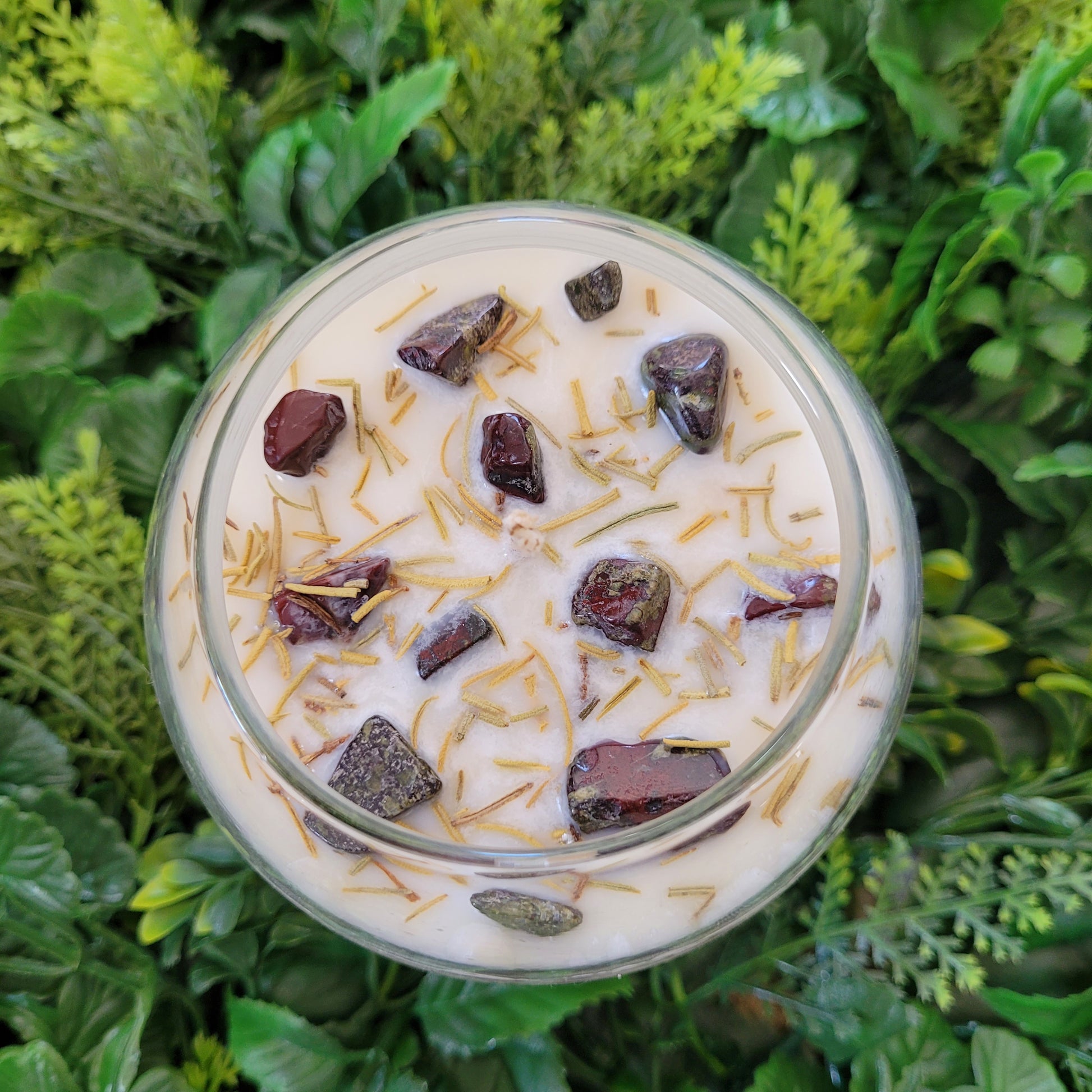 This candle has a lovely Rosemary Sage scent and is decorated with Dragon Blood Jasper crystal chips and rosemary herbs on top!