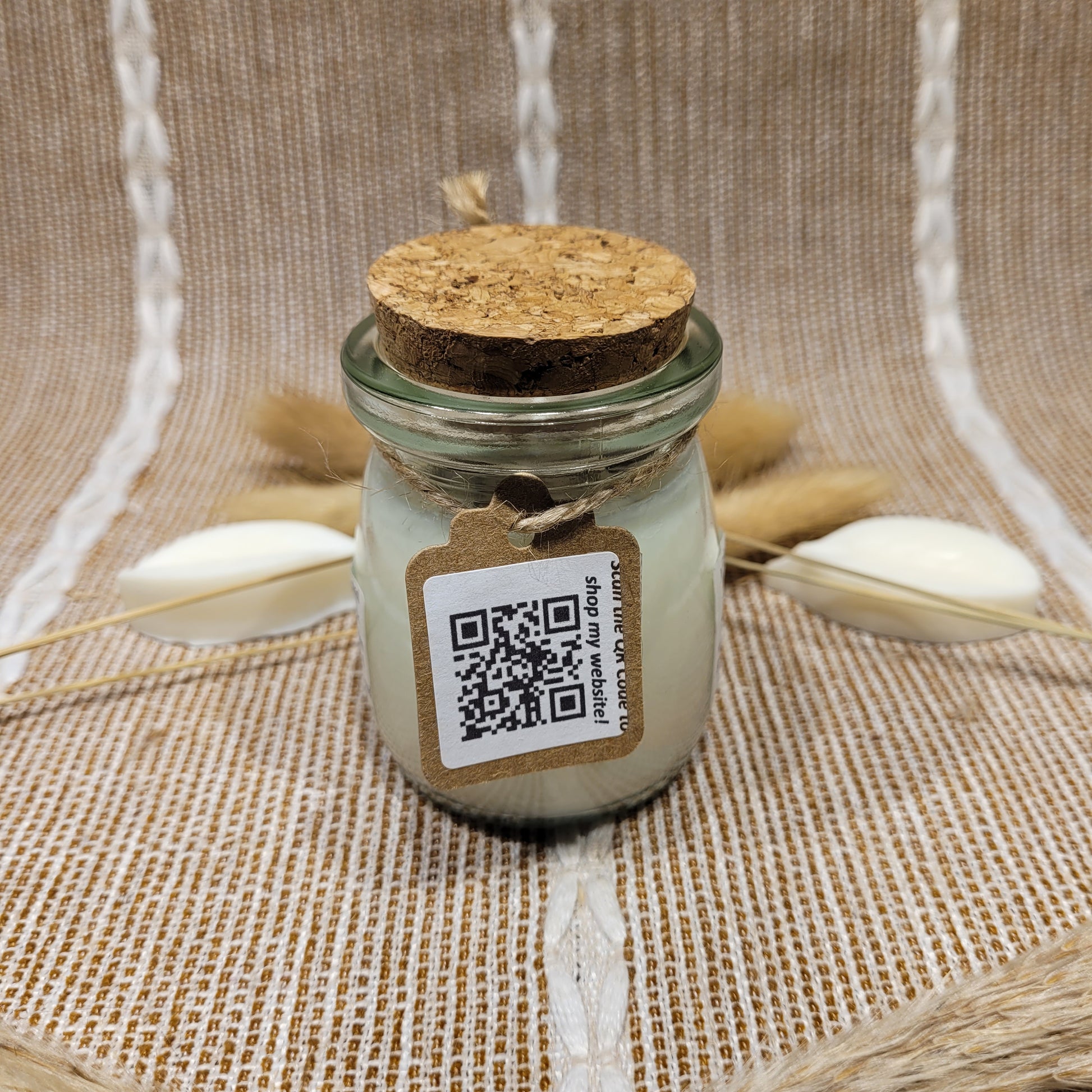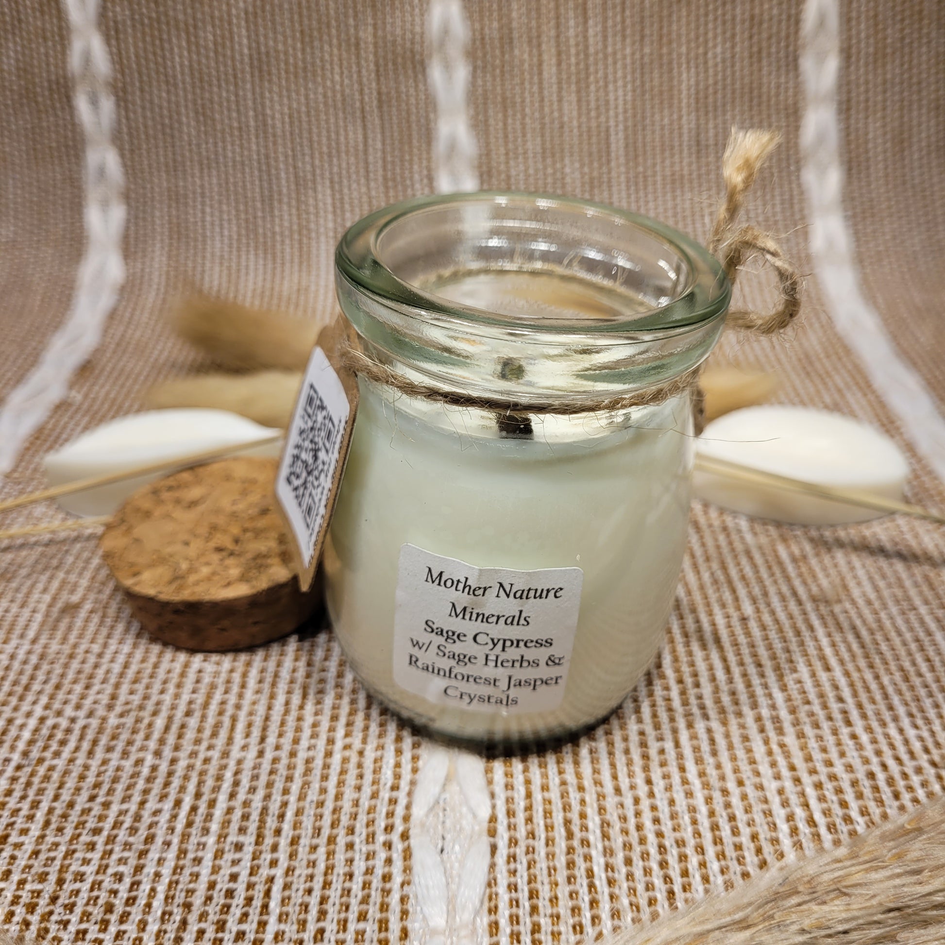Handmade soy candles created with high-quality clean burning essential oil infused fragrance, 100% cotton wick, lead free borosilicate glass jar, natural cork lid, decorated with organic dried herbs and ethically sourced crystals in a 3.4 oz jar. Plus there is a hidden crystal on the bottom!