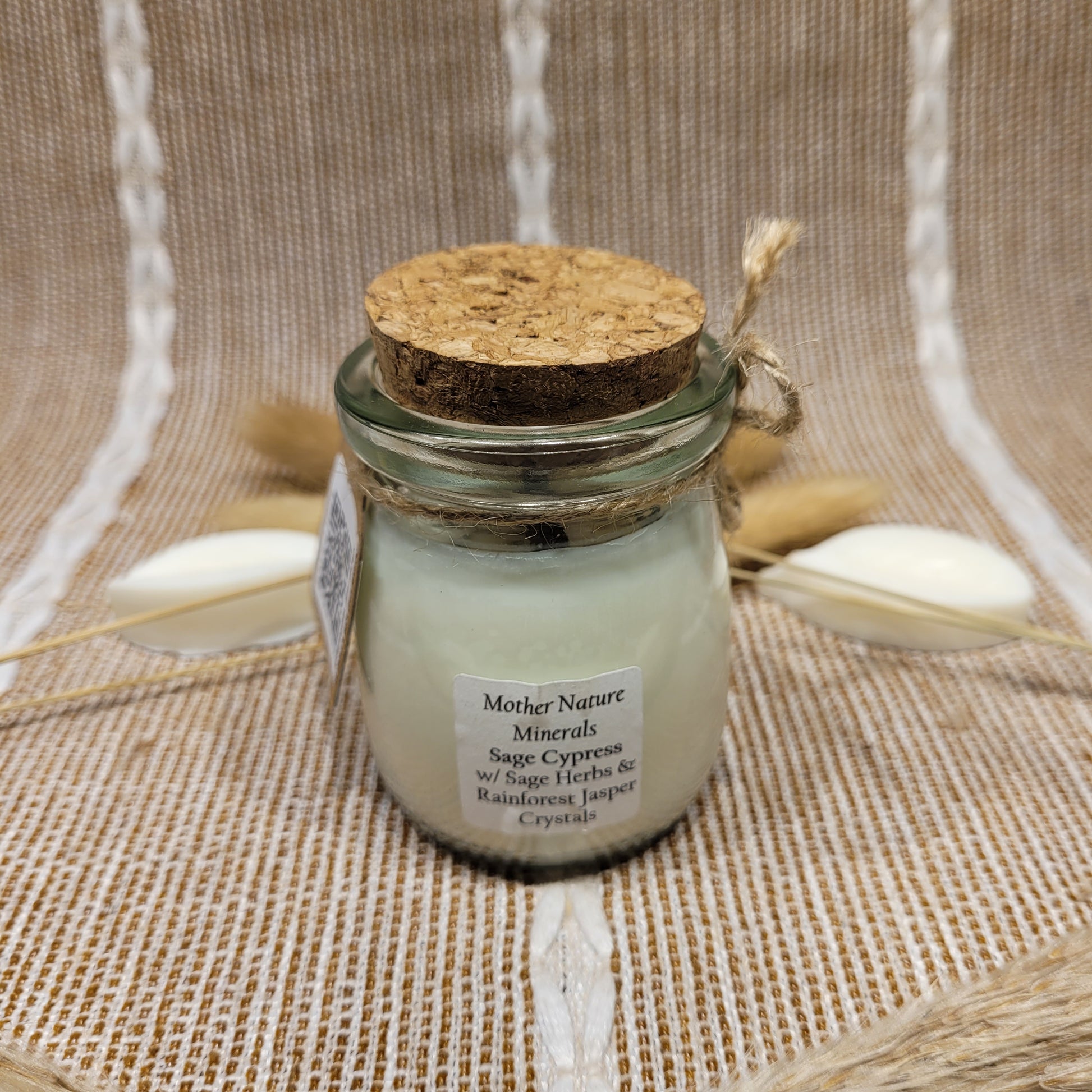 This candle has a lovely Sage Cypress scent and is decorated with Sage herbs and Rainforest Jasper crystal chips on top!