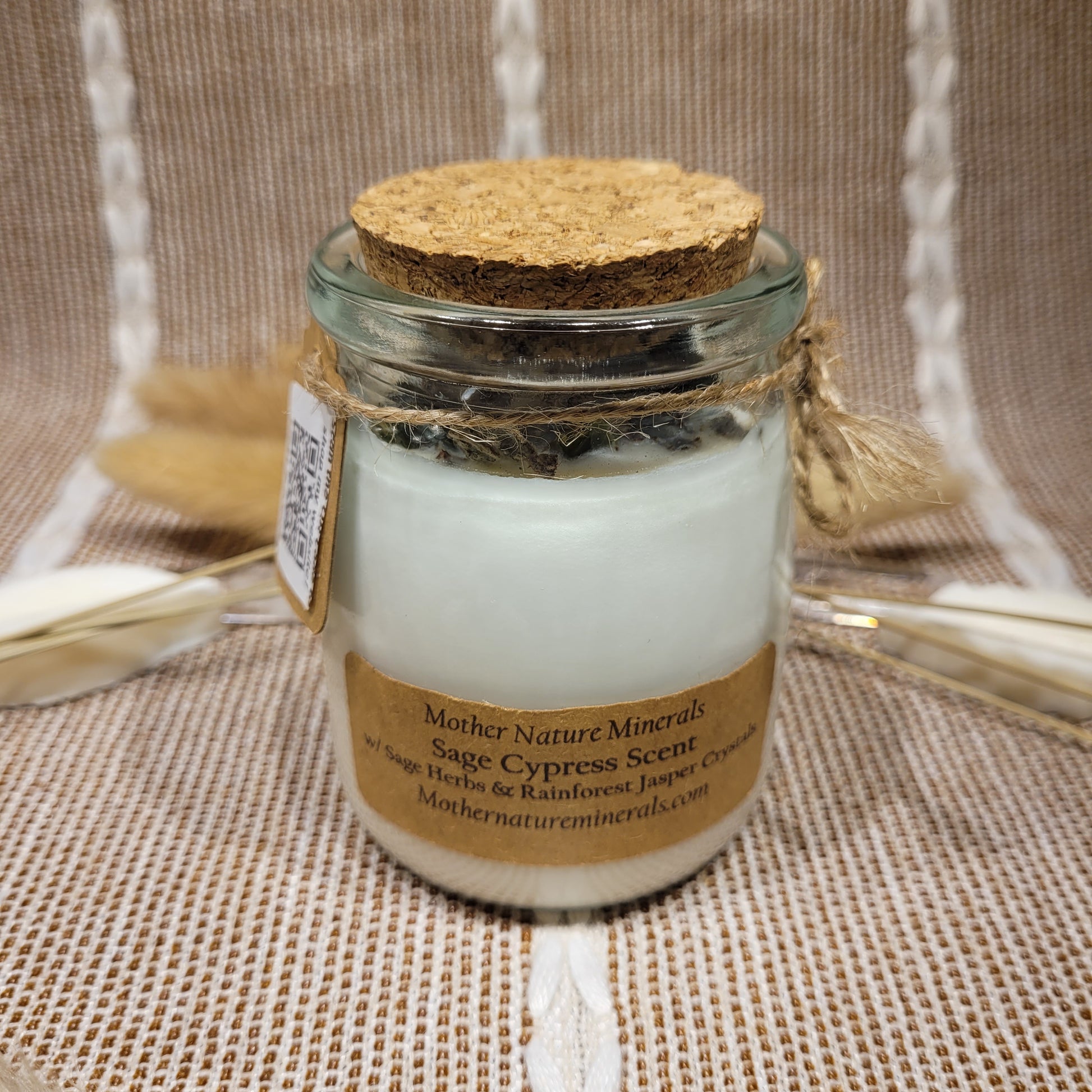 This candle has a lovely Sage Cypress scent and is decorated with Sage herbs and Rainforest Jasper crystal chips on top!