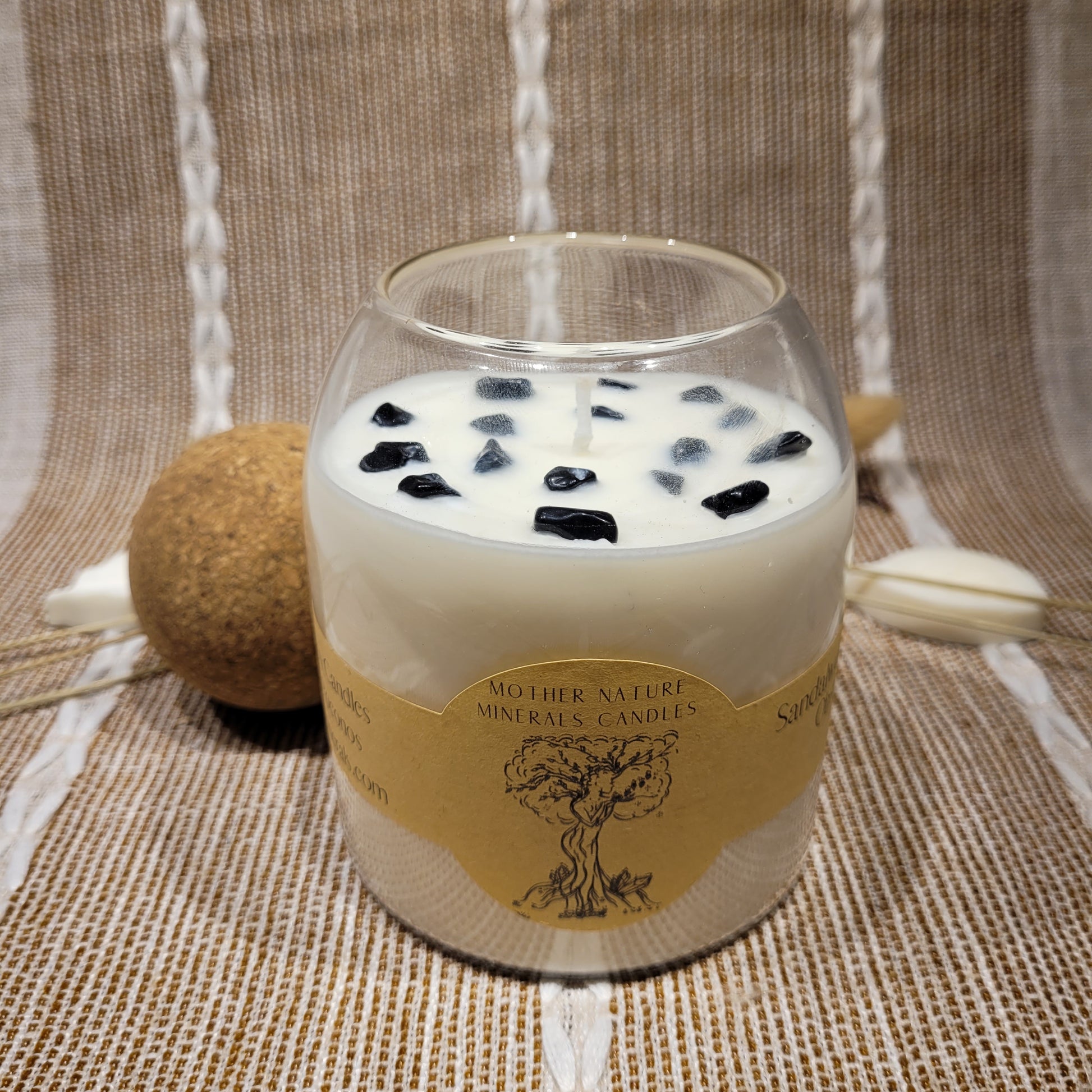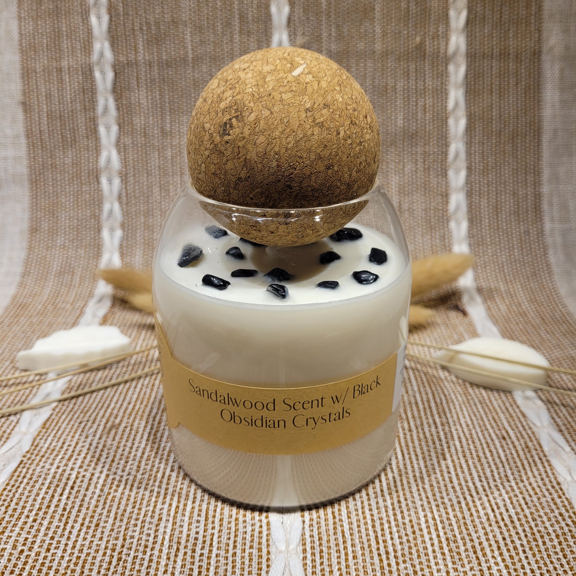 This candle has a lovely Sandalwood scent and is decorated with black obsidian crystal chips on top!