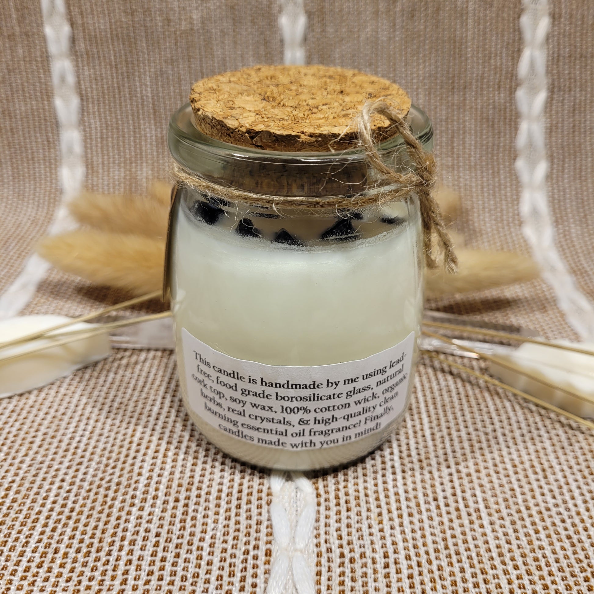 Handmade soy candles created with high-quality clean burning essential oil infused fragrance, 100% cotton wick, lead free borosilicate glass jar, natural cork lid, decorated with organic dried herbs and ethically sourced crystals in a 7 oz jar. Plus there is a hidden crystal on the bottom!