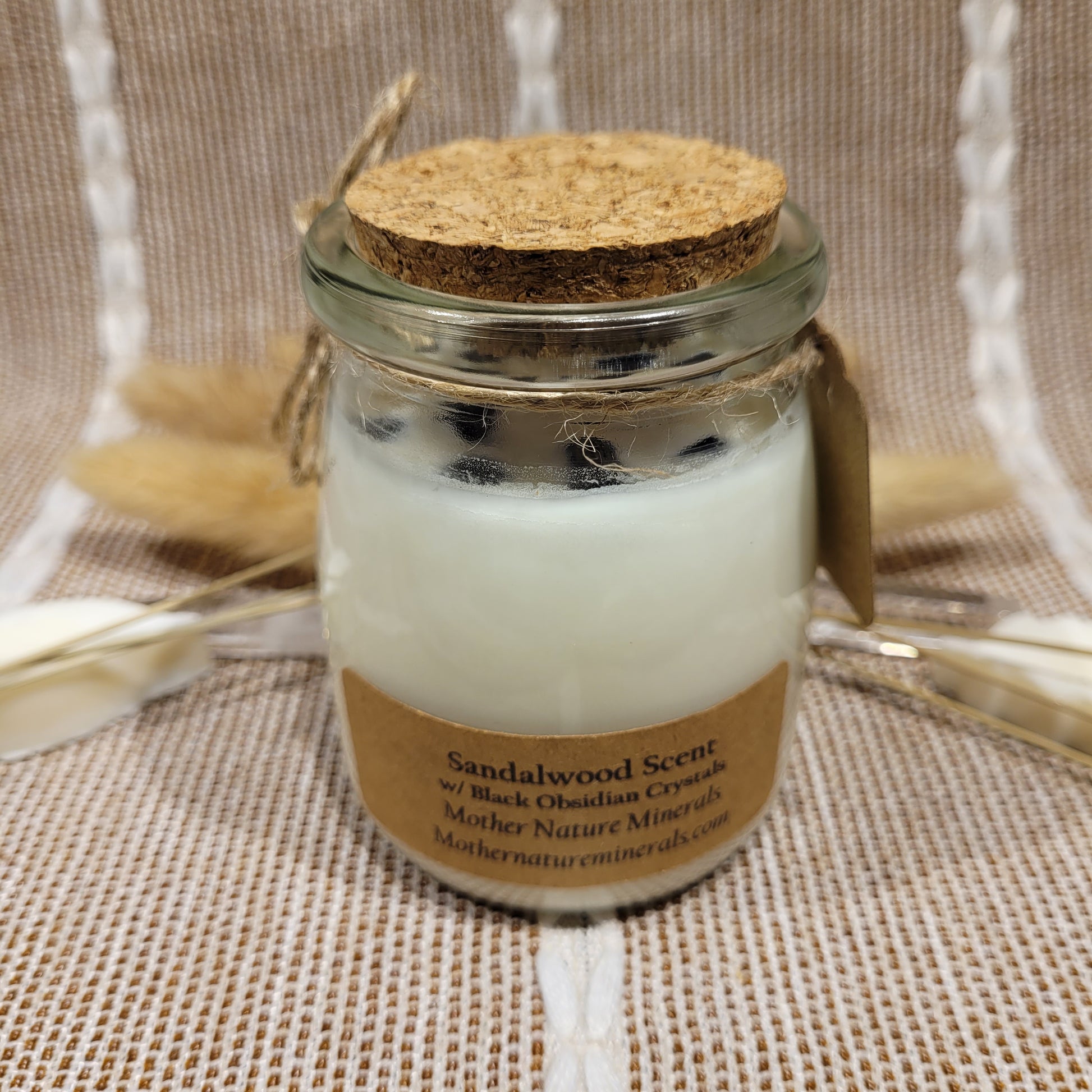 This candle has a lovely Sandalwood scent and is decorated with black obsidian crystal chips on top!