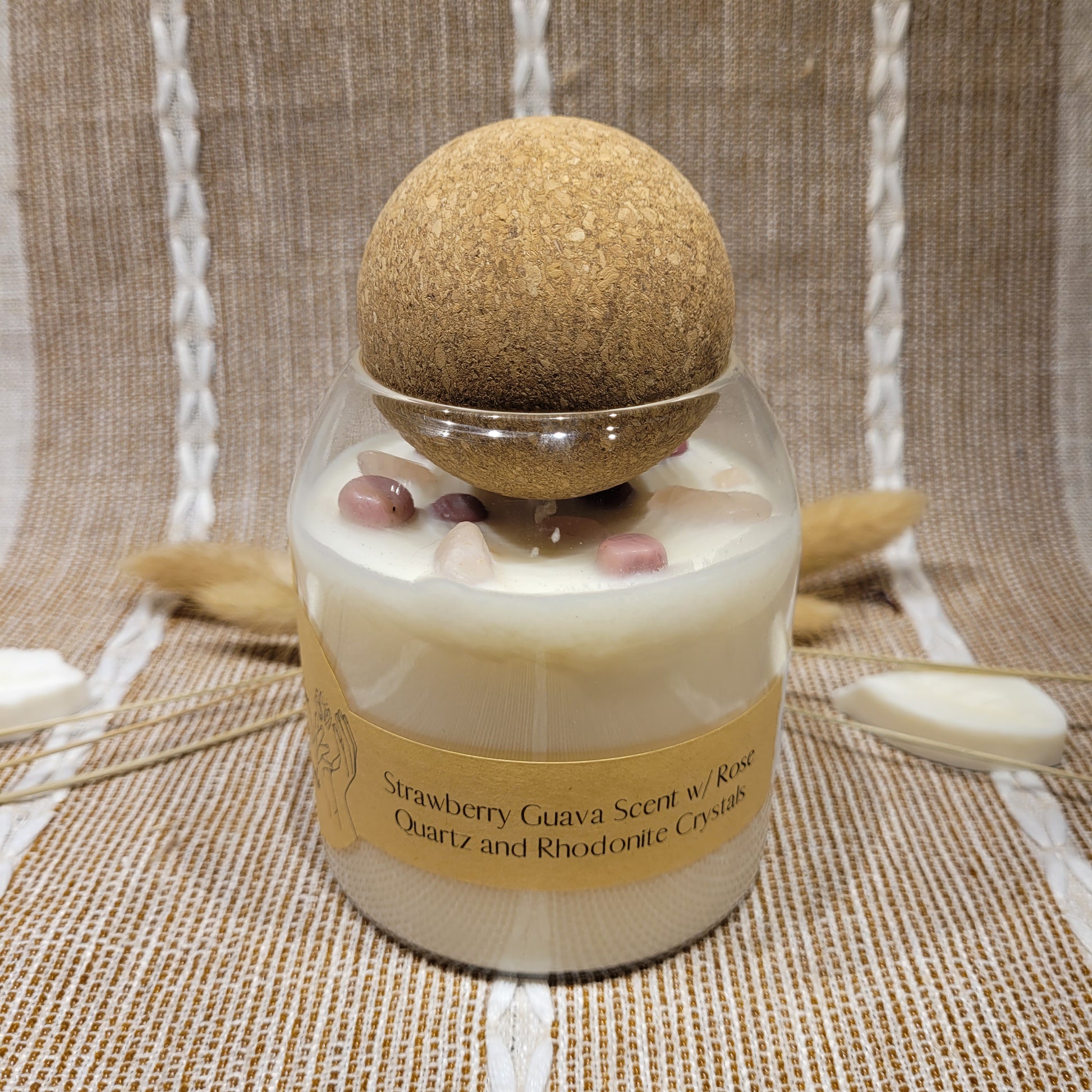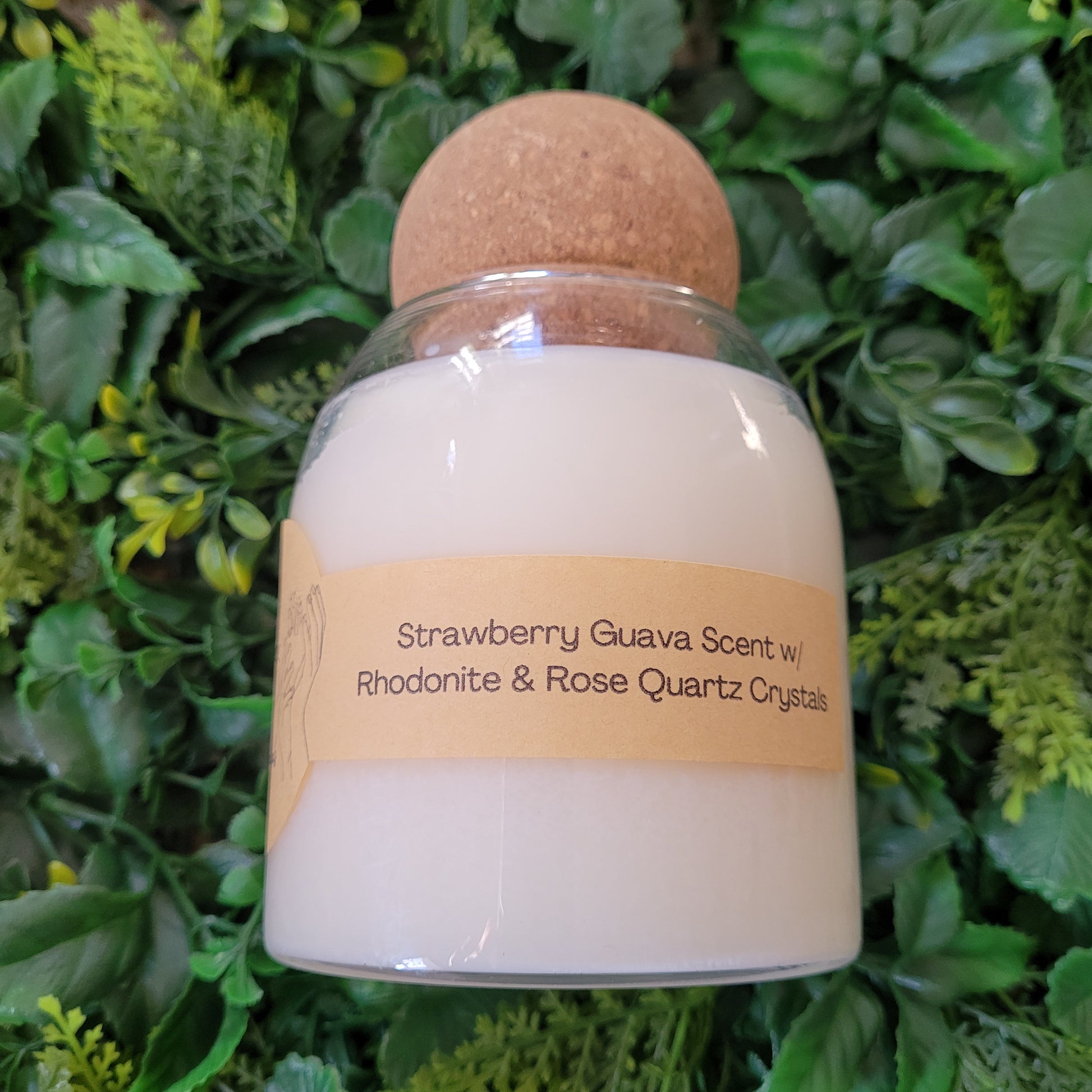 This candle has a lovely Strawberry Guava scent and is decorated with Rhodonite and Rose Quartz crystal chips on top!