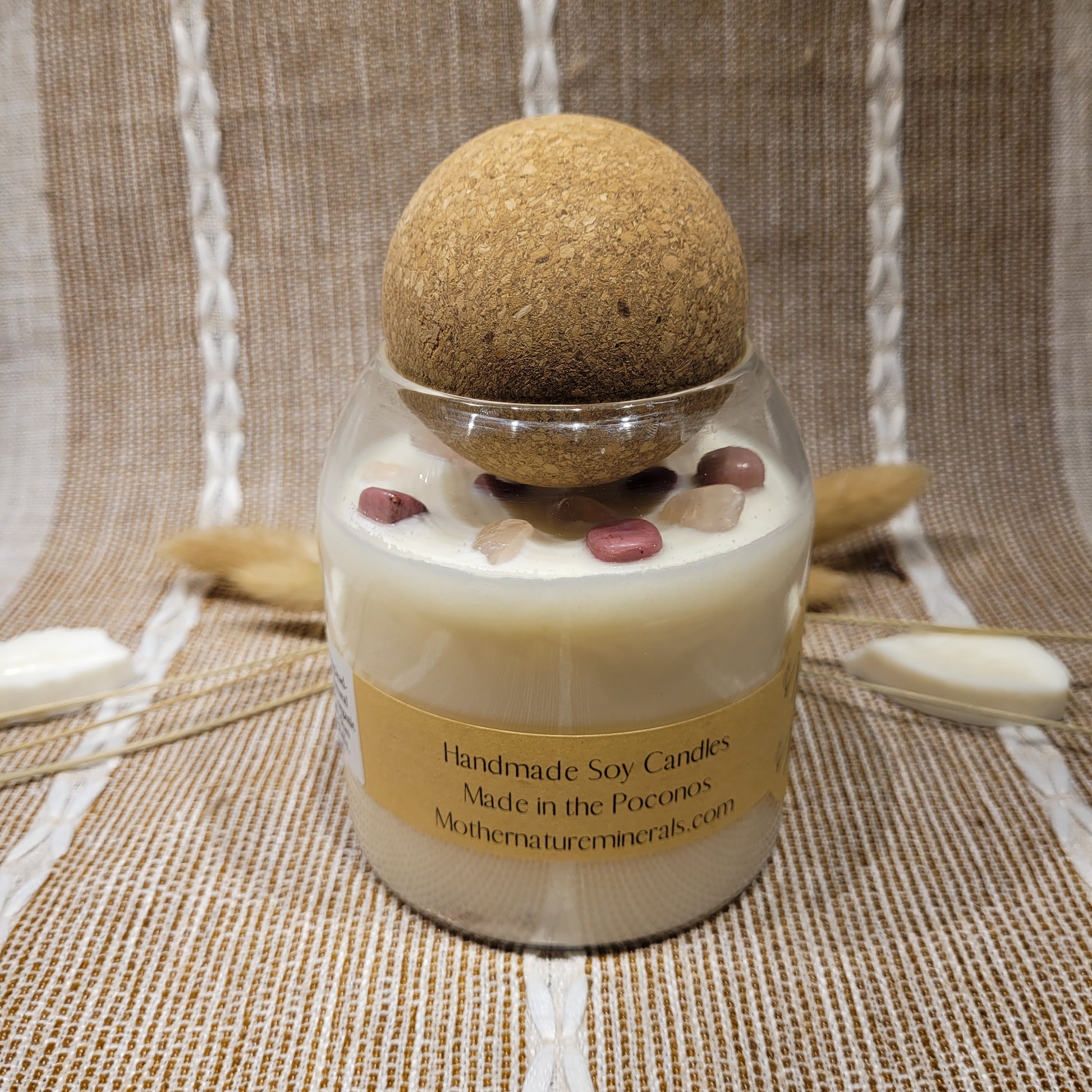 Handmade soy candles created with high-quality clean burning essential oil infused fragrance, 100% cotton wick, lead free borosilicate glass jar, natural cork lid, decorated with organic dried herbs and ethically sourced crystals in a 17 oz jar. Plus there is a hidden crystal on the bottom!