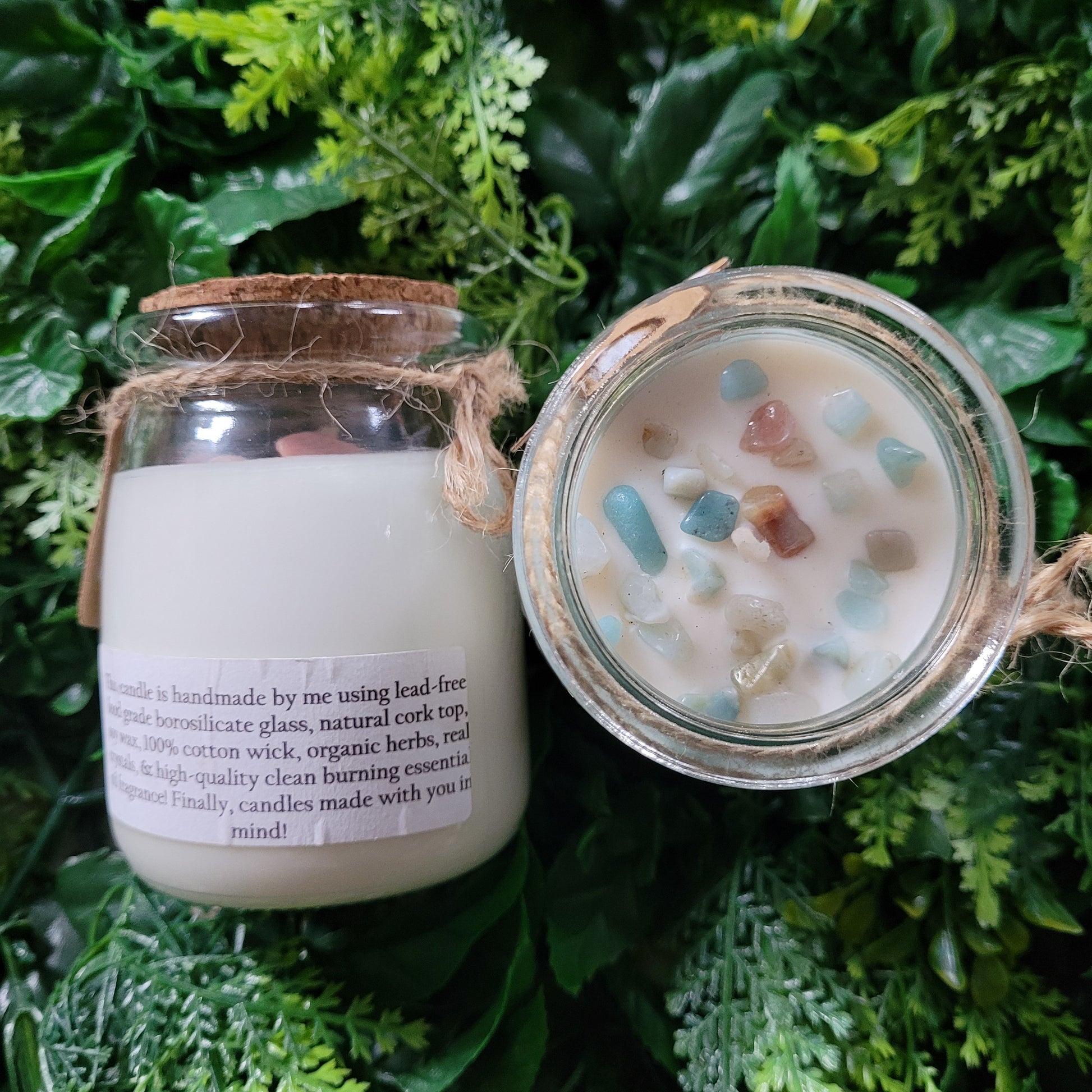 Handmade soy candles created with high-quality clean burning essential oil infused fragrance, 100% cotton wick, lead free borosilicate glass jar, natural cork lid, decorated with organic dried herbs and ethically sourced crystals in a 7 oz jar. Plus there is a hidden crystal on the bottom!