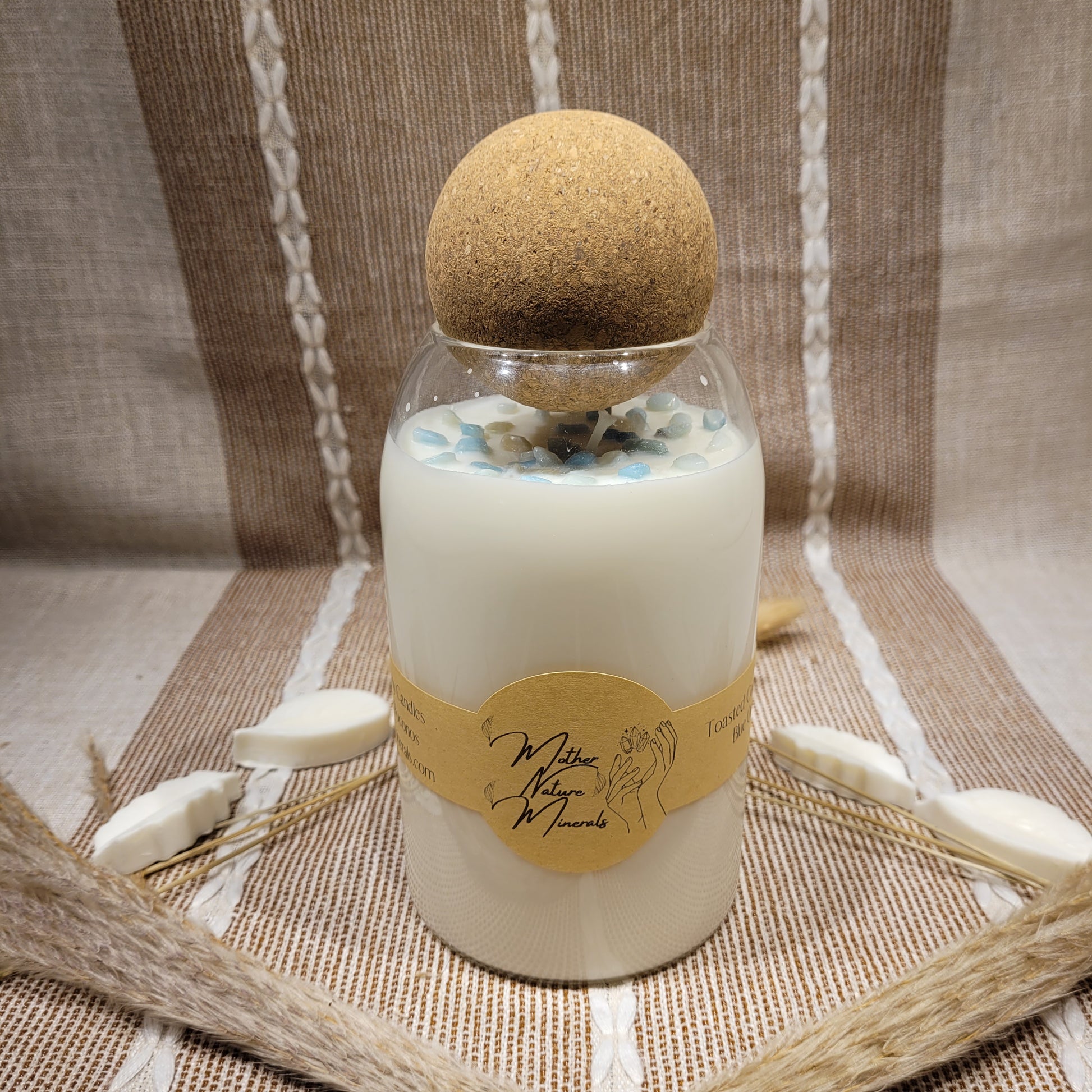 Handmade soy candles created with high-quality clean burning essential oil infused fragrance, 100% cotton wick, lead free borosilicate glass jar, natural cork lid, decorated with organic dried herbs and ethically sourced crystals in a 25 oz jar. Plus there is a hidden crystal on the bottom!