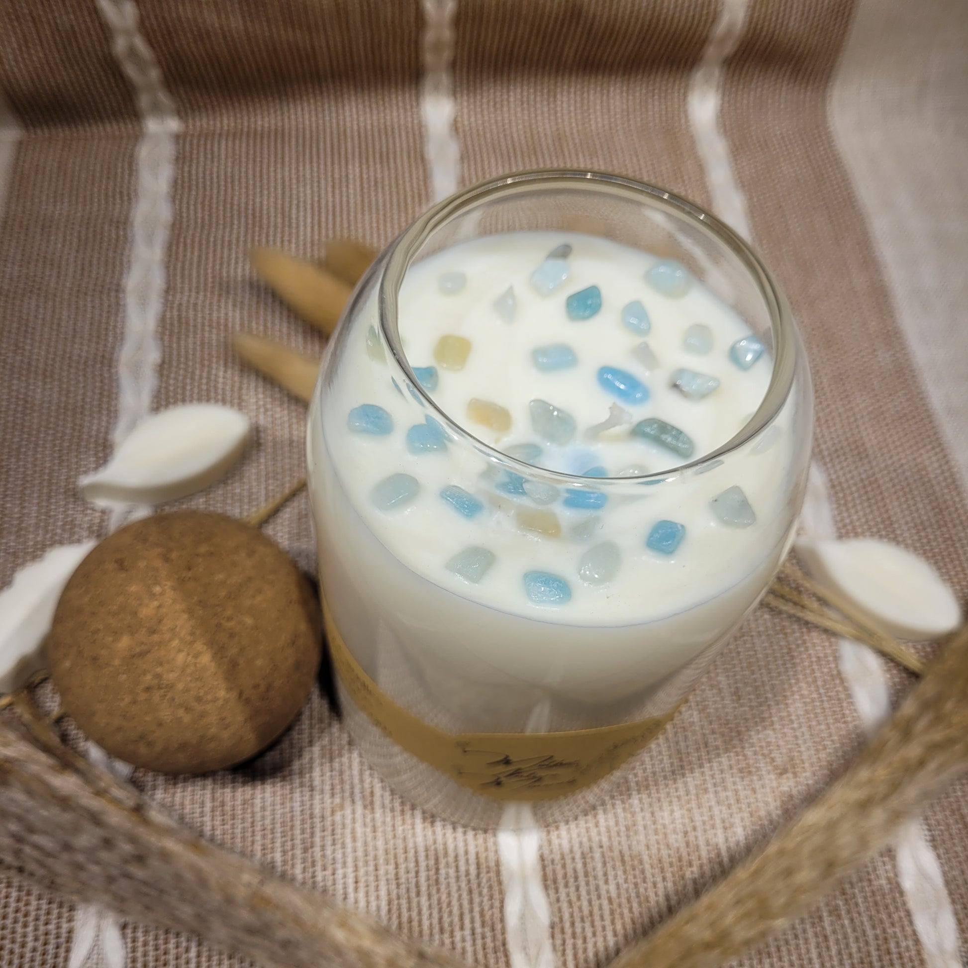 This candle has a lovely Toasted Coconut scent and is decorated with Sky Blue Quartz crystal chips on top!