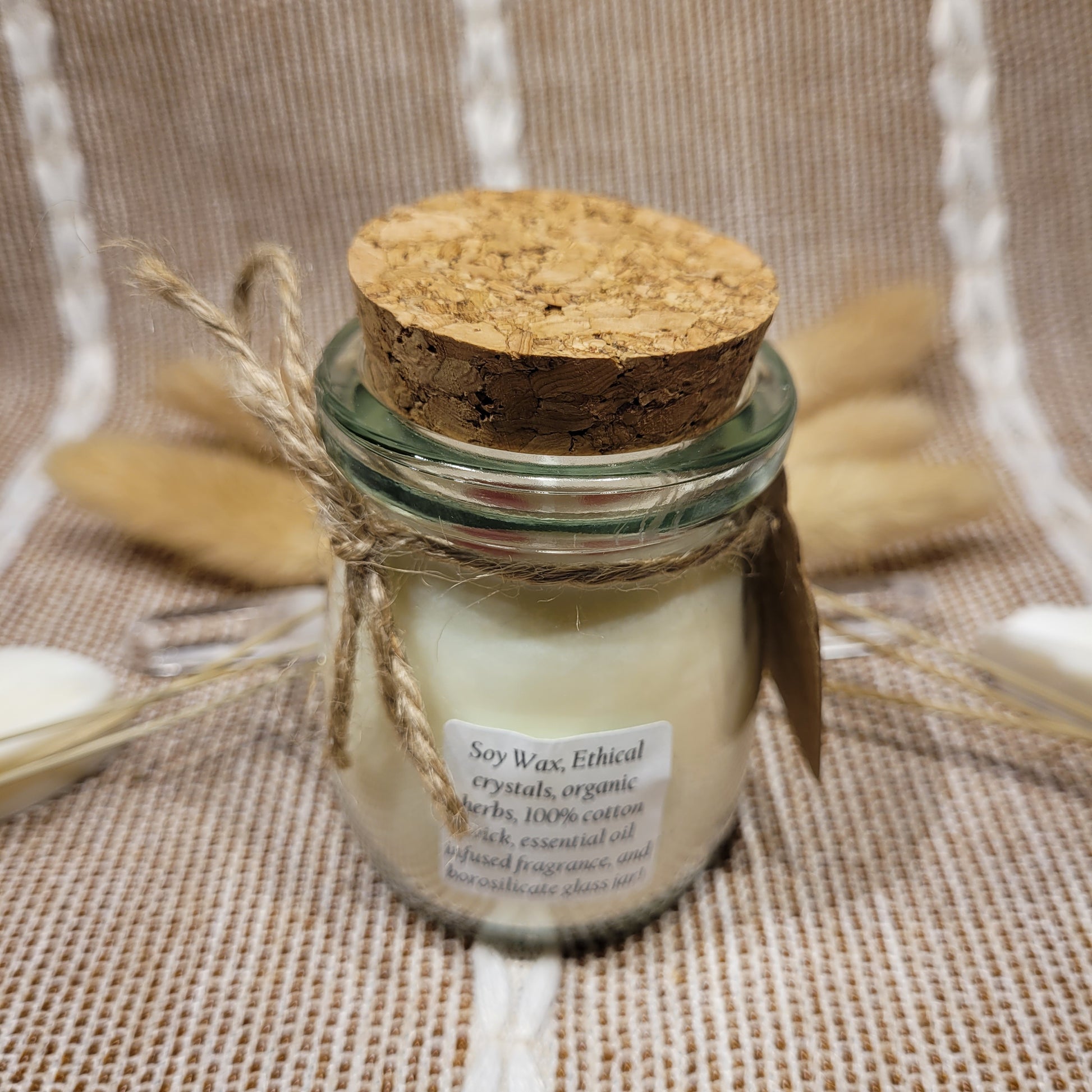Handmade soy candles created with high-quality clean burning essential oil infused fragrance, 100% cotton wick, lead free borosilicate glass jar, natural cork lid, decorated with organic dried herbs and ethically sourced crystals in a 3.4 oz jar. Plus there is a hidden crystal on the bottom!