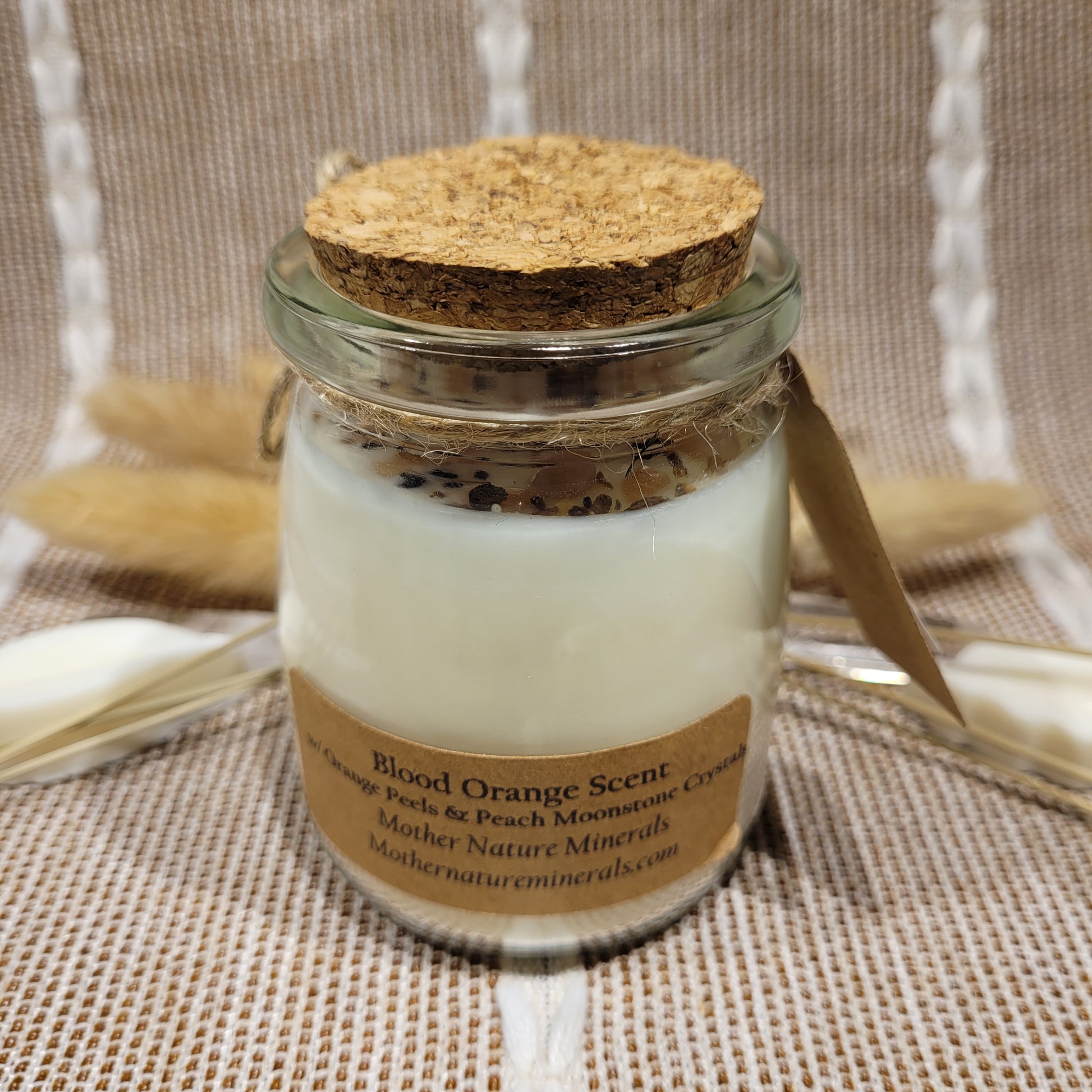 Blood Orange scented candle with decorated with organic dried orange peels, and Peach Moonstone crystal chips on top!