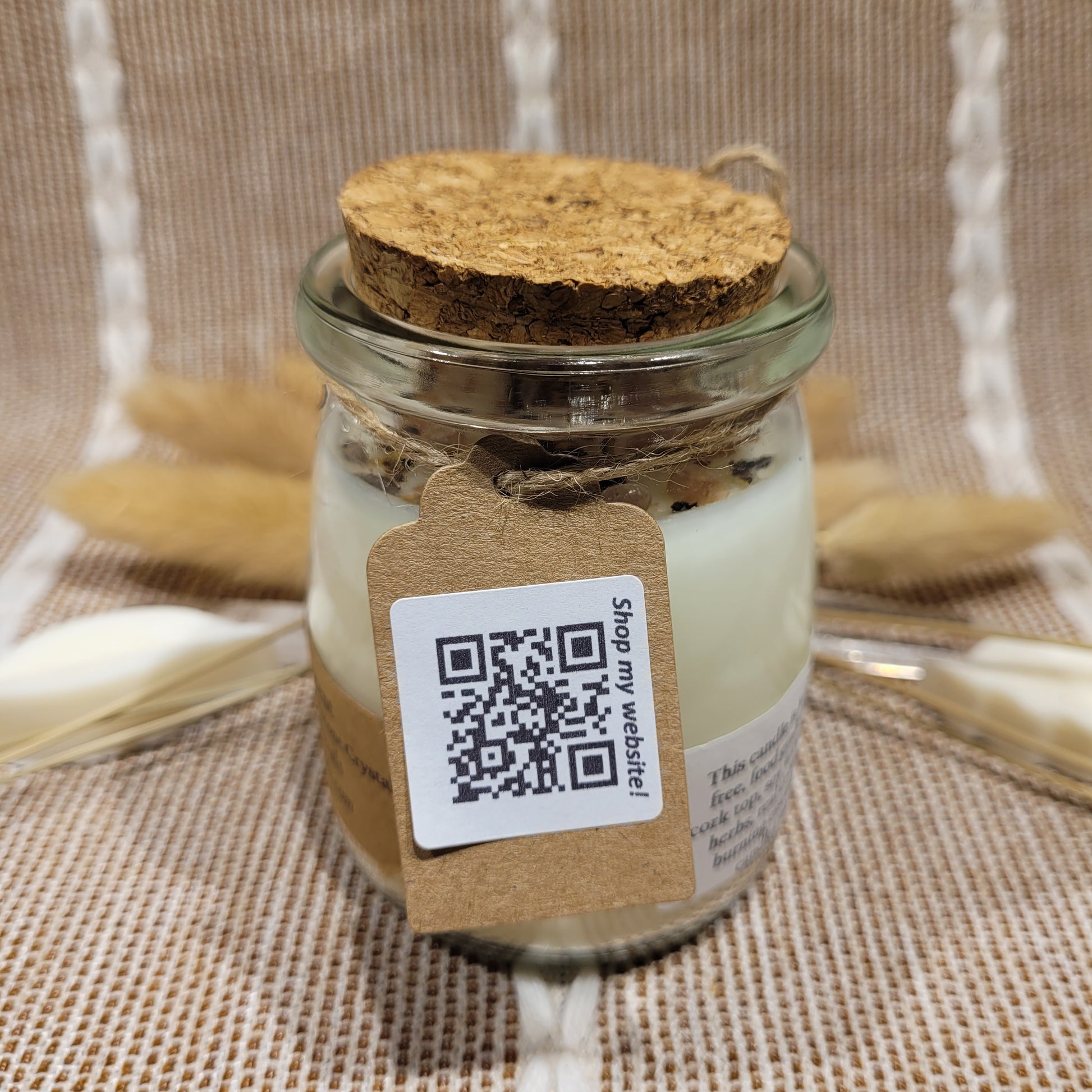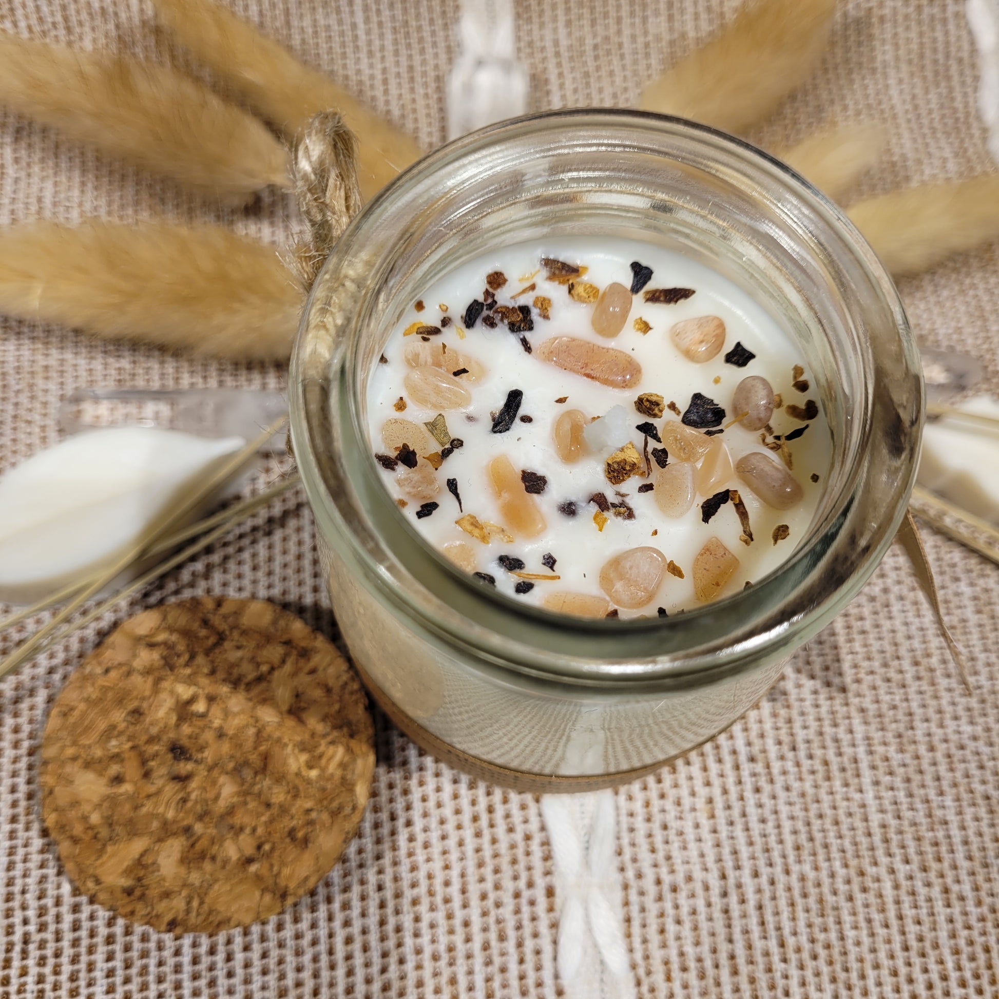 Handmade soy candles created with high-quality clean burning essential oil infused fragrance, 100% cotton wick, lead free borosilicate glass jar, decorated with organic dried herbs and ethically sourced crystals in a 7 oz Jar. Plus there is a hidden crystal on the bottom!