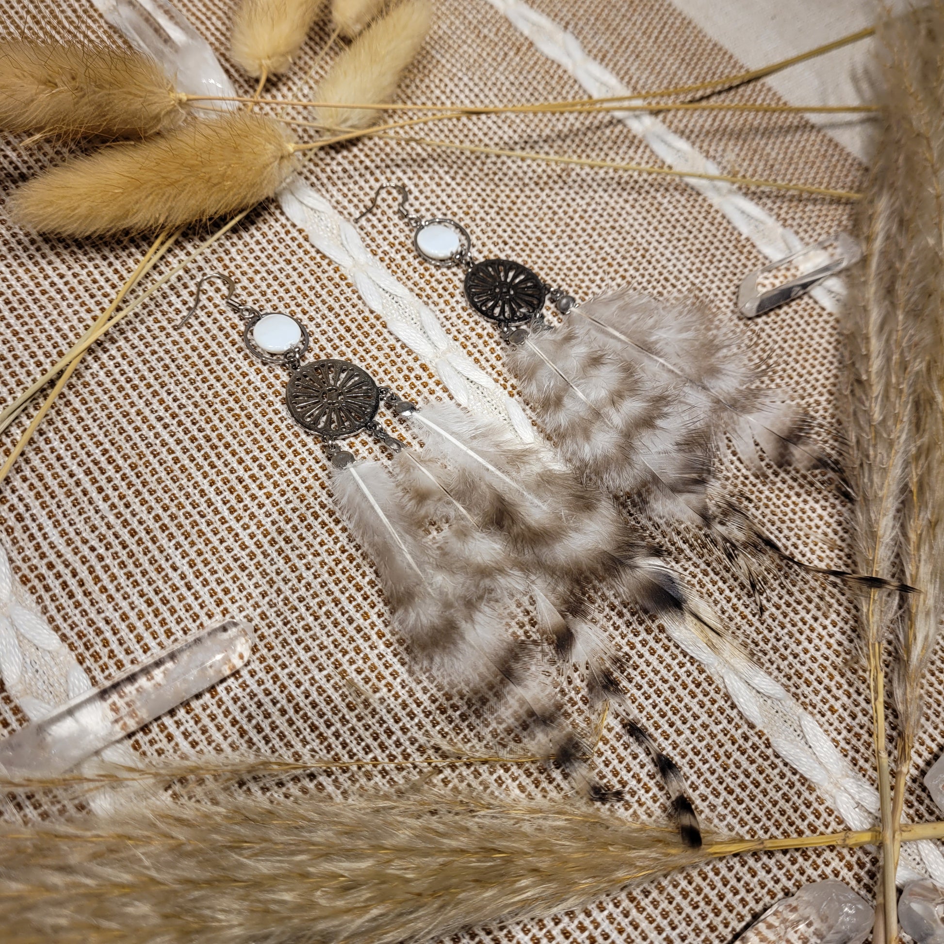 I created these lovely White Mother of Pearl Earrings with ethically sourced phesant feathers and high quality White Mother of Pearl beads, stainless steel mandala charms, and high quality stainless steel!