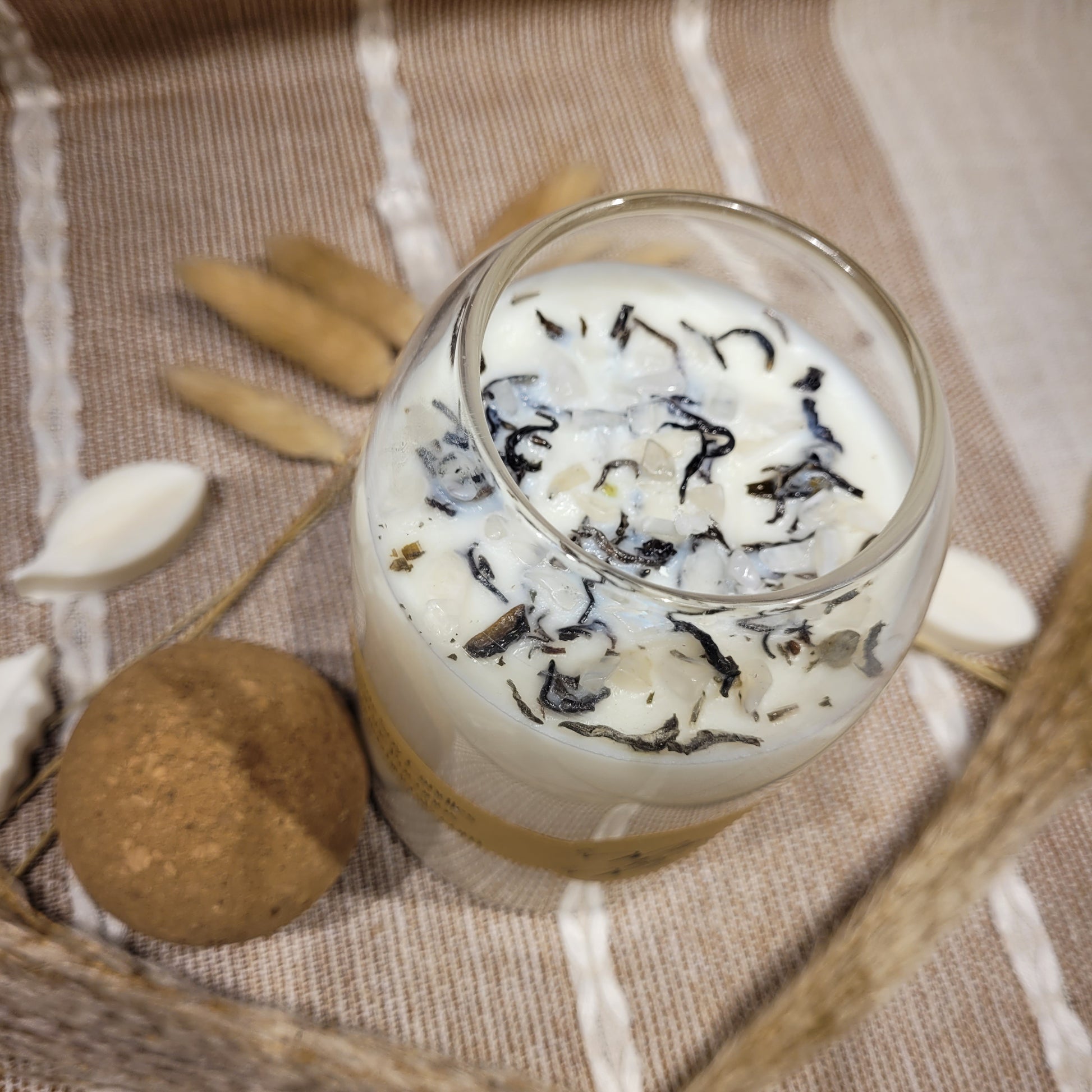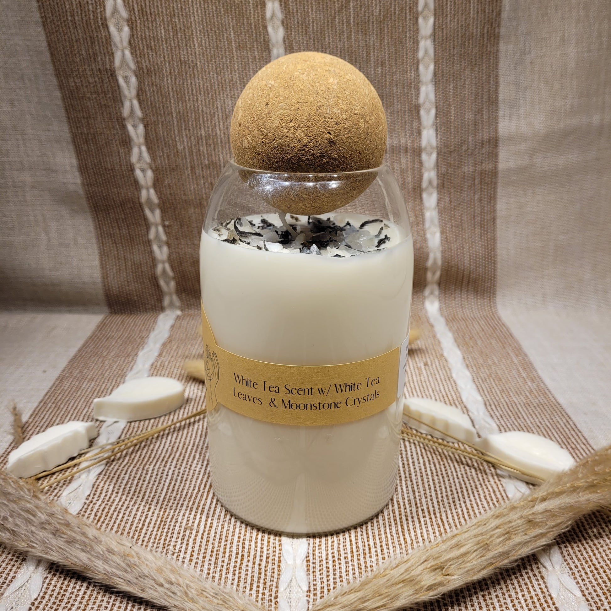 This candle has a lovely White tea scent and is decorated with white tea leaves, and moonstone crystal chips on top!