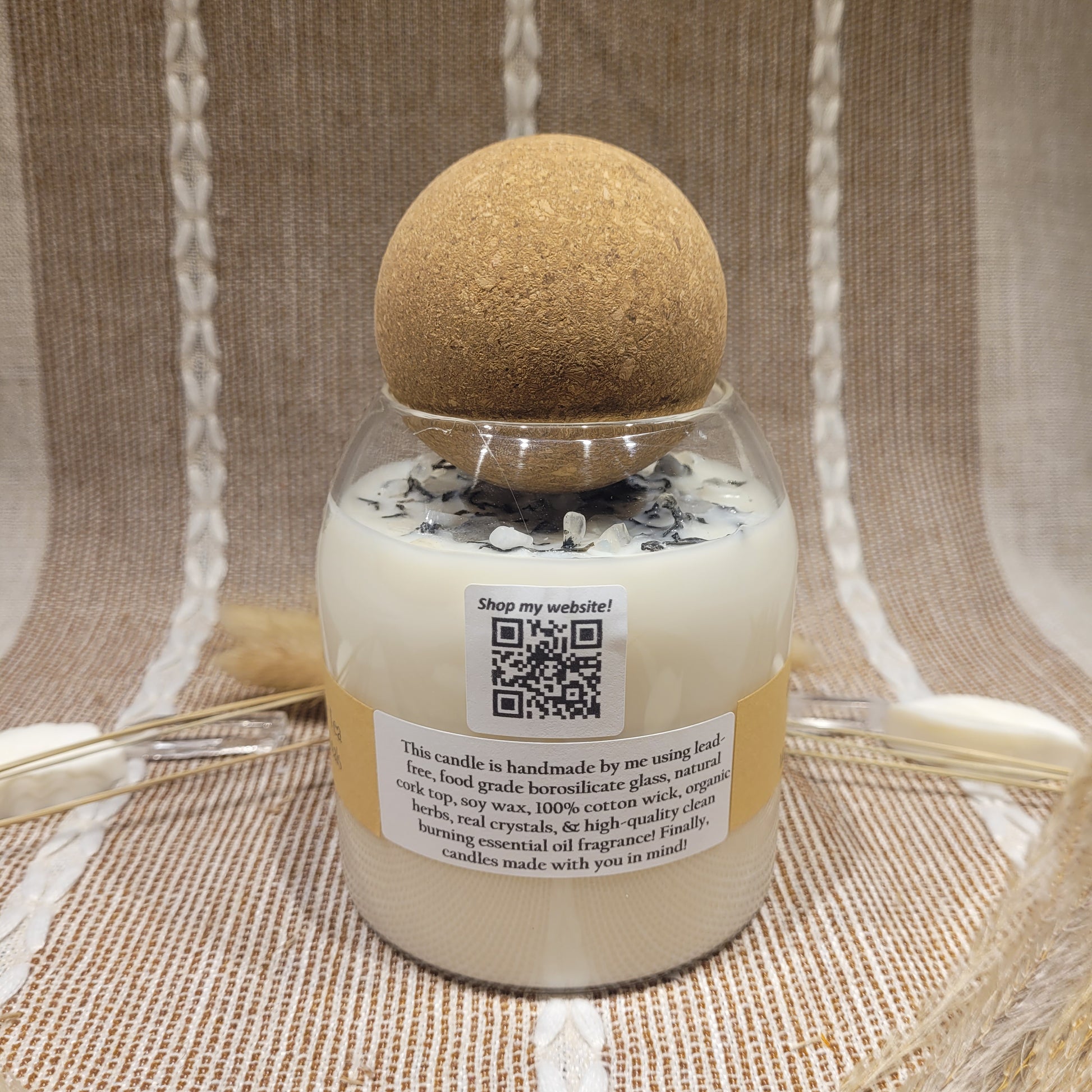 Handmade soy candles created with high-quality clean burning essential oil infused fragrance, 100% cotton wick, lead free borosilicate glass jar, natural cork lid, decorated with organic dried herbs and ethically sourced crystals in a 17 oz jar. Plus there is a hidden crystal on the bottom!