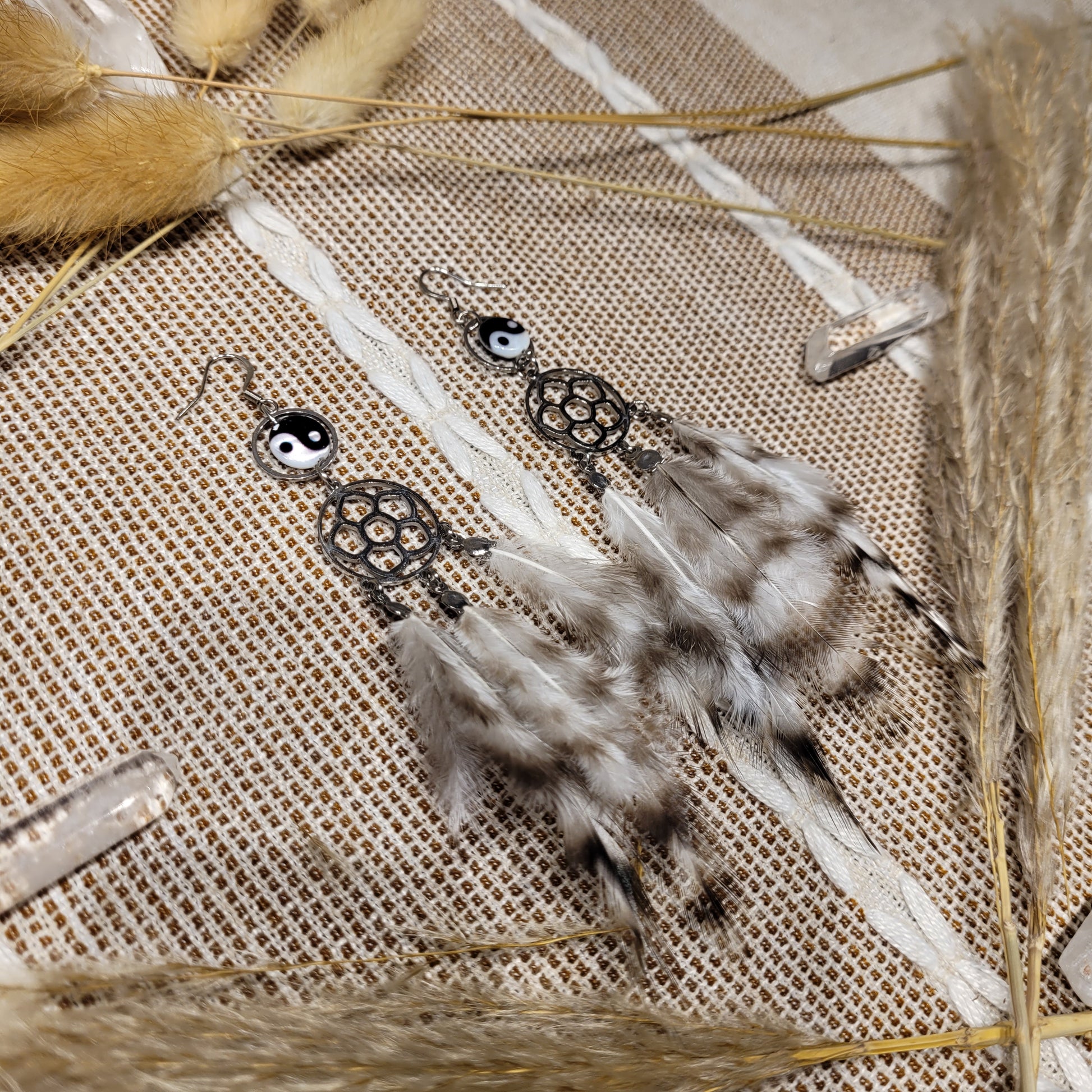 I created these lovely Ying Yang Shell Earrings with ethically sourced phesant feathers and high quality Ying Yang Shell beads, stainless steel mandala charms, and high quality stainless steel!