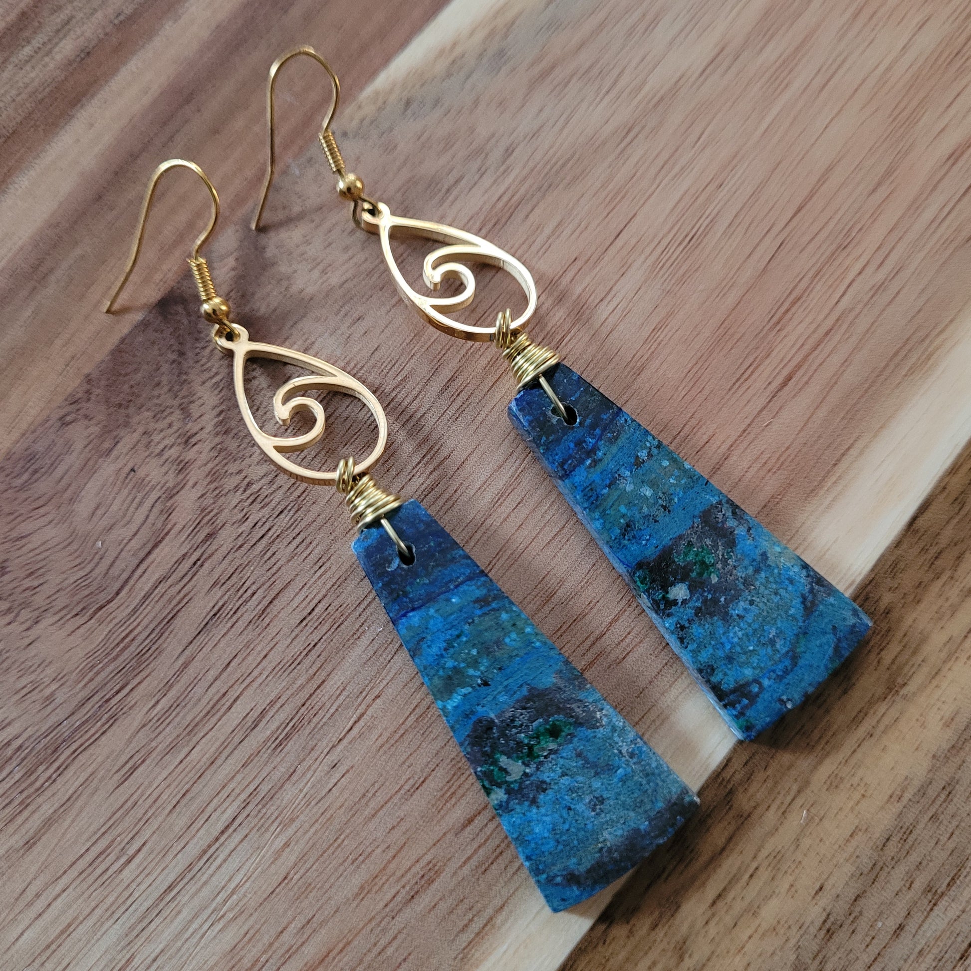 I created these Azurite Malachite Earrings with ethically sourced Azurite Malachite crystals from Arizona, USA, gold plated stainless steel wave beach charms, and stainless steel hooks!