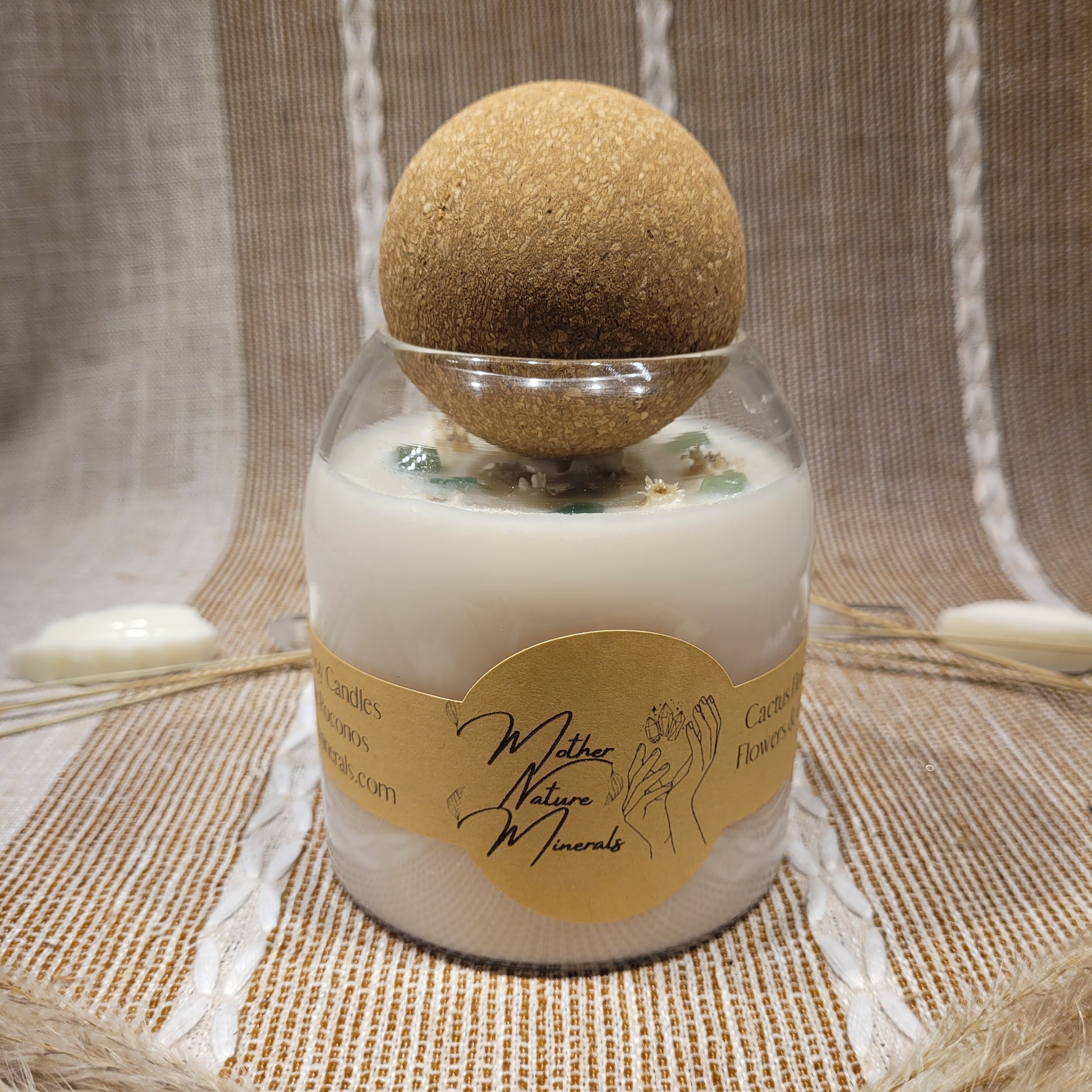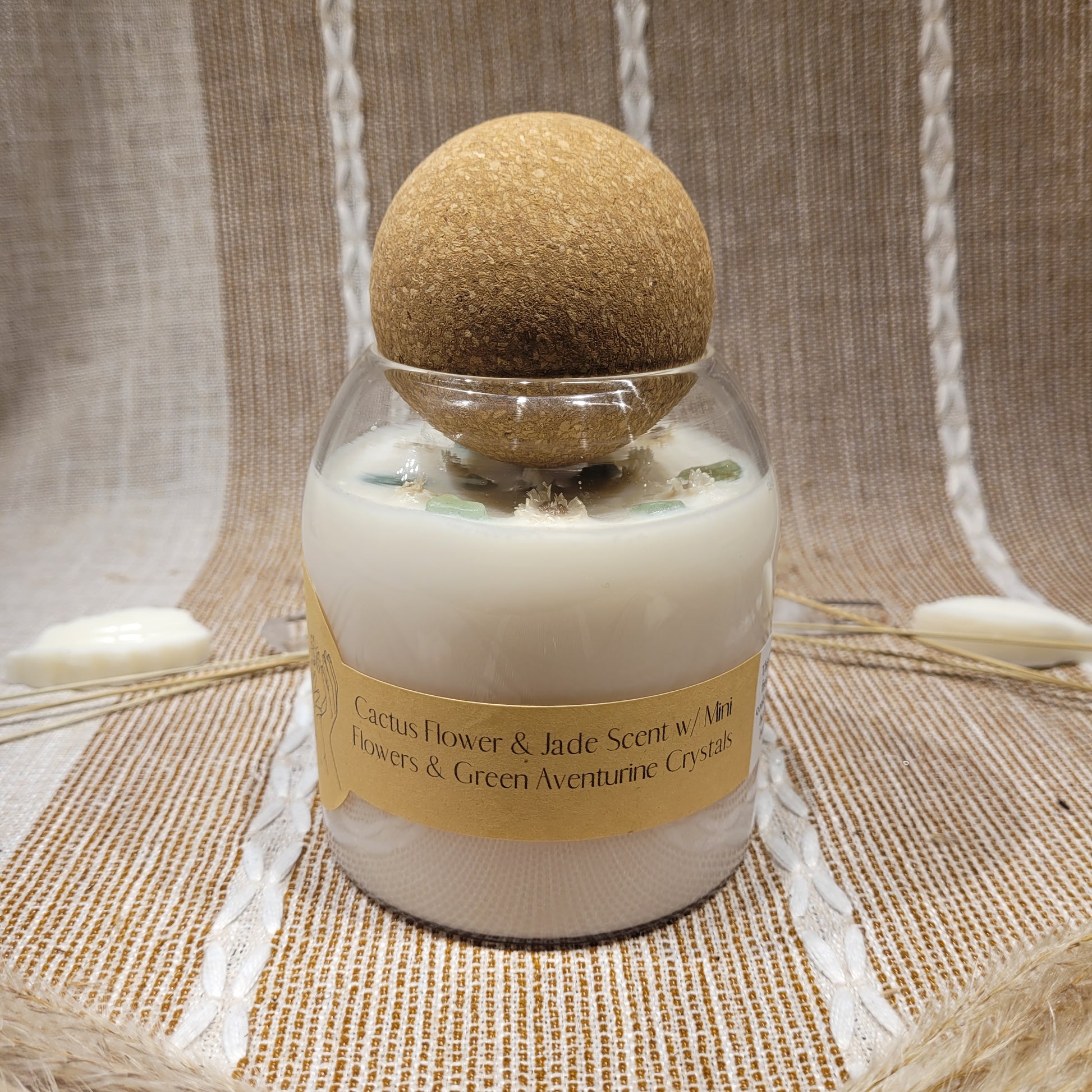 Cactus Flower and Jade scented candle decorated with mini flowers and Green Aventurine Crystal Chips on top!