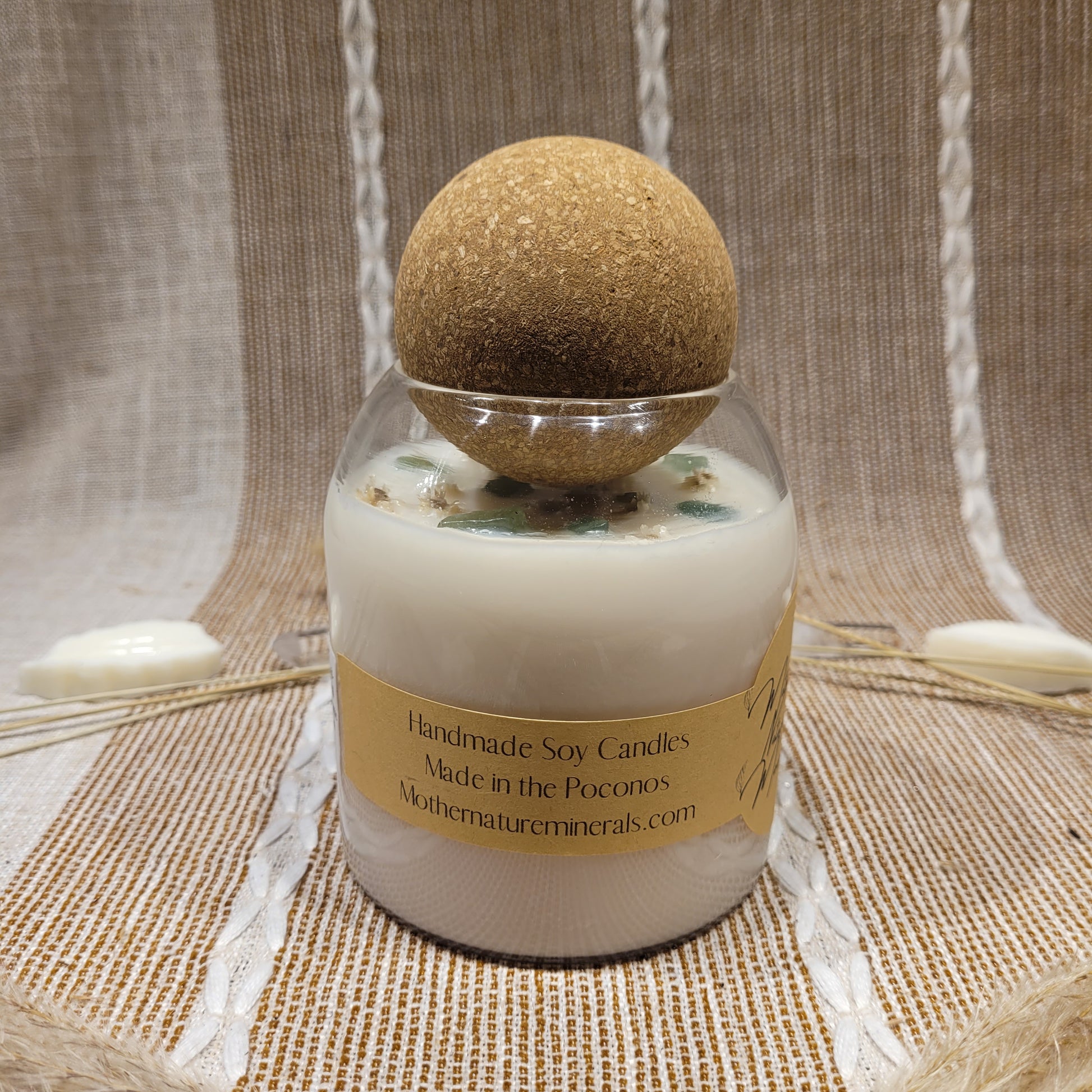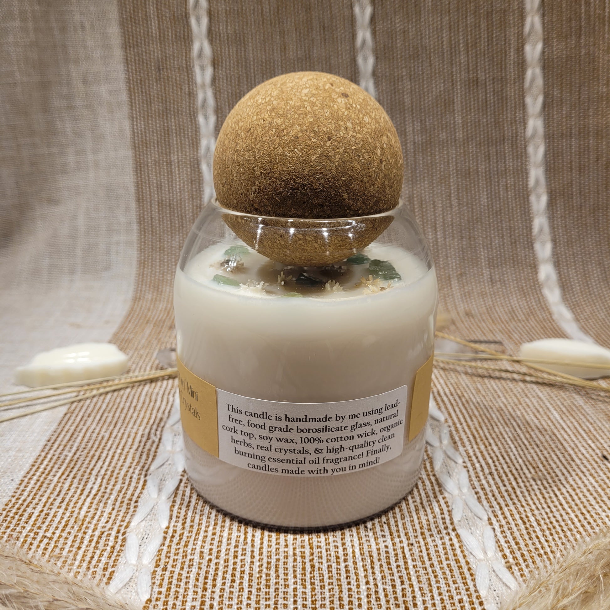 Handmade soy candles created with high-quality clean burning essential oil infused fragrance, 100% cotton wick, lead free borosilicate glass jar, decorated with organic dried herbs and ethically sourced crystals in a 17 oz Jar. Plus there is a hidden crystal on the bottom!