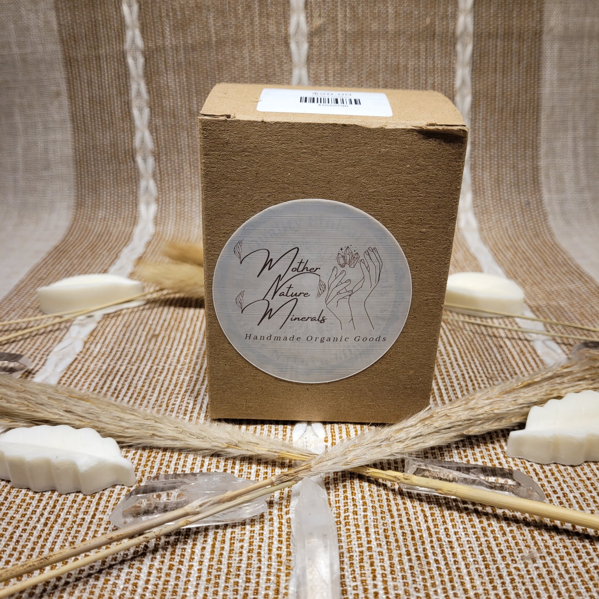 Handmade soy candles created with high-quality clean burning essential oil infused fragrance, 100% cotton wick, lead free borosilicate glass jar, decorated with organic dried herbs and ethically sourced crystals in a 3.4 oz Jar. Plus there is a hidden crystal on the bottom!