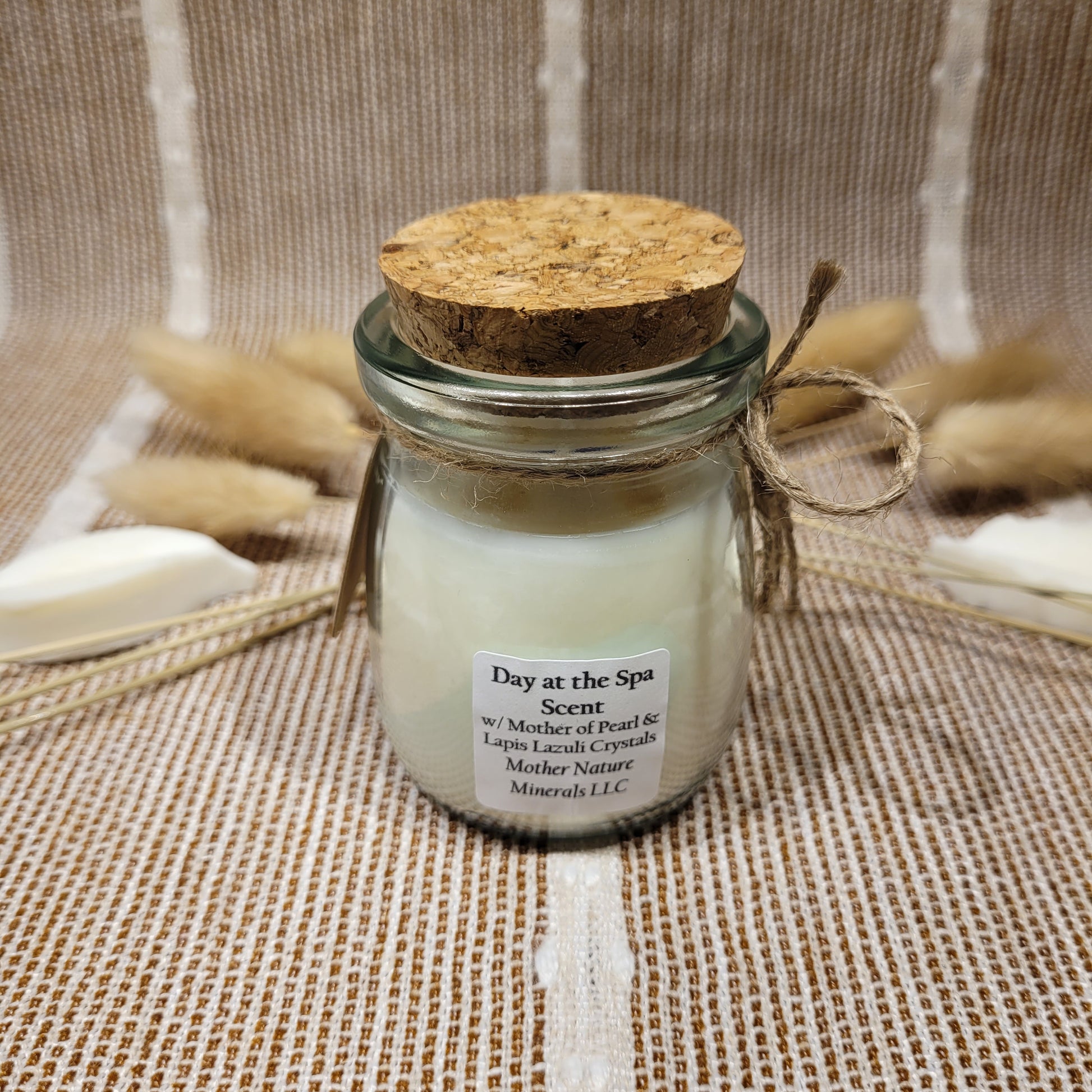 Day at the Spa scented candle with decorated with Mother of Pearl and Lapis Lazuli Crystal chips on top!