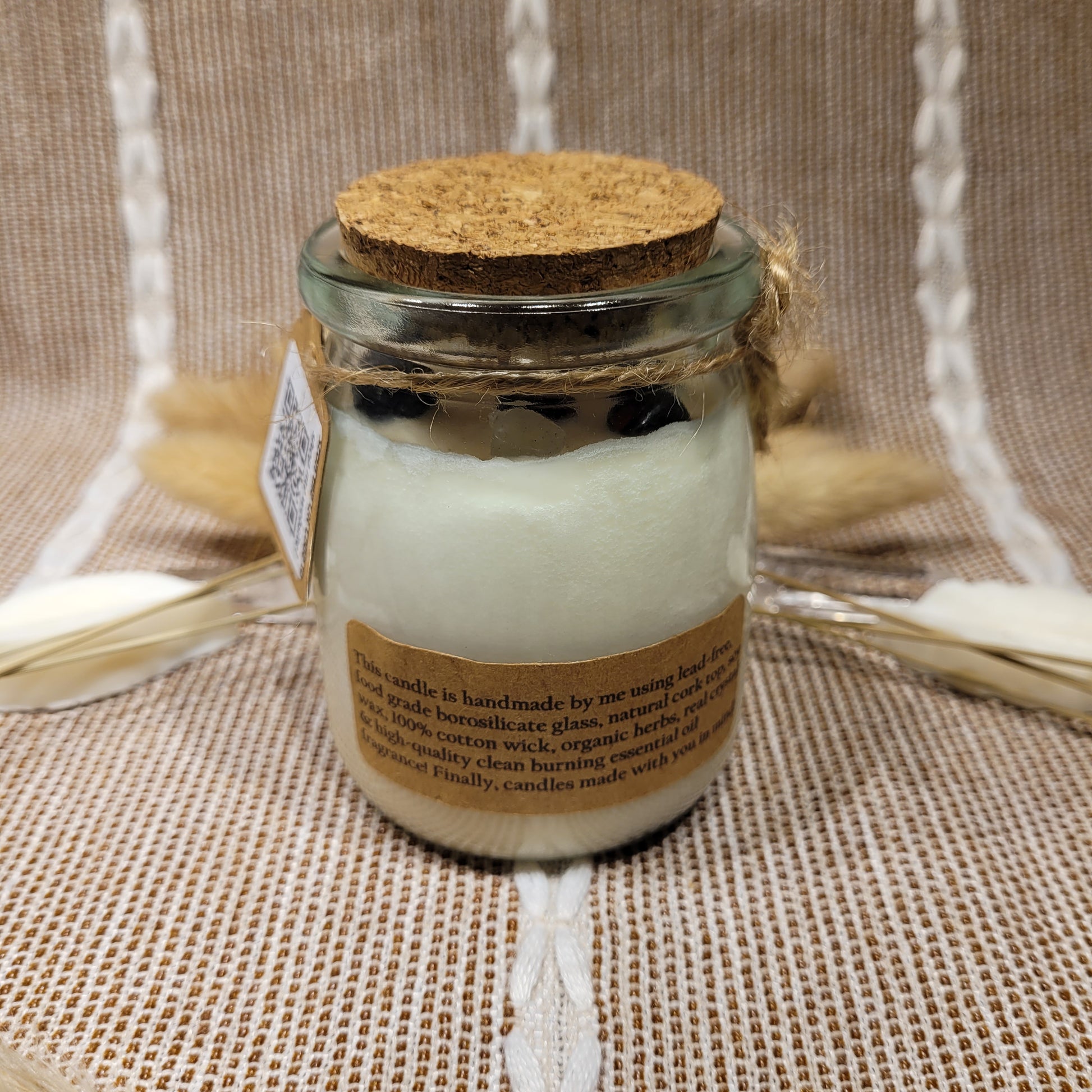 Handmade soy candles created with high-quality clean burning essential oil infused fragrance, 100% cotton wick, lead free borosilicate glass jar, decorated with organic dried herbs and ethically sourced crystals in a 7 oz Jar. Plus there is a hidden crystal on the bottom!