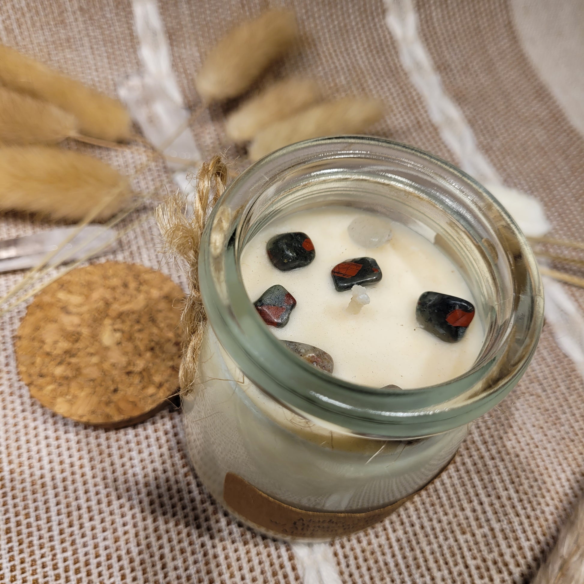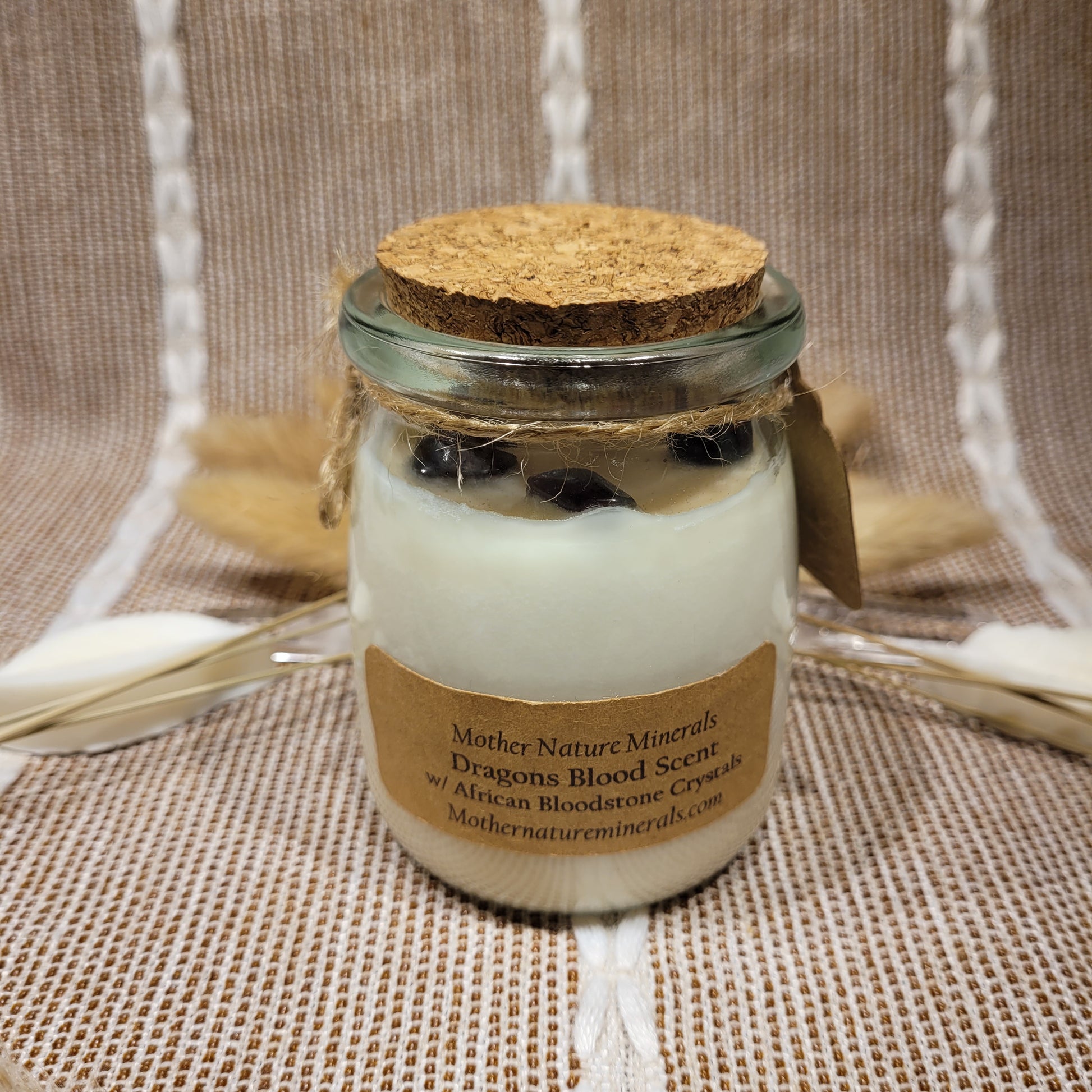 This candle has a lovely Dragons Blood scented and decorated with African Bloodstone crystal chips on top!