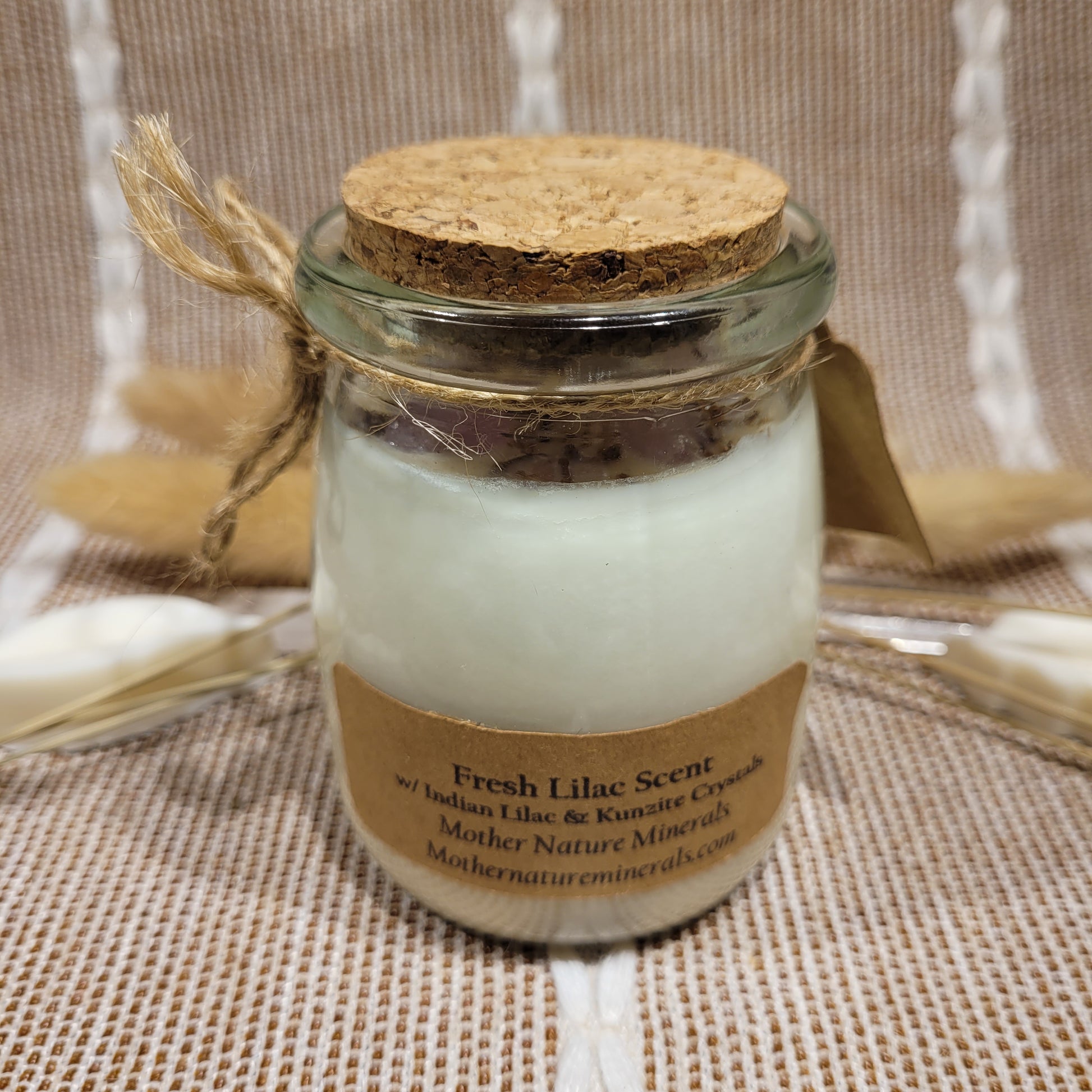 This candle has a lovely Fresh Lilac scent and is decorated with ethically sourced Kunzite Crystal chips on top!