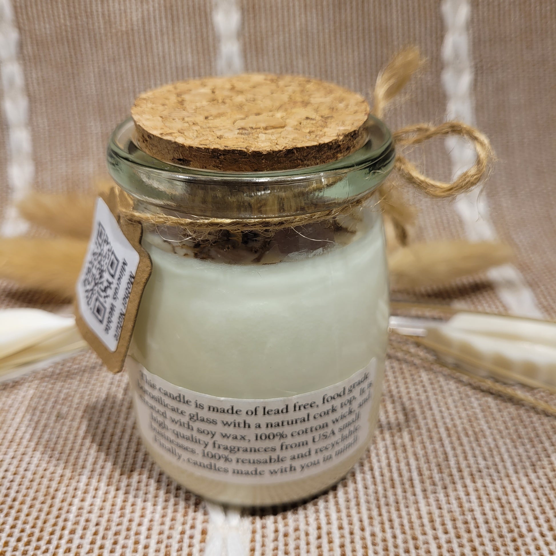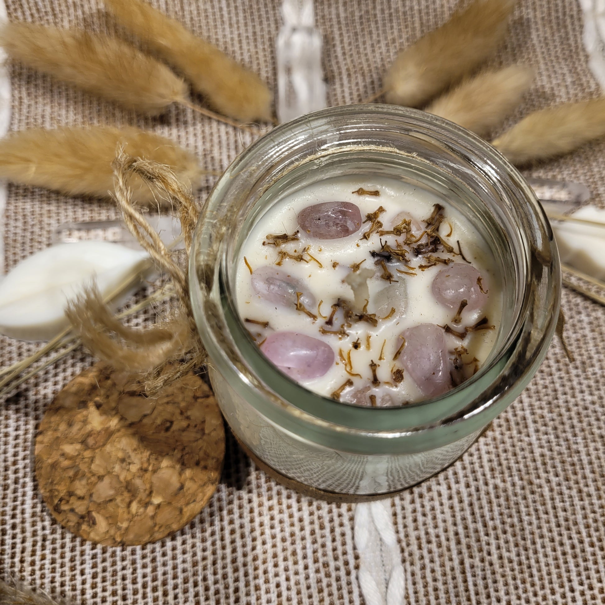 Handmade soy candles created with high-quality clean burning essential oil infused fragrance, 100% cotton wick, lead free borosilicate glass jar, decorated with organic dried herbs and ethically sourced crystals in a 7 oz Jar. Plus there is a hidden crystal on the bottom!