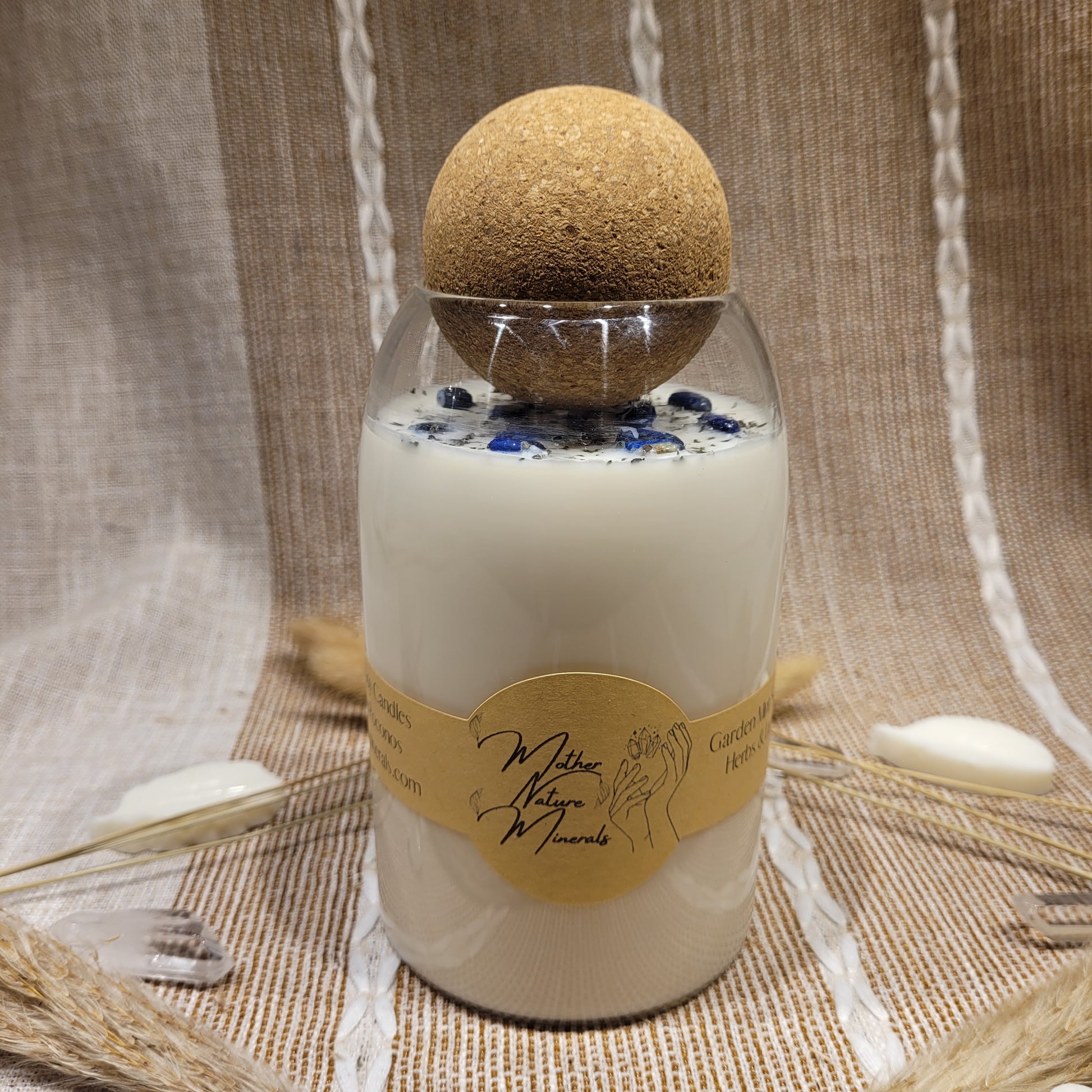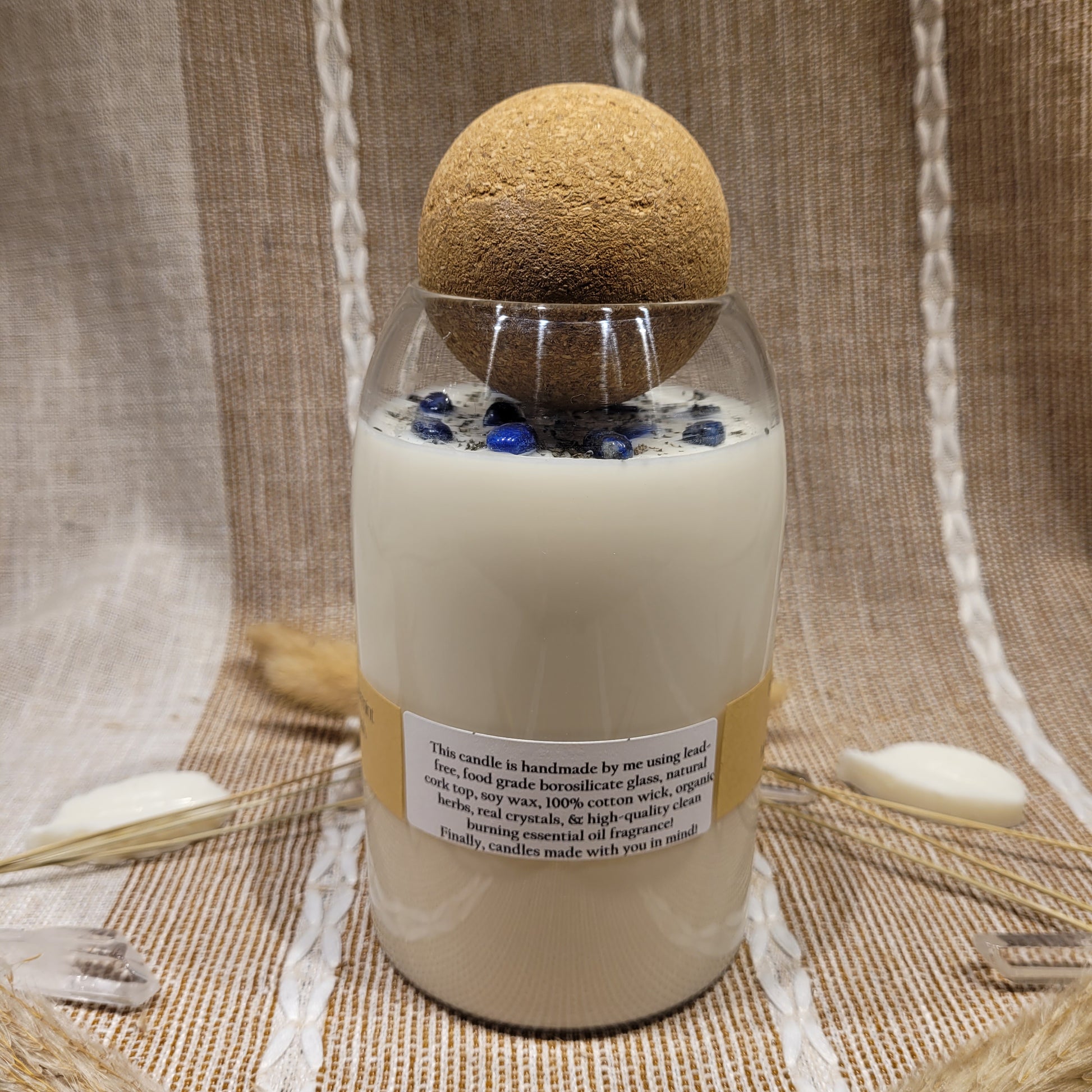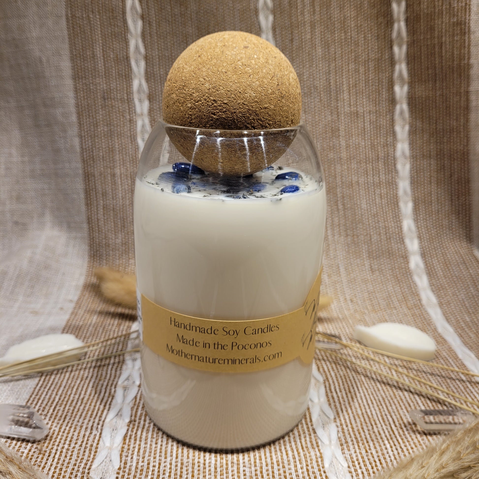 Handmade soy candles created with high-quality clean burning essential oil infused fragrance, 100% cotton wick, lead free borosilicate glass jar, decorated with organic dried herbs and ethically sourced crystals in a 25 oz Jar. Plus there is a hidden crystal on the bottom!