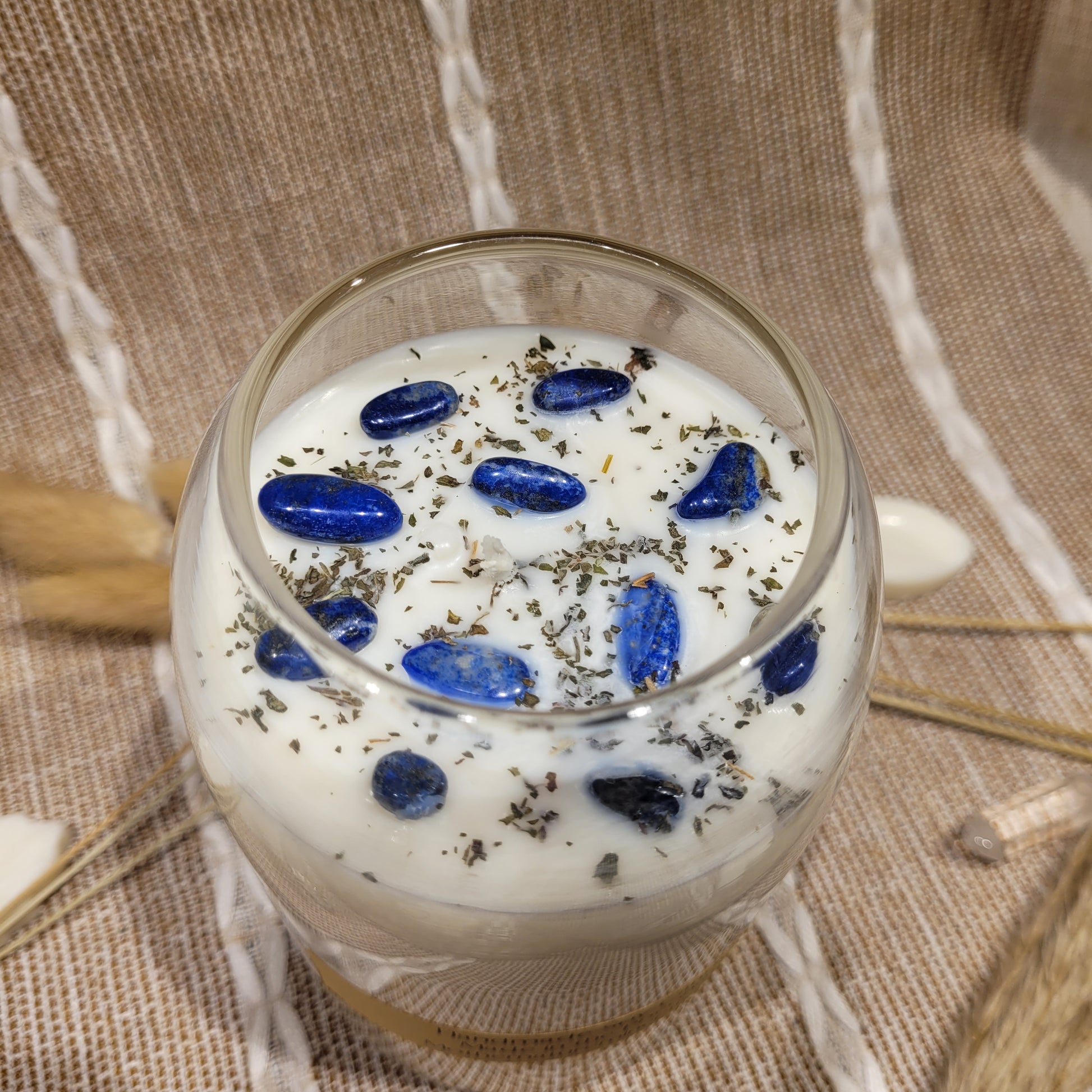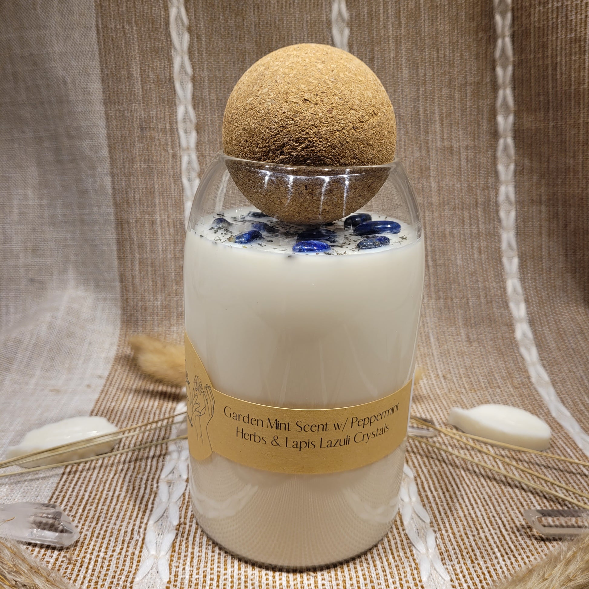 This candle has a lovely a Garden Mint scent and decorated with Peppermint herbs and Lapis Lazuli crystal chips on top!