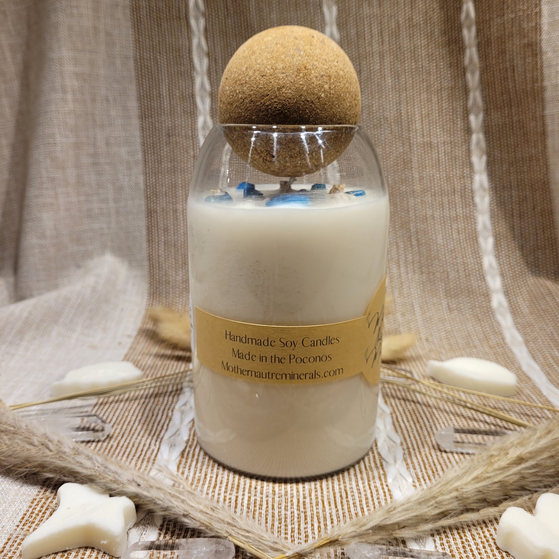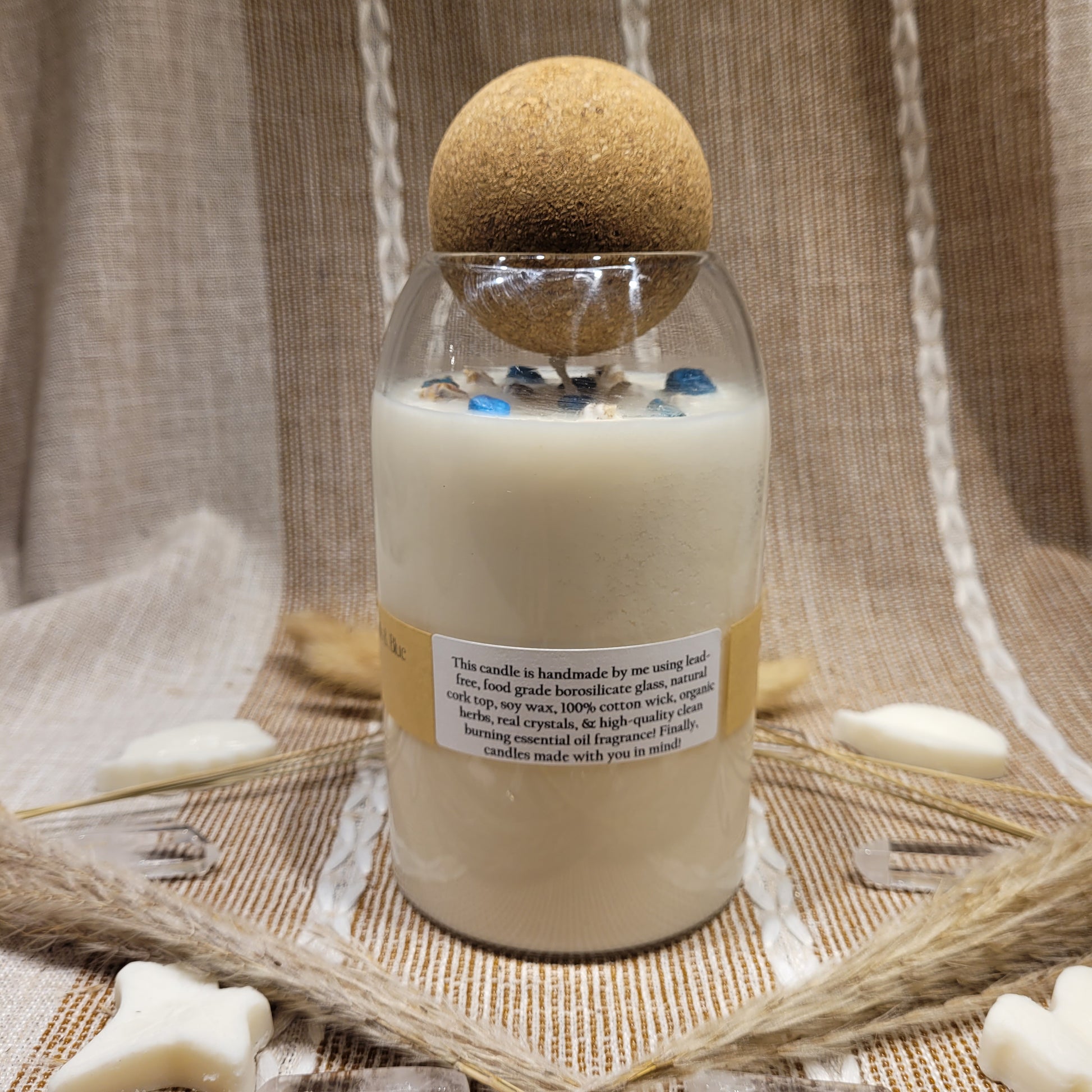 Handmade soy candles created with high-quality clean burning essential oil infused fragrance, 100% cotton wick, lead free borosilicate glass jar, decorated with organic dried herbs and ethically sourced crystals in a 25 oz Jar. Plus there is a hidden crystal on the bottom!