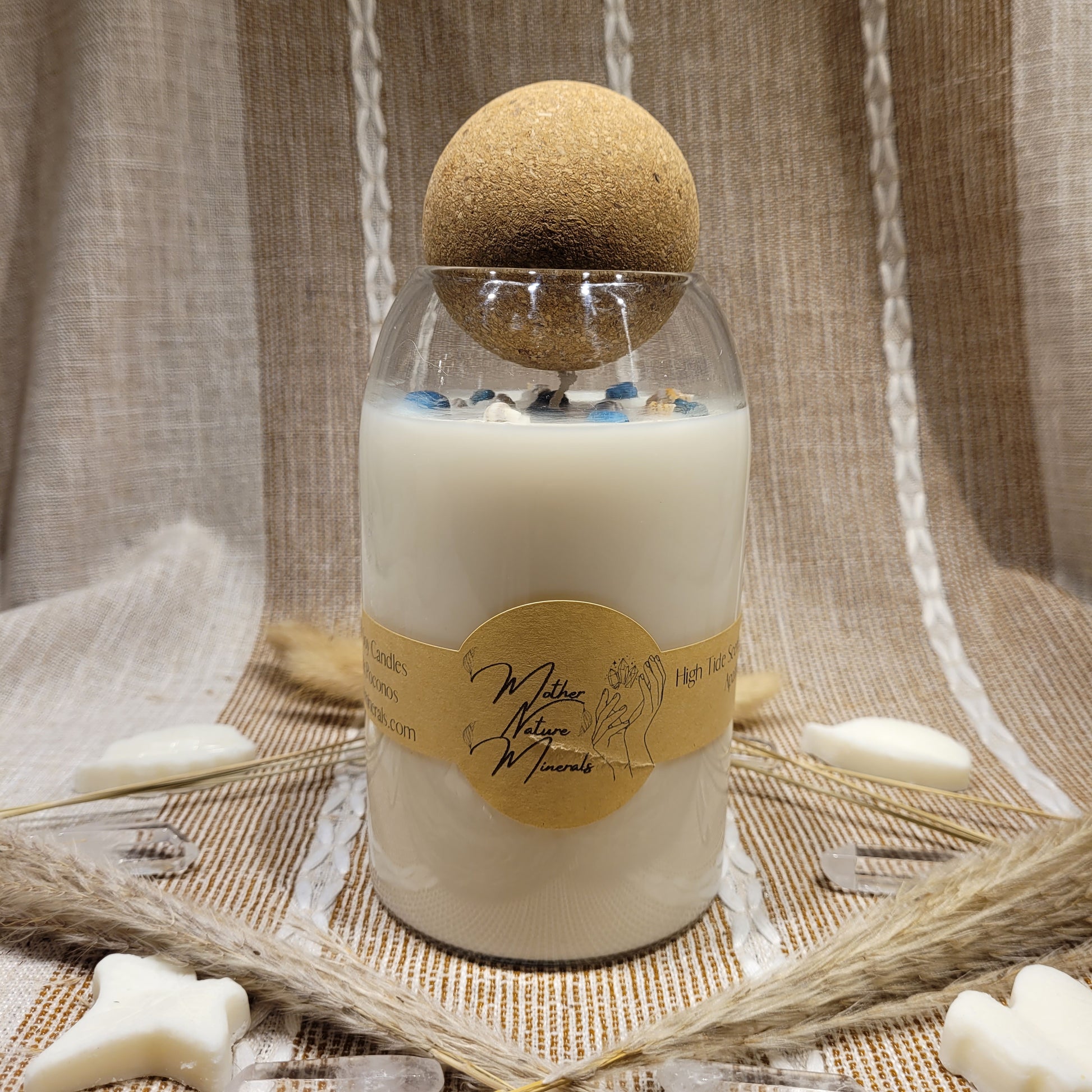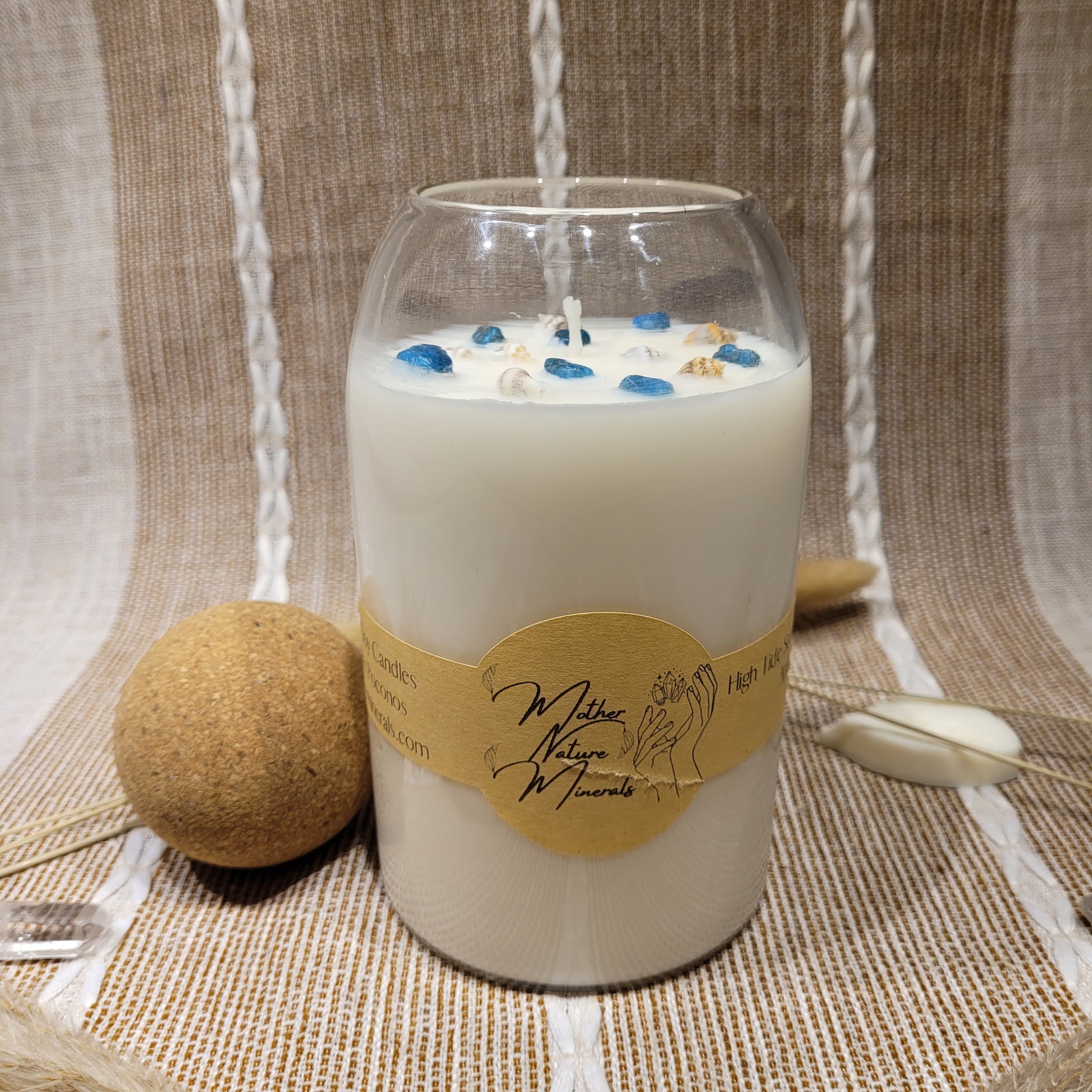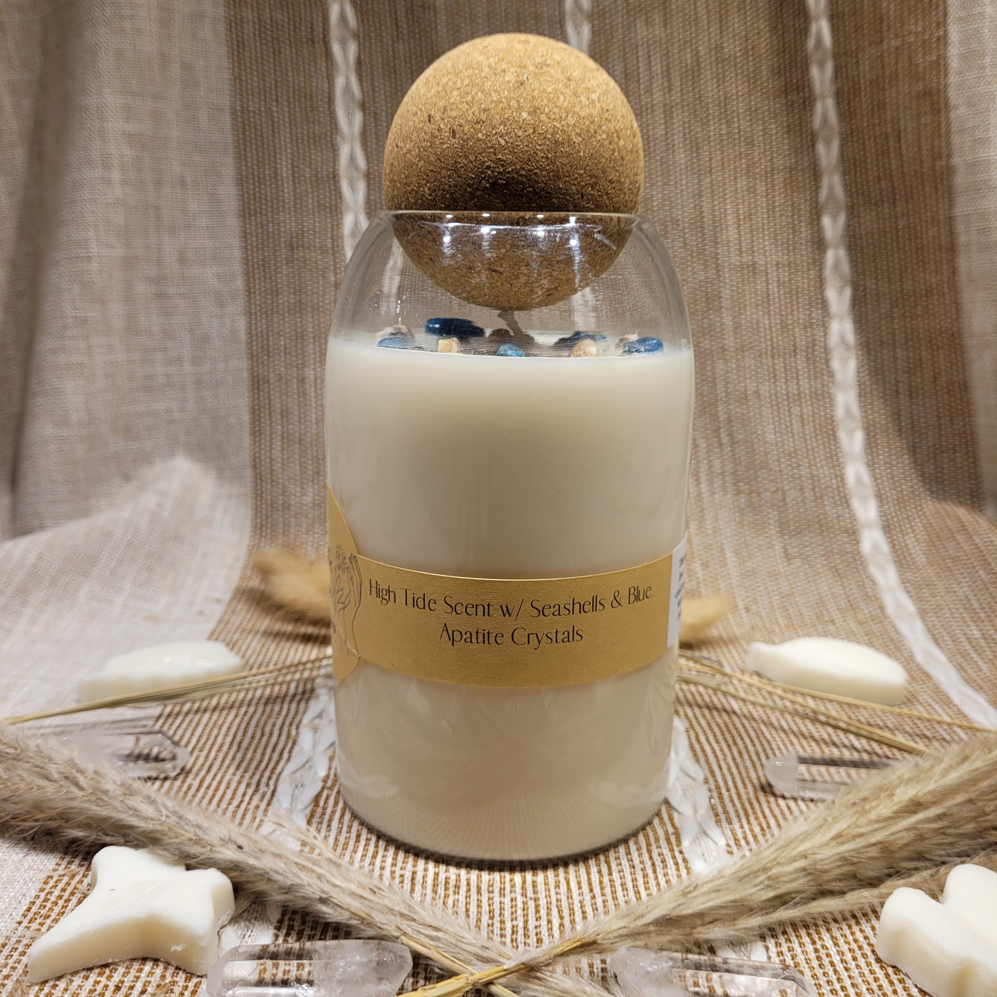 This candle has a lovely a High Tide scent and is decorated with sea shells and Blue Apatite Crystal chips on top!