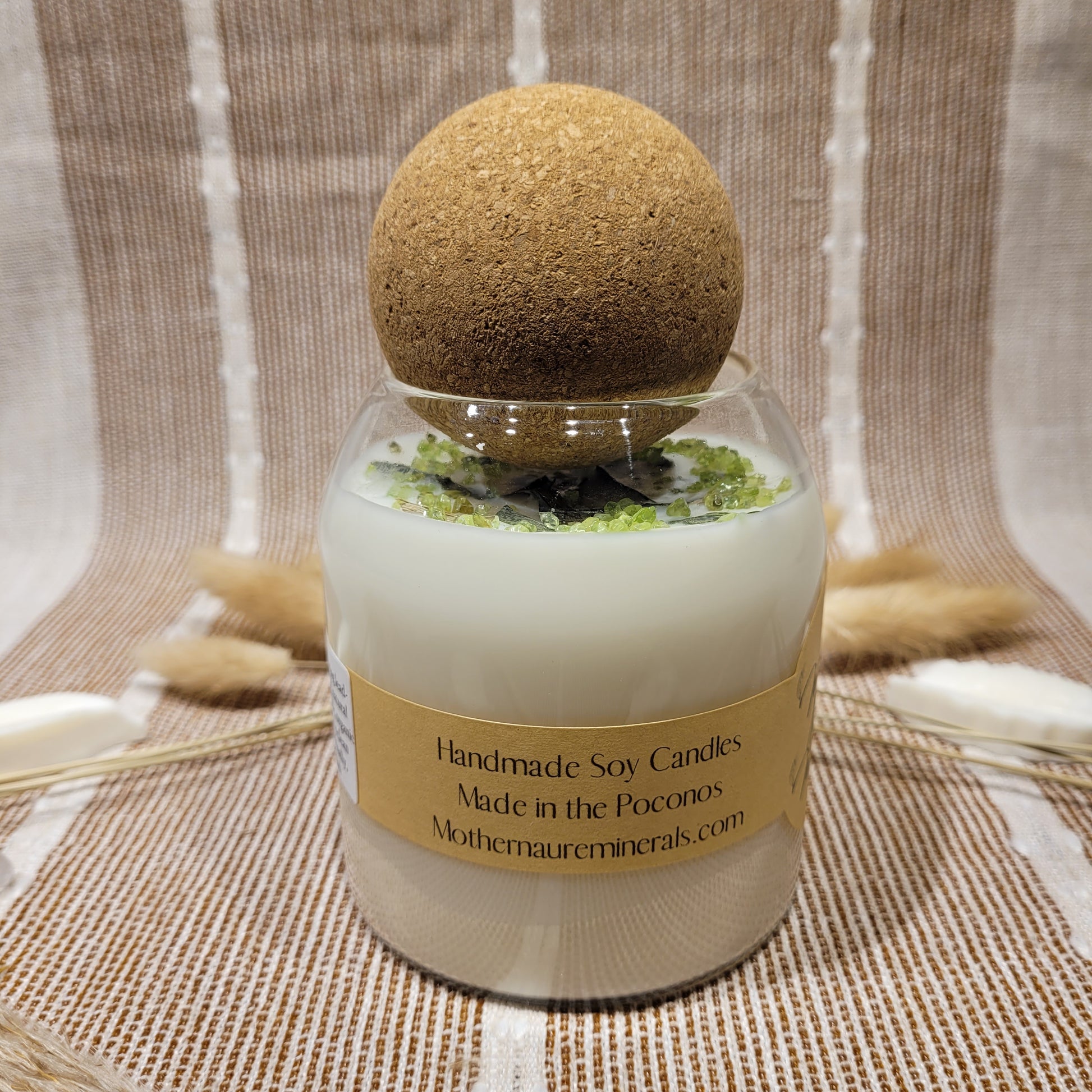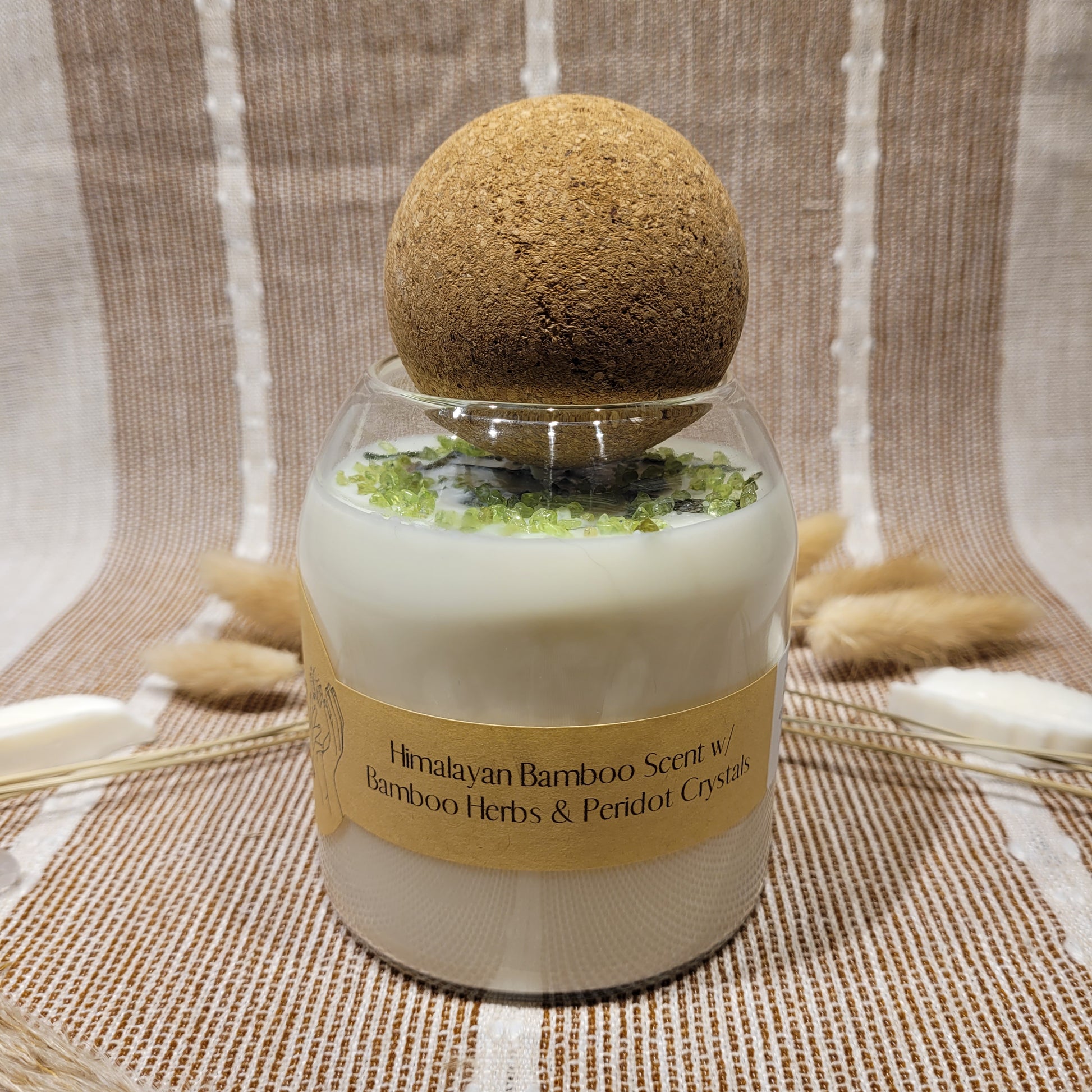 This candle has a lovely Himalayan Bamboo scent and is decorated with Bamboo herbs and Peridot chips on top!