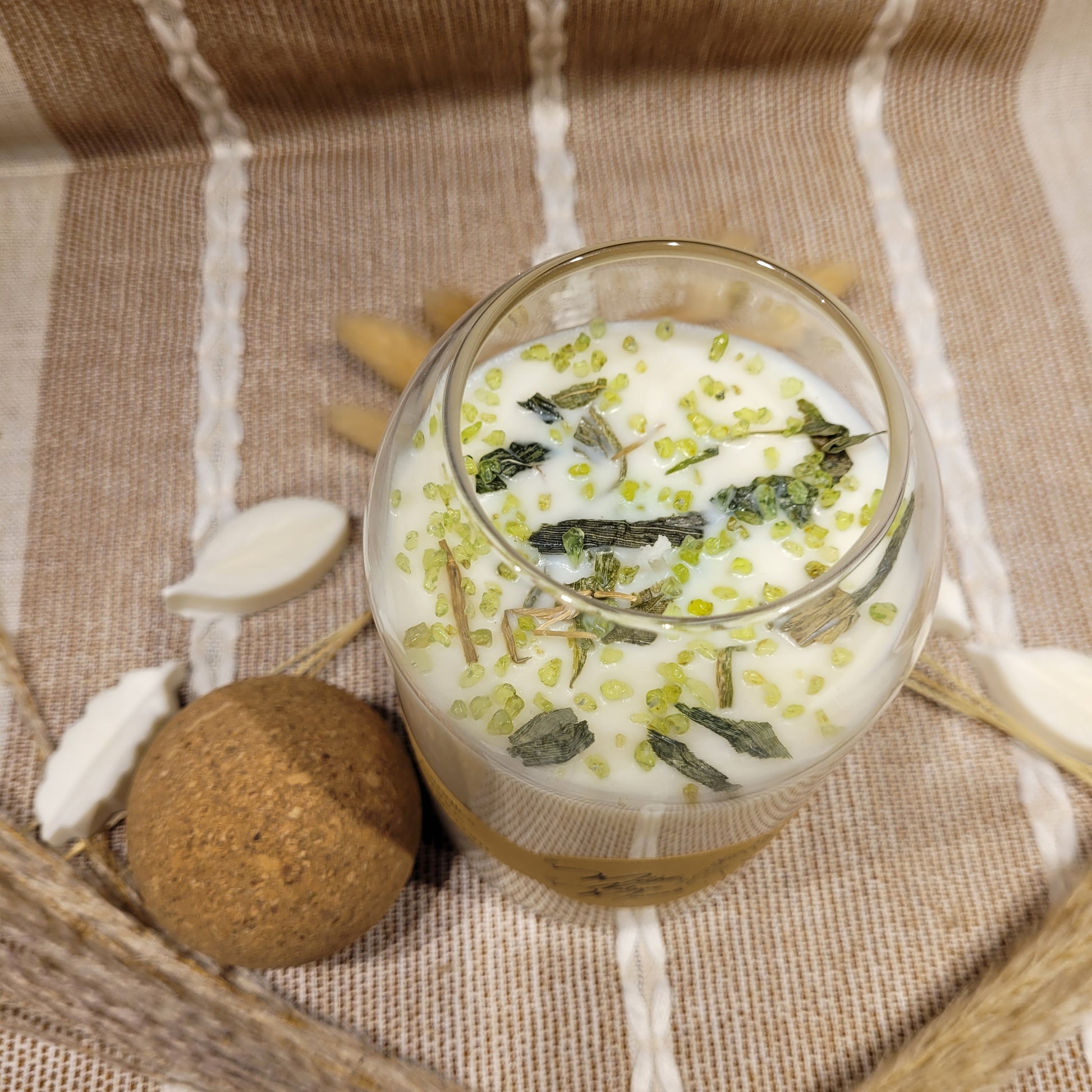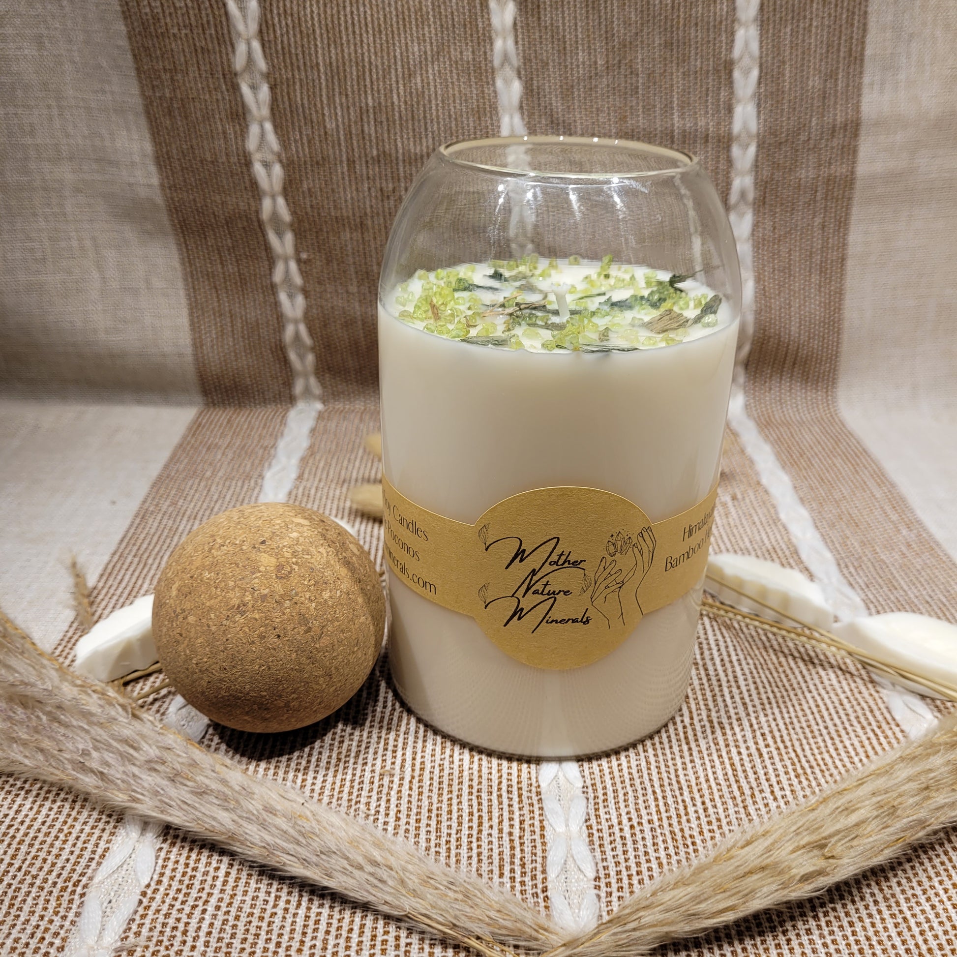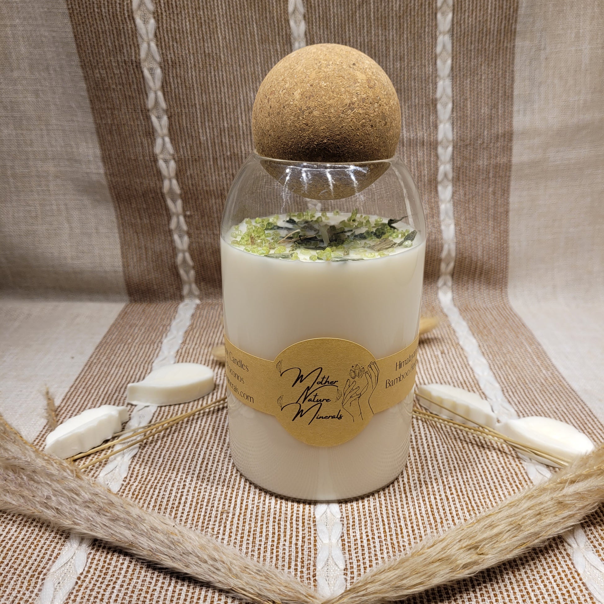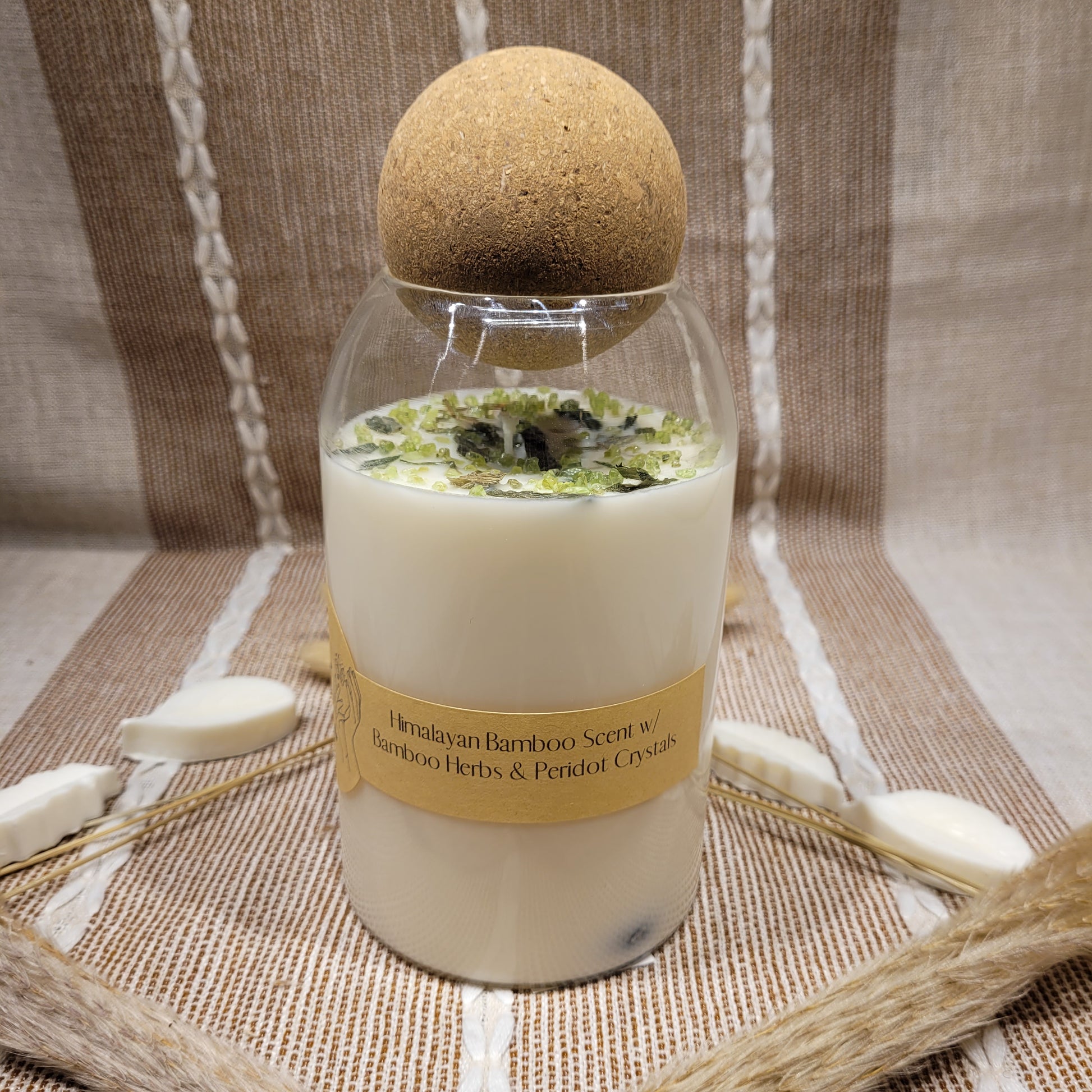 This candle has a lovely Himalayan Bamboo scent and is decorated with Bamboo herbs and Peridot chips on top!