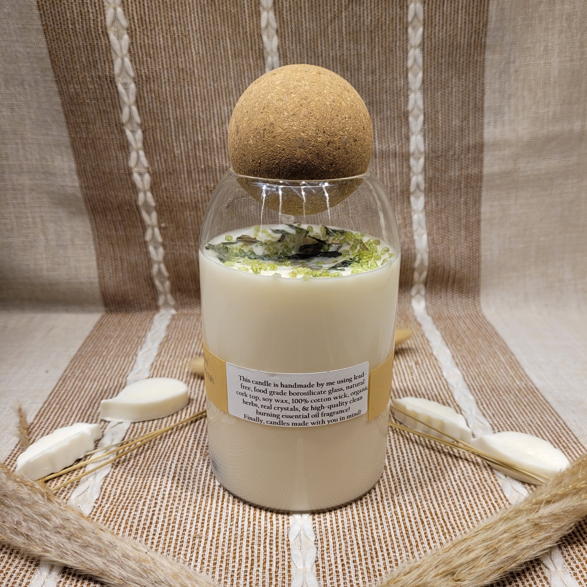 Handmade soy candles created with high-quality clean burning essential oil infused fragrance, 100% cotton wick, lead free borosilicate glass jar, decorated with organic dried herbs and ethically sourced crystals in a 25 oz Jar. Plus there is a hidden crystal on the bottom!