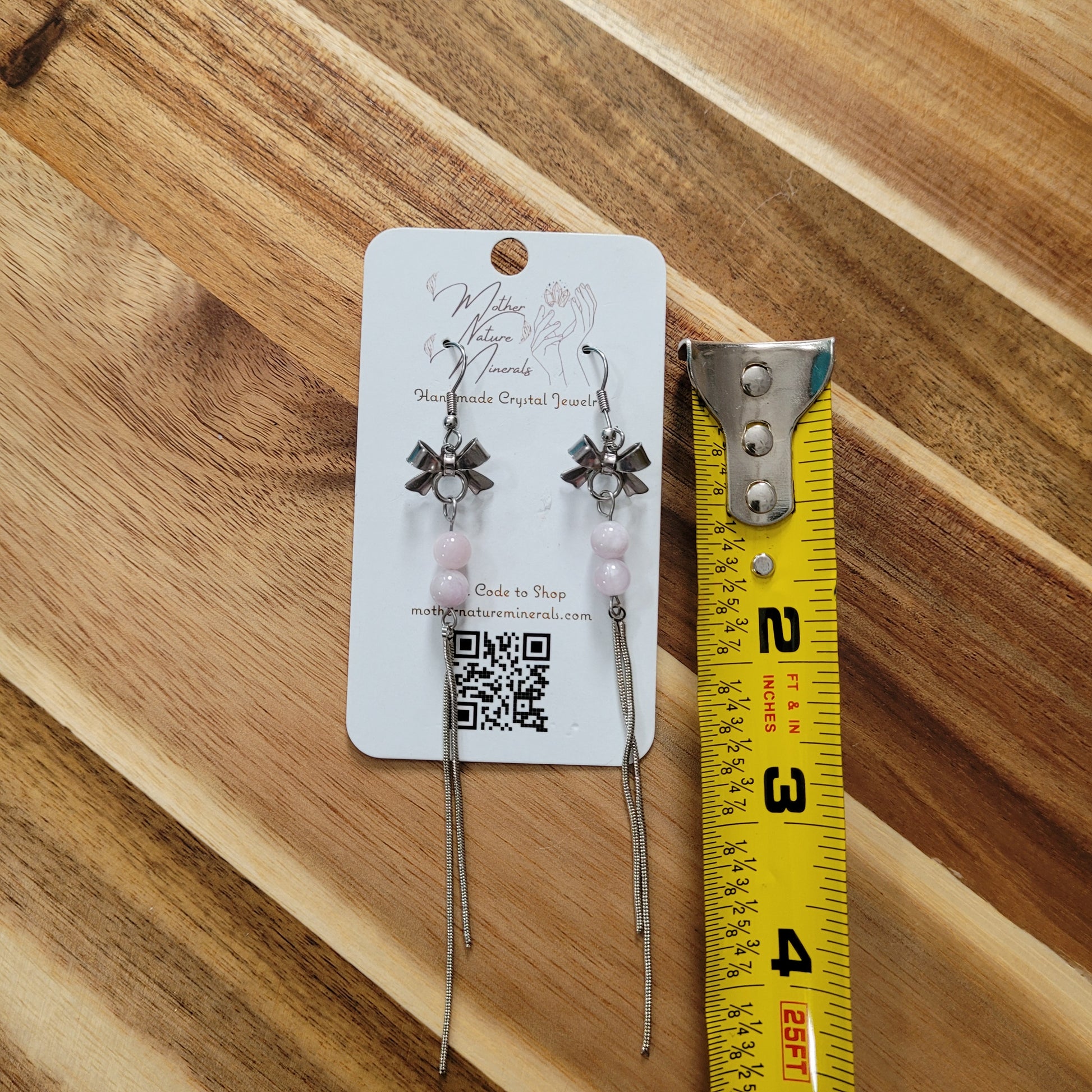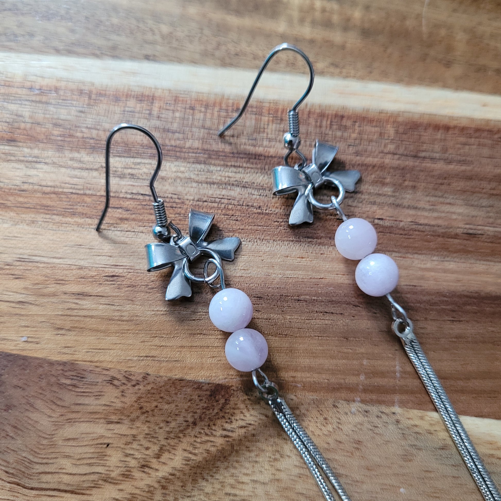 I created these lovely Kunzite Earrings with high quality Kunzite crystal beads, stainless steel bow and fringe charms, and stainless steel hooks!
