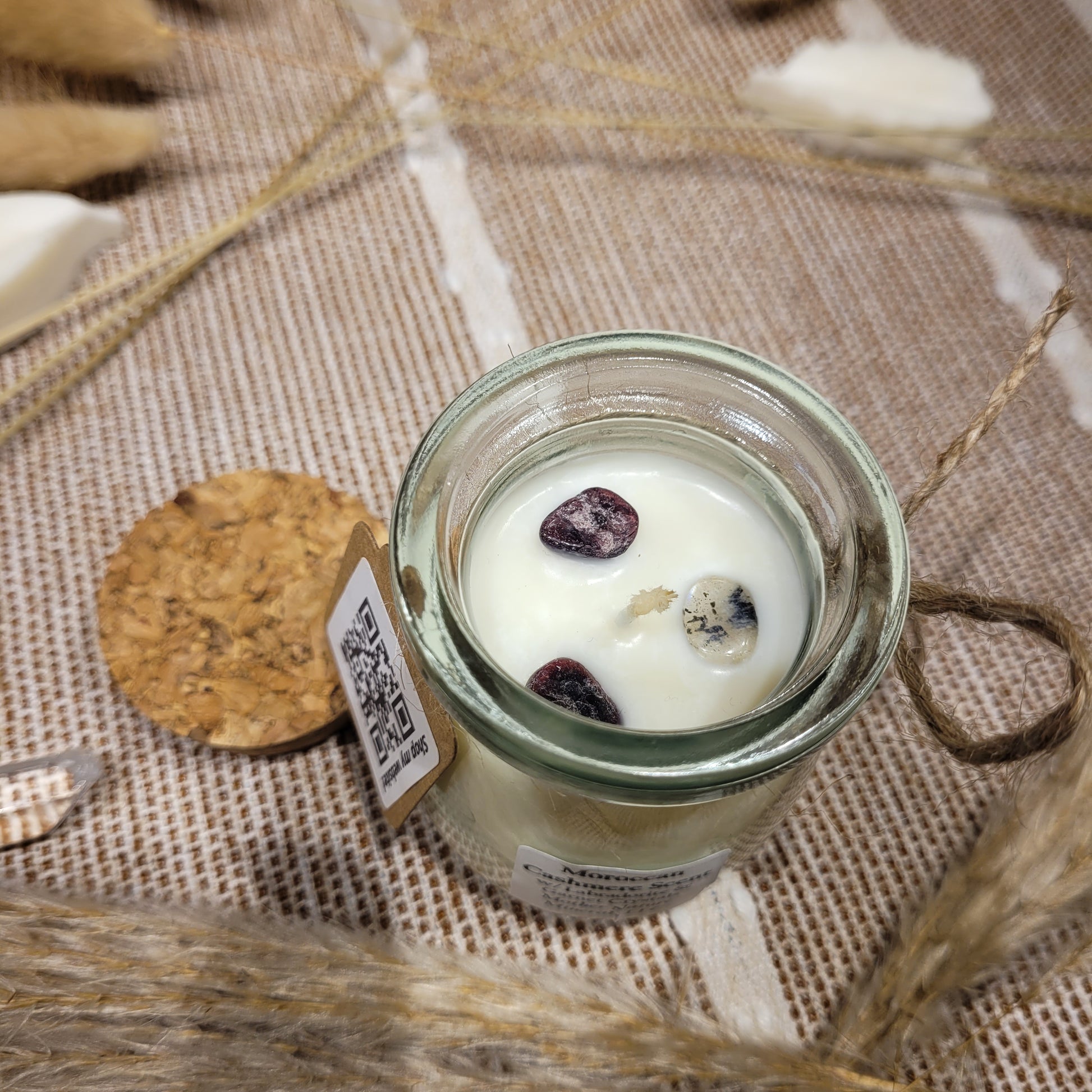 This candle has a lovely Moroccan Cashmere scent and is decorated with Labradorite and Garnet Crystal chips on top!