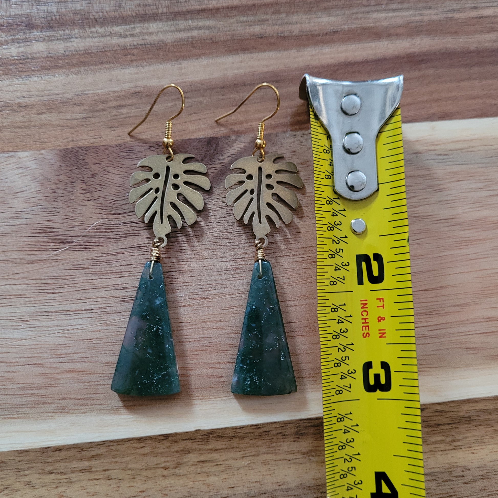 I created these beautiful Moss Agate Earrings with ethically sourced Moss Agate crystals from India and high quality brass monstera plant charms, brass wire, and gold stainless steel hooks!