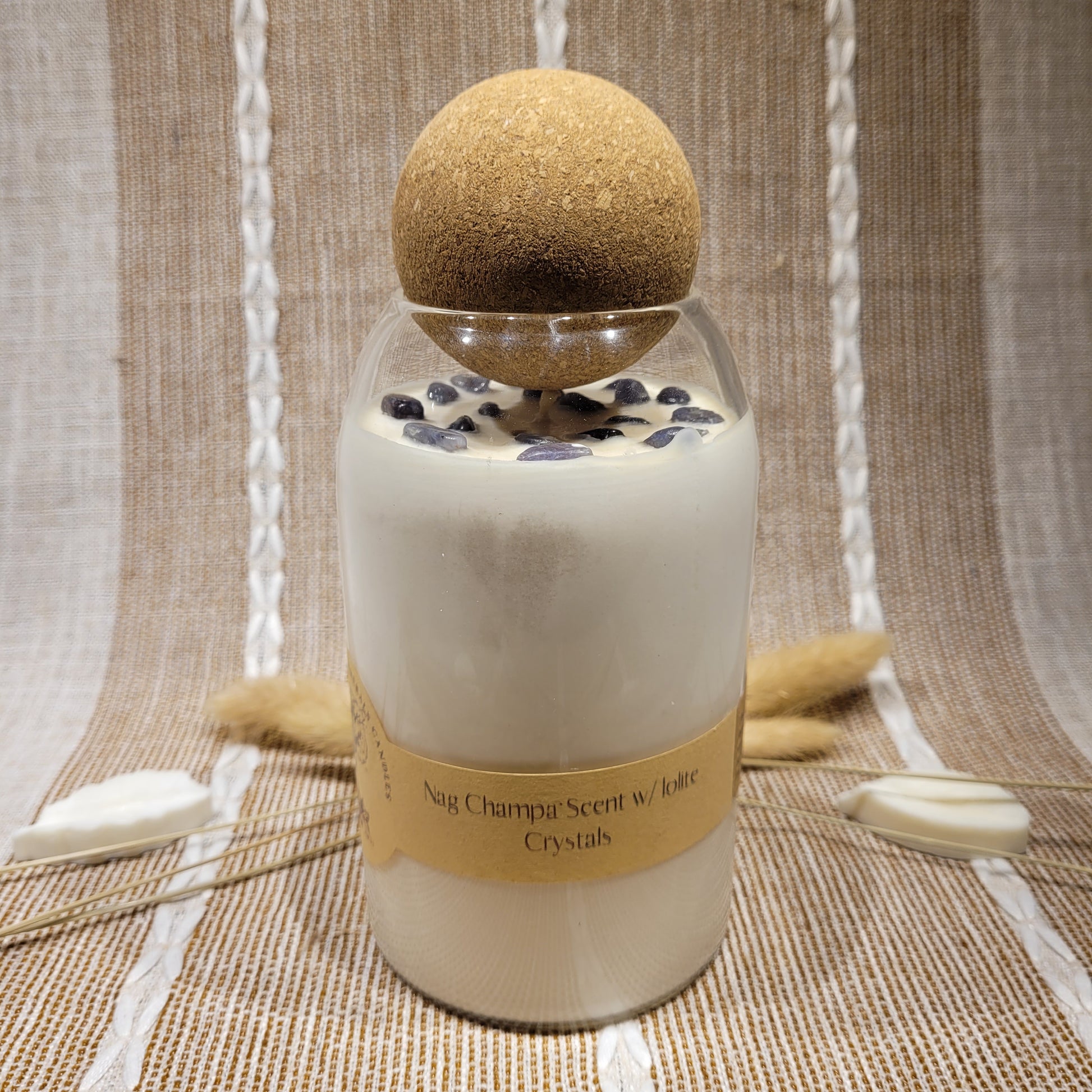 This candle has a lovely Nag Champa scent and is decorated with Iolite Crystal chips on top!