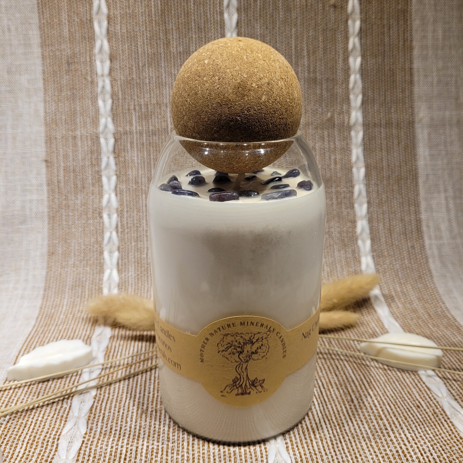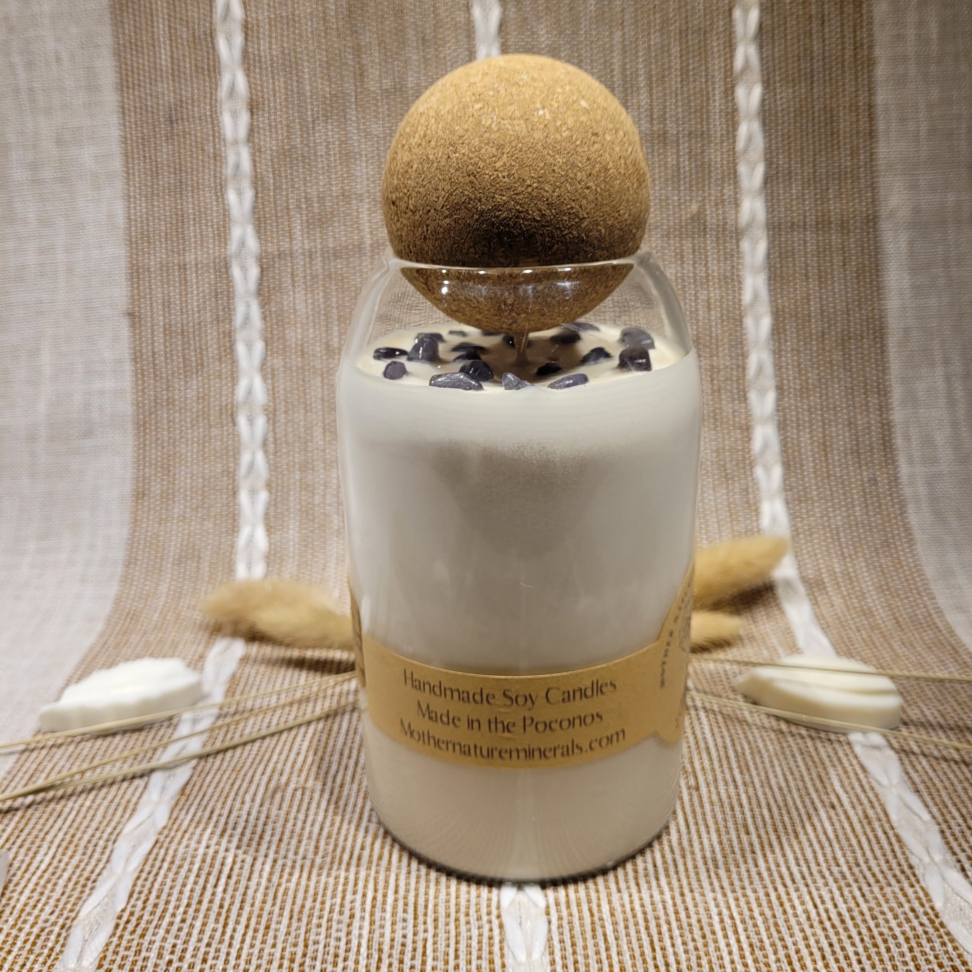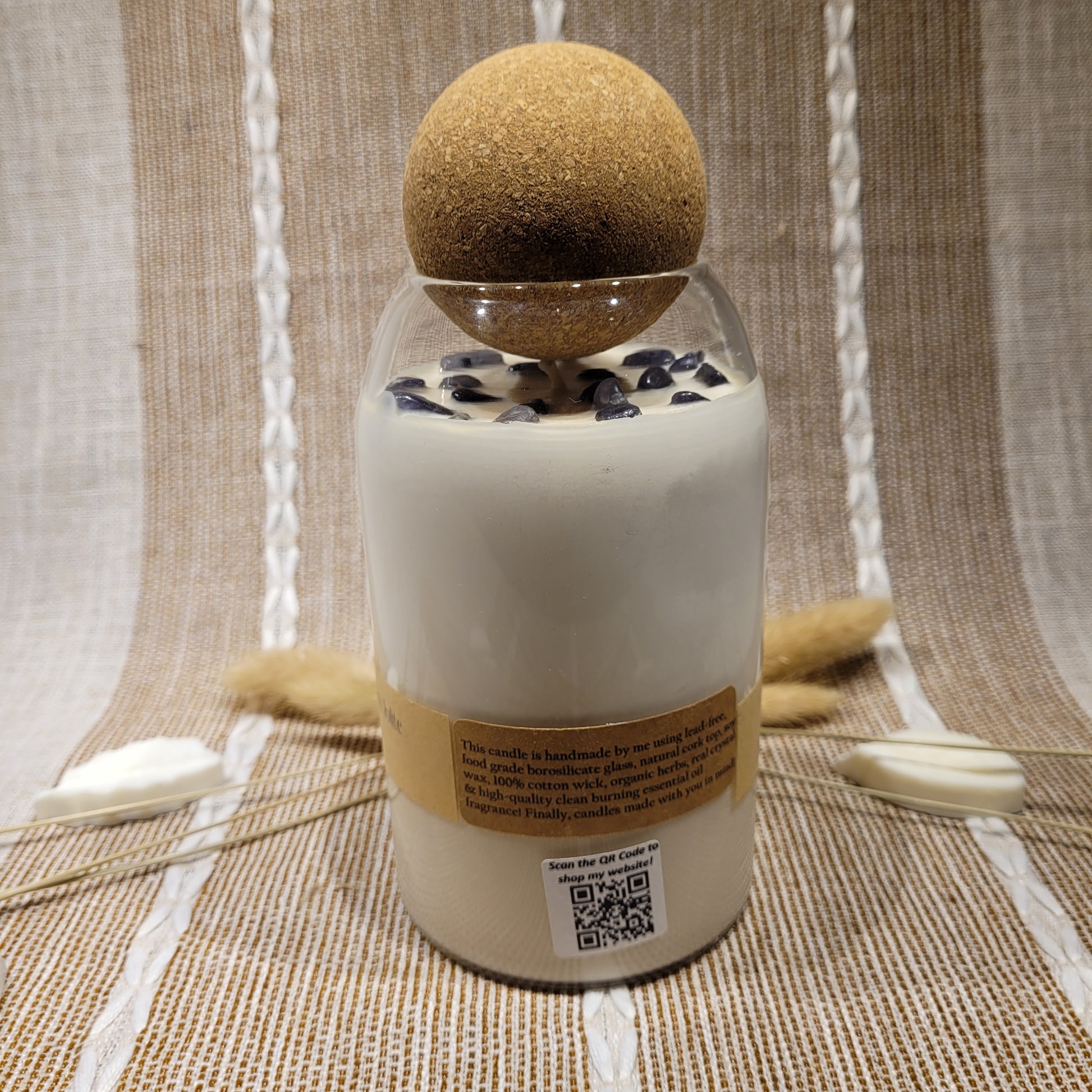 Handmade soy candles created with high-quality clean burning essential oil infused fragrance, 100% cotton wick, lead free borosilicate glass jar, natural cork lid, decorated with organic dried herbs and ethically sourced crystals in a 25 oz jar. Plus there is a hidden crystal on the bottom!