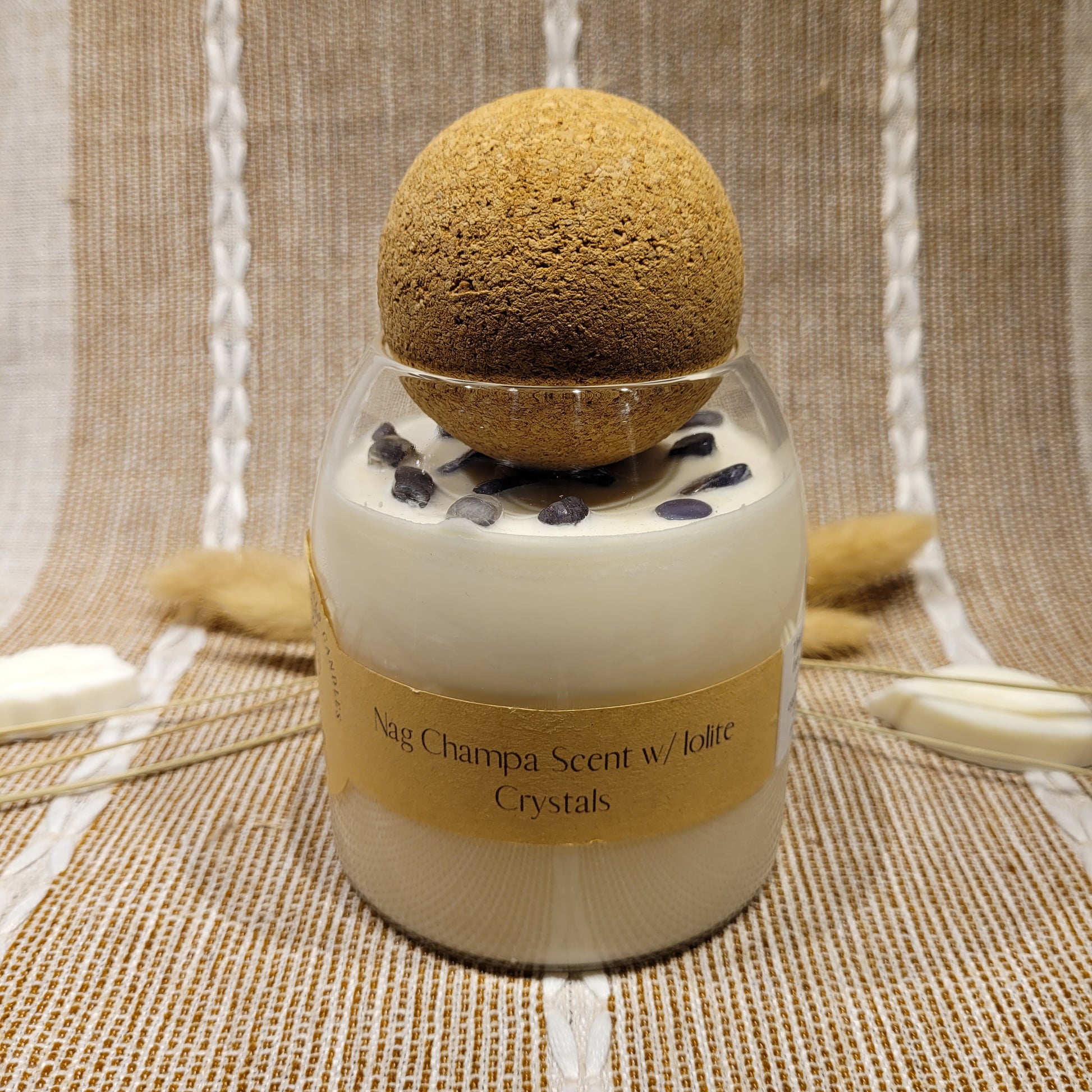 This candle has a lovely Nag Champa scent and is decorated with Iolite Crystal chips on top!