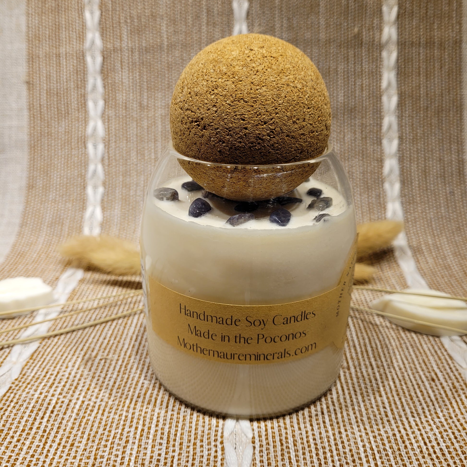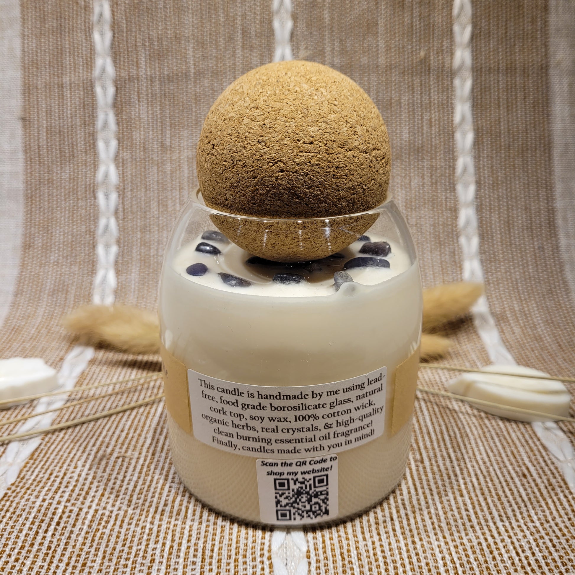 Handmade soy candles created with high-quality clean burning essential oil infused fragrance, 100% cotton wick, lead free borosilicate glass jar, natural cork lid, decorated with organic dried herbs and ethically sourced crystals in a 17 oz jar. Plus there is a hidden crystal on the bottom!