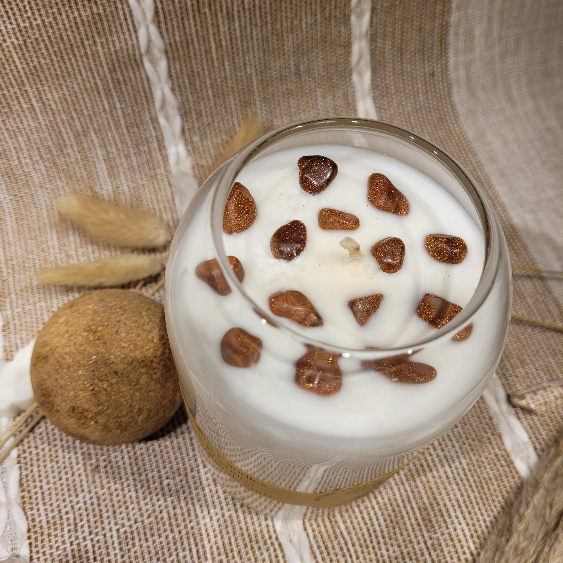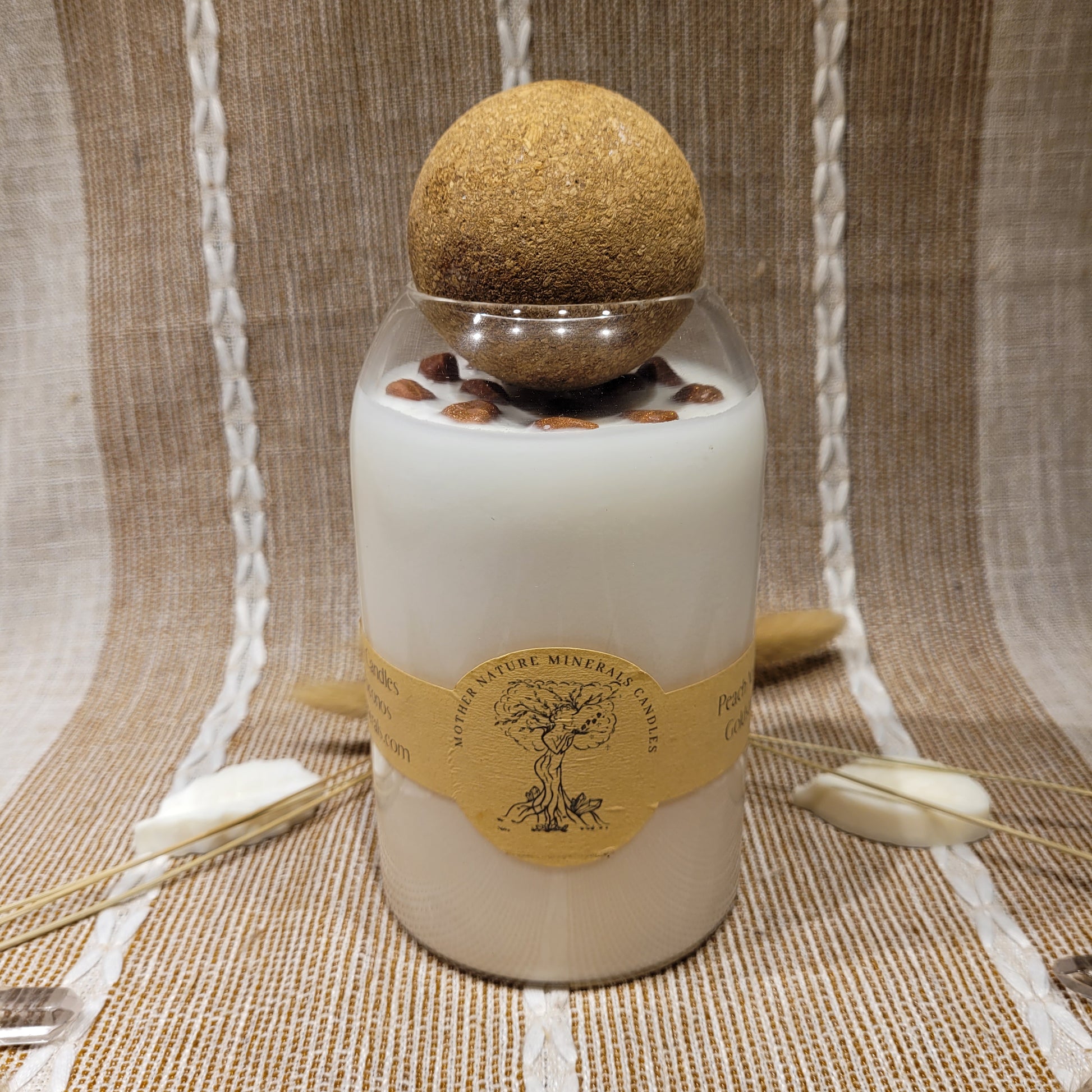 This candle has a lovely Peach Nectar scent and is decorated with Goldstone crystal chips on top!