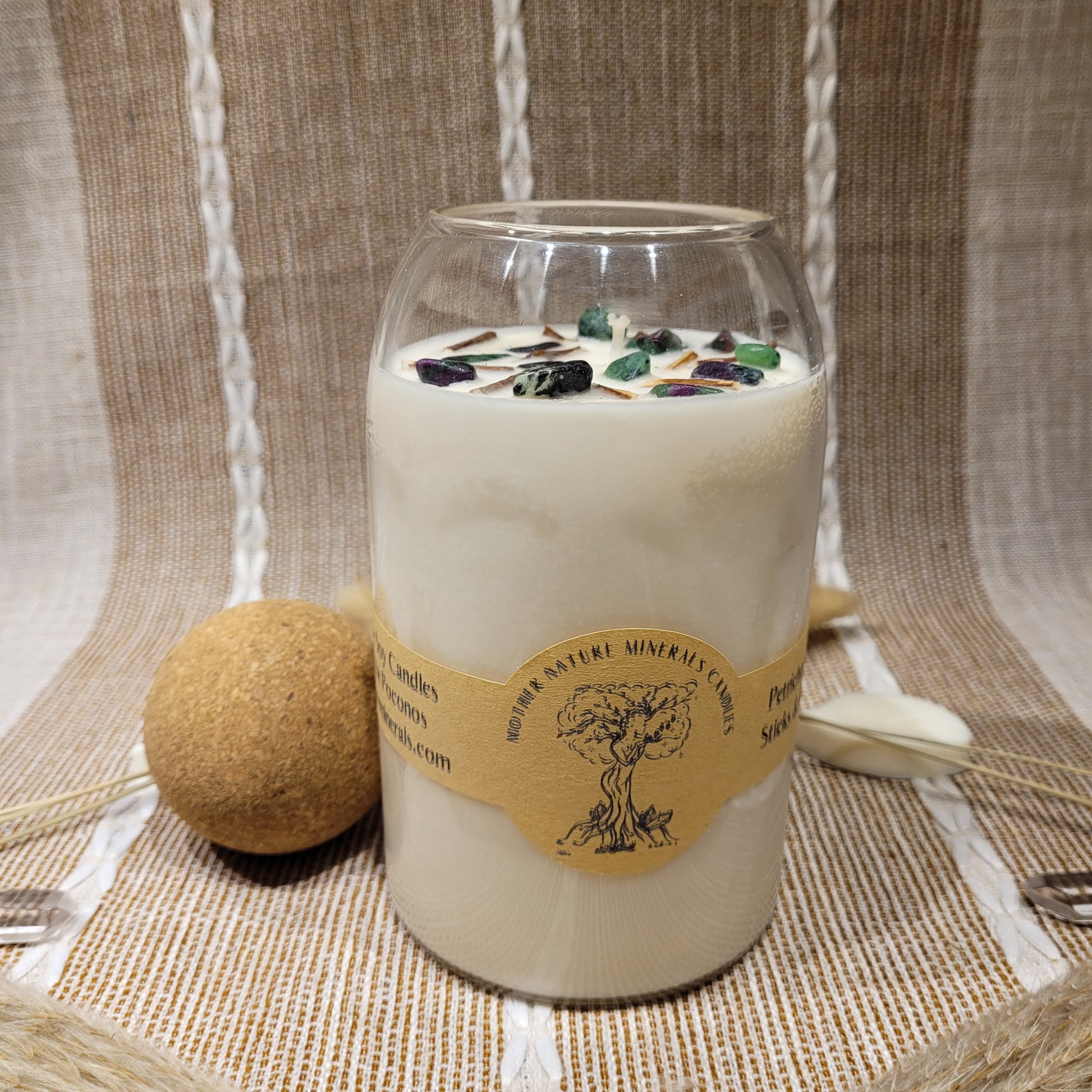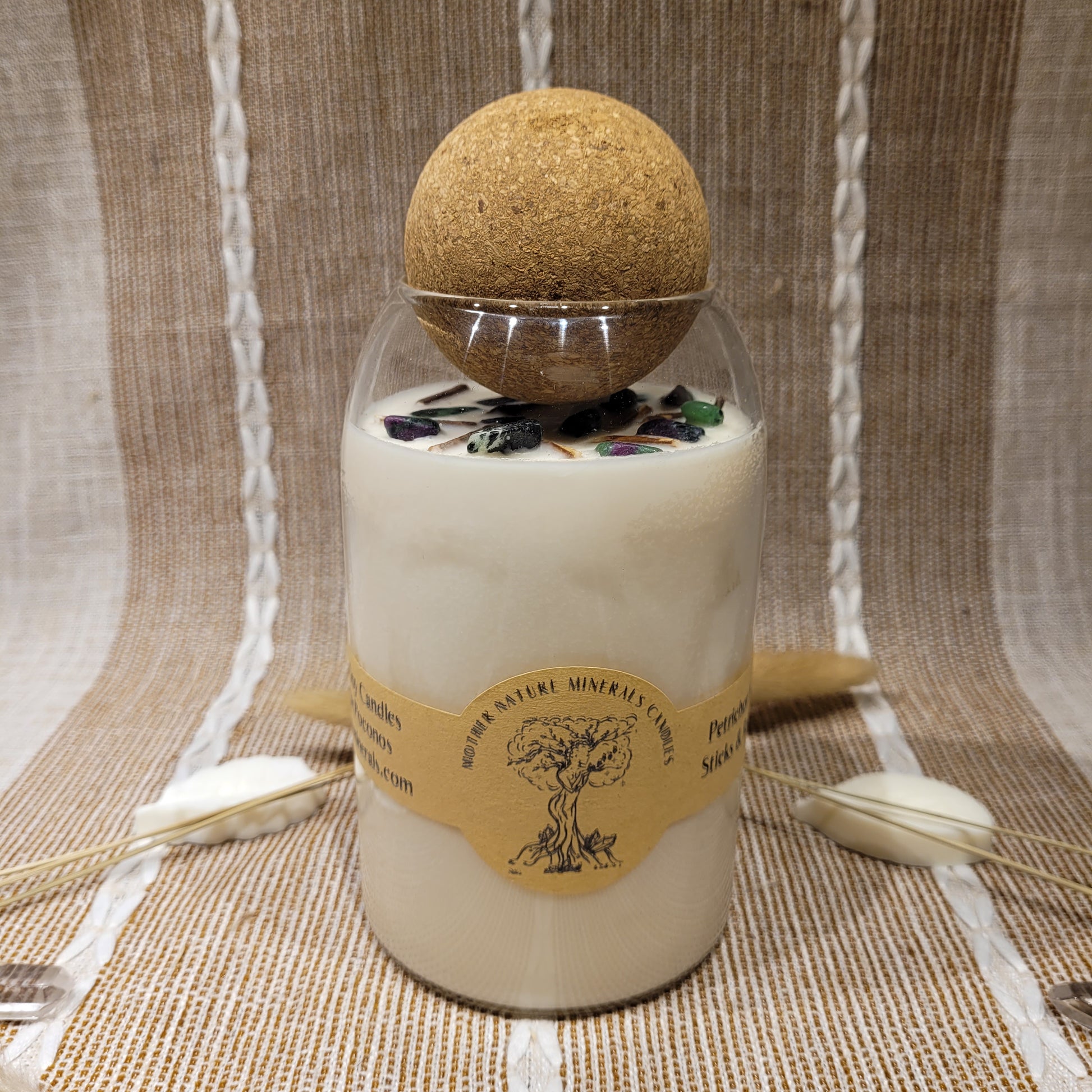 Handmade soy candles created with high-quality clean burning essential oil infused fragrance, 100% cotton wick, lead free borosilicate glass jar, natural cork lid, decorated with organic dried herbs and ethically sourced crystals in a 25 oz jar. Plus there is a hidden crystal on the bottom!