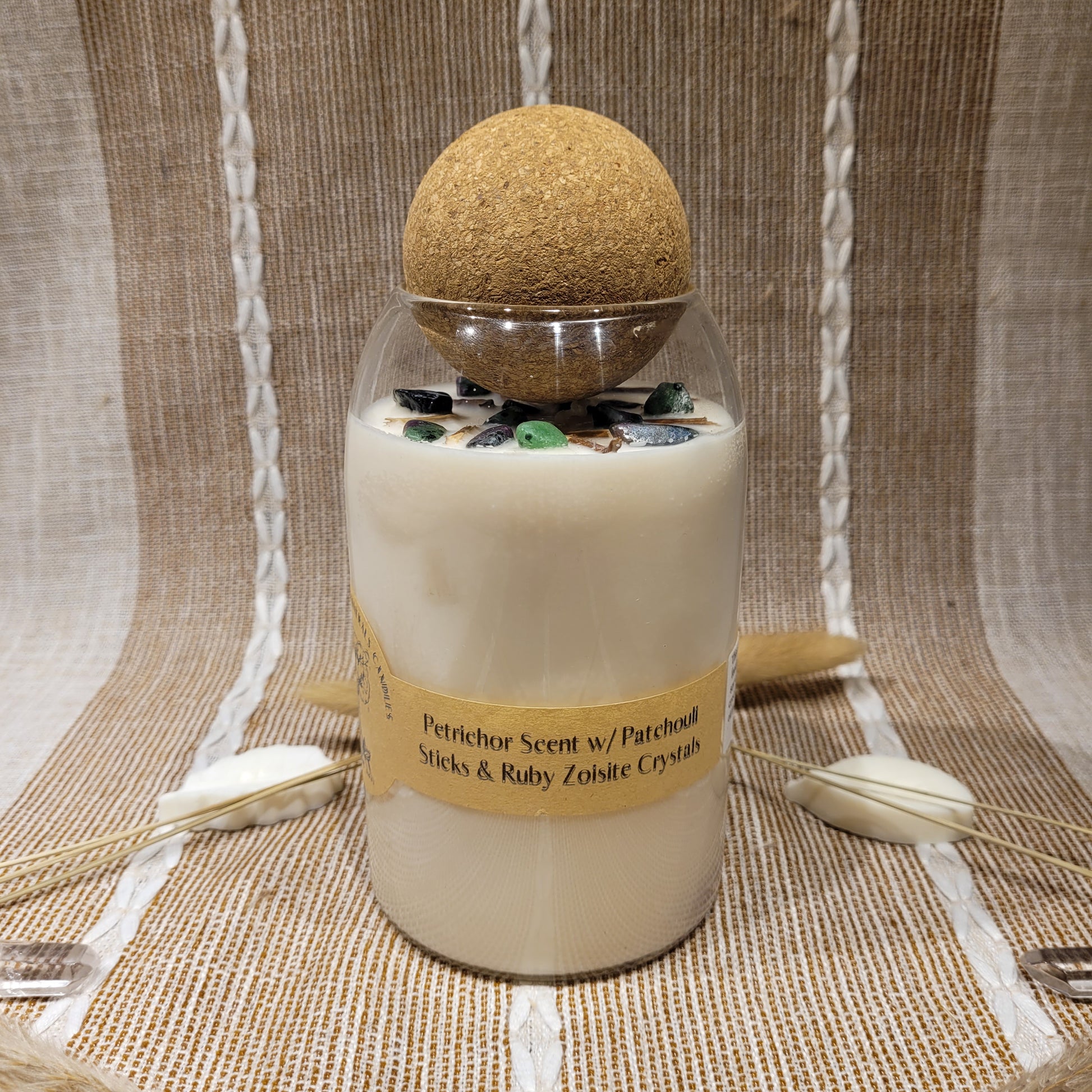 This candle has a lovely Petrichor scent and is decorated with patchouli sticks and Ruby Zoisite crystals top!